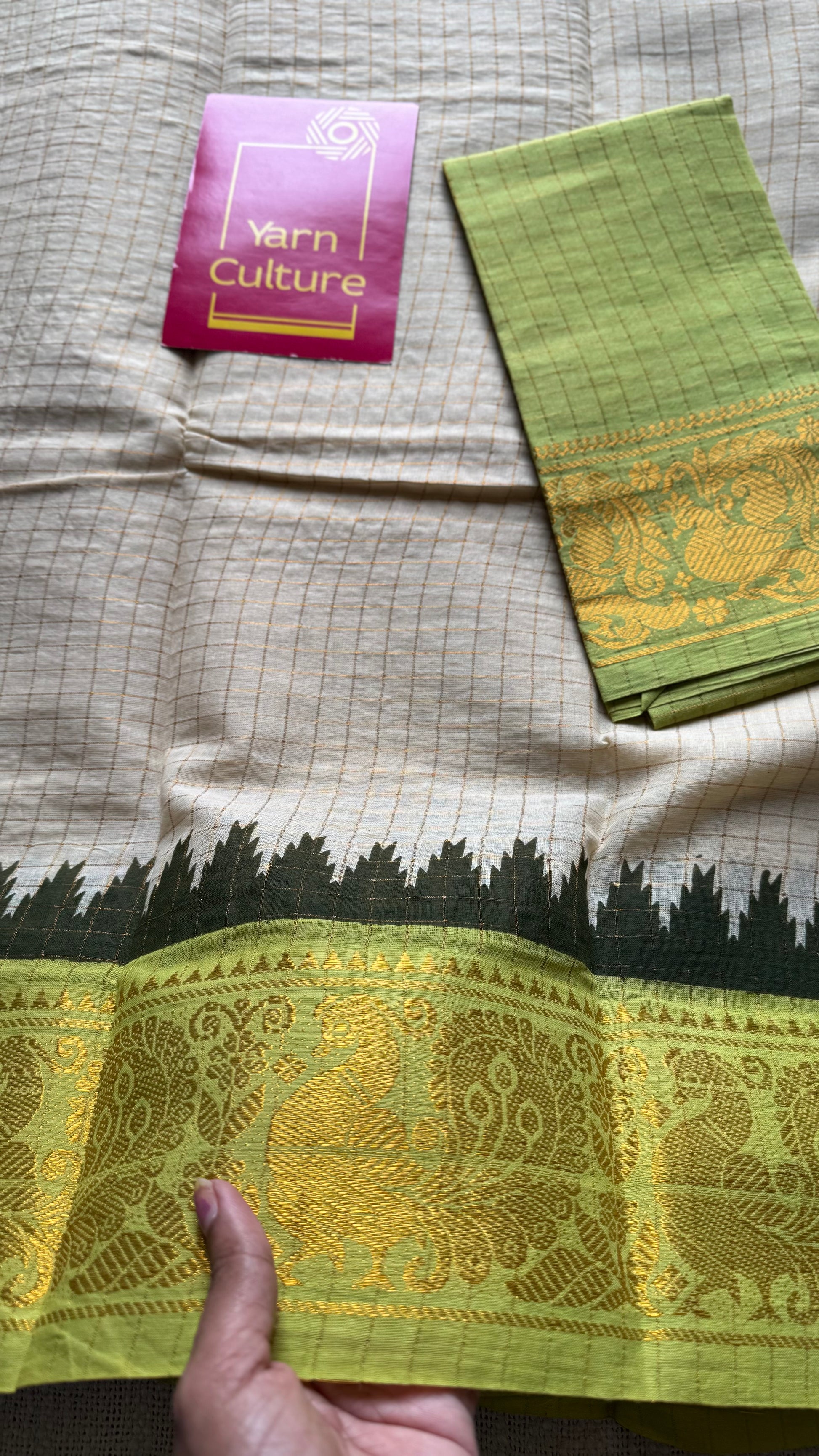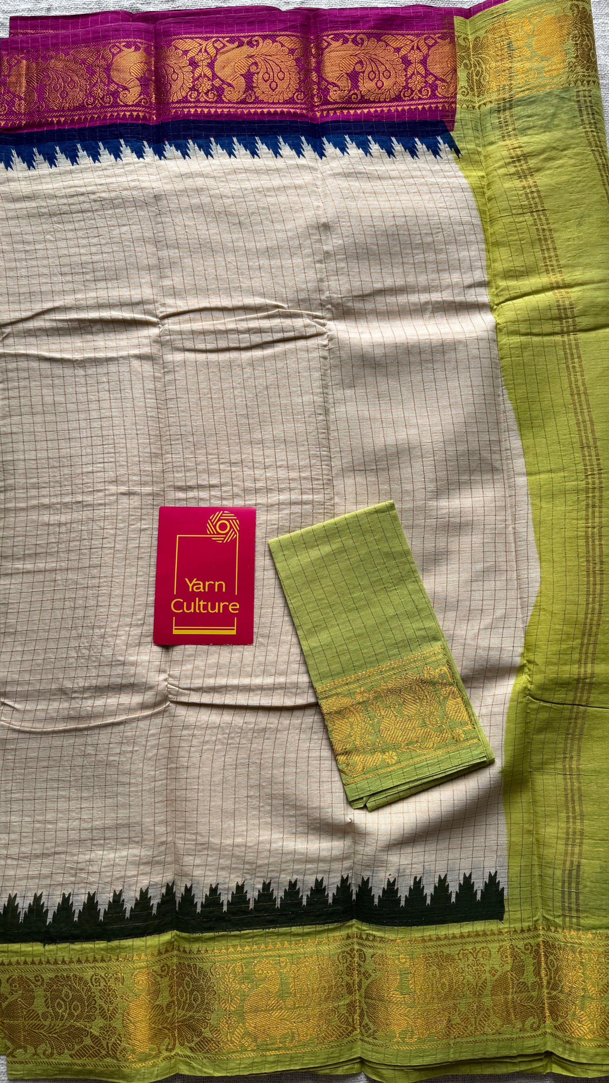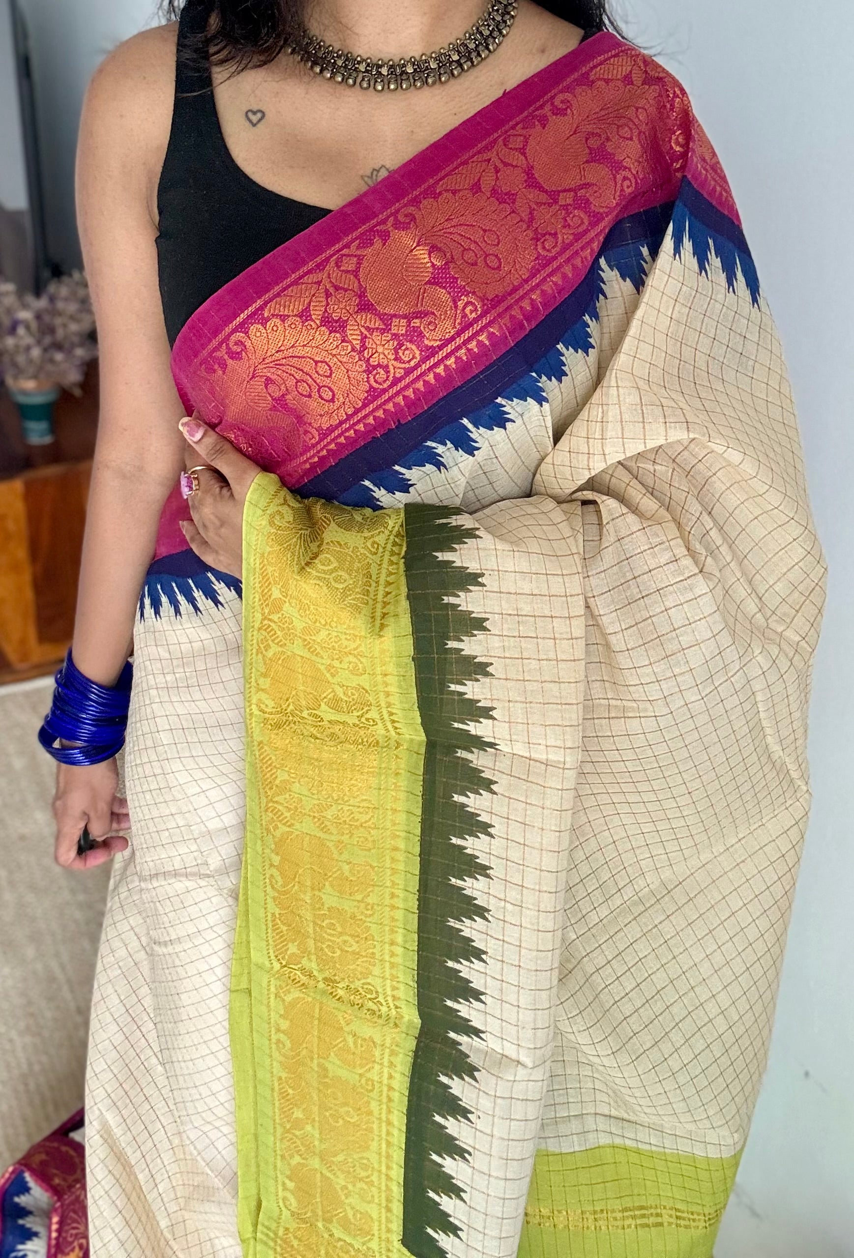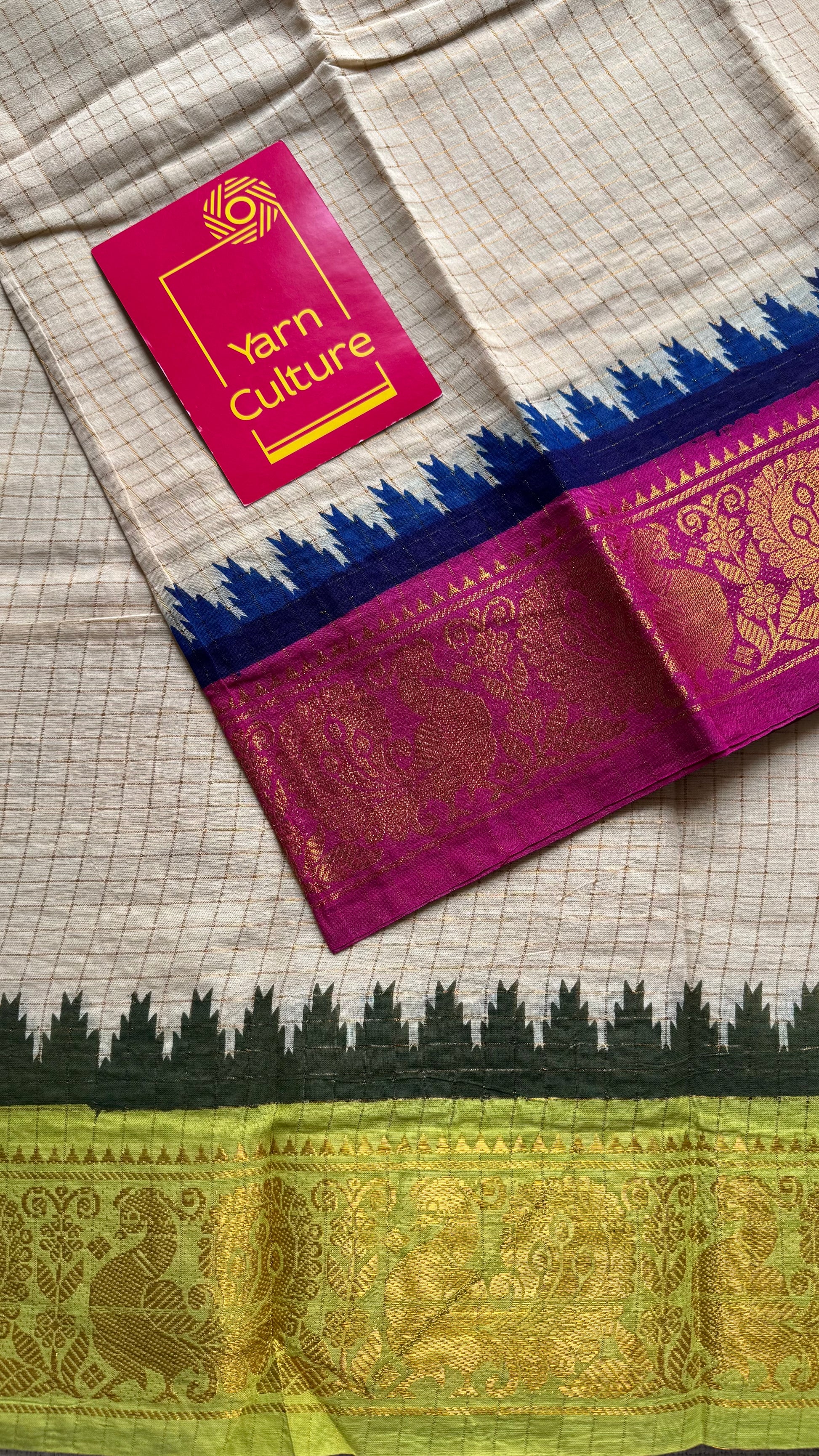 Soft Madurai Sungudi cotton with classic kattam checks and a striking dual border - magenta on one side and bright green on the other, with peacock motifs. Body is sandal shade not off white.