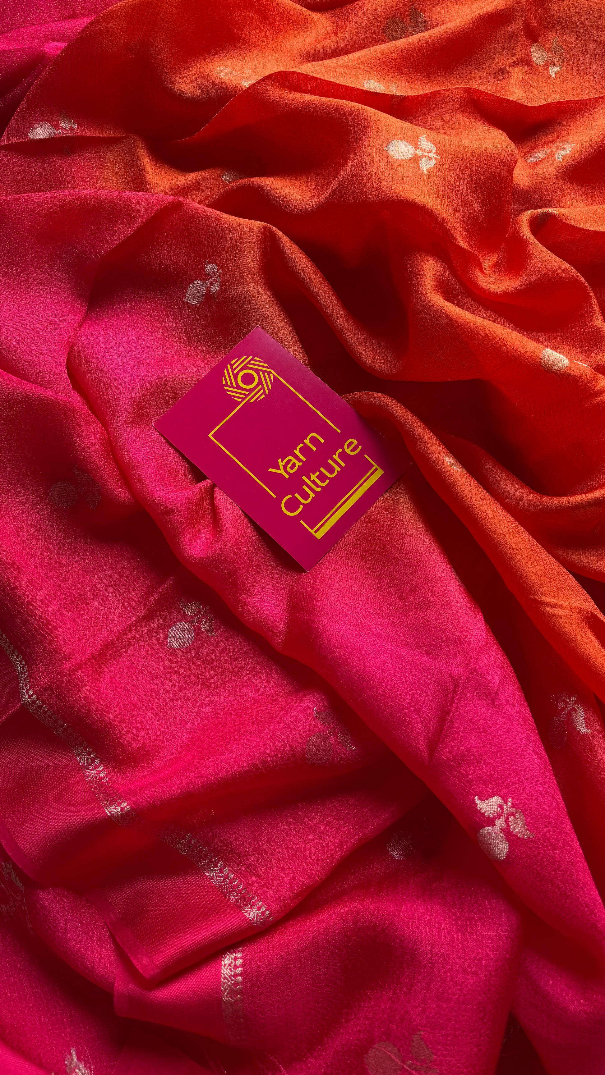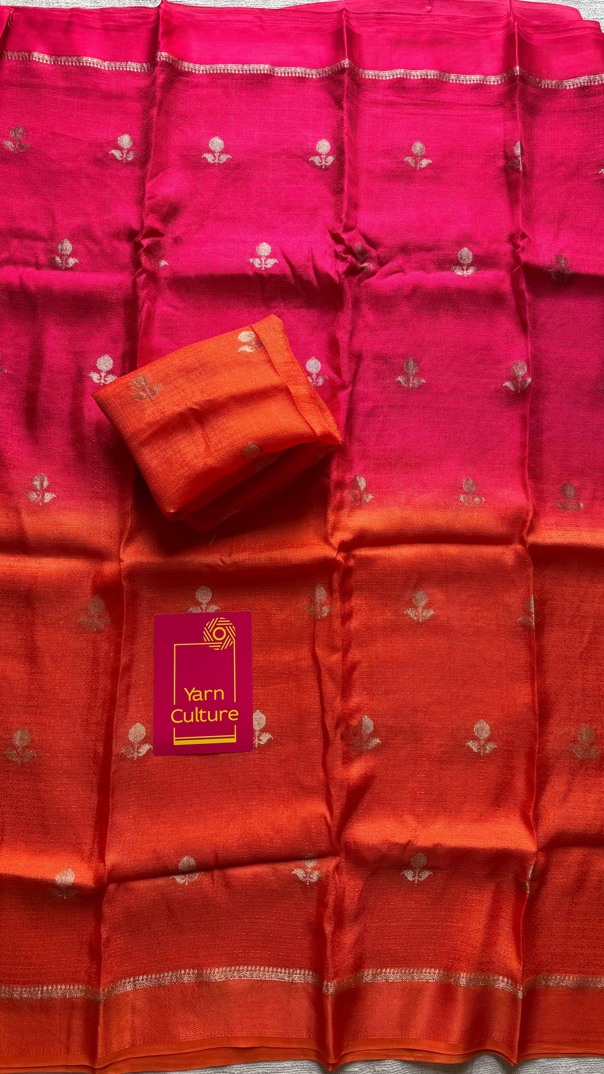 Magenta orange dual tone in half-half pattern, in viscose soft silk with satin border, jacquard zari motifs in gold. Comes with an orange blouse fabric of 0.8m.