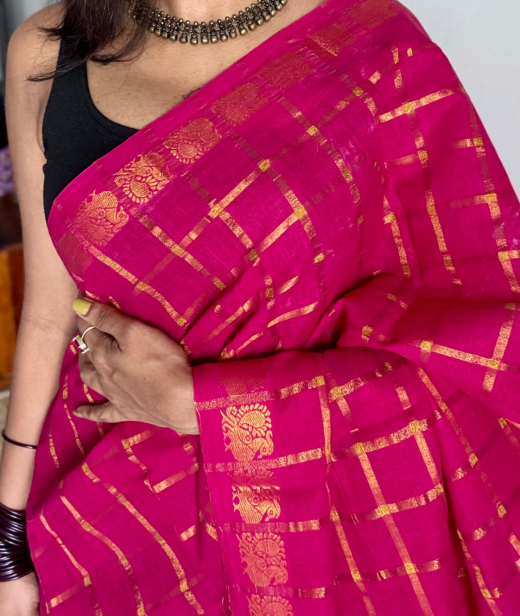 Magenta pink Madurai cotton saree featuring pavithra kattam checks, dyed using the traditional Kattuchayam technique. Comes with running blouse fabric.