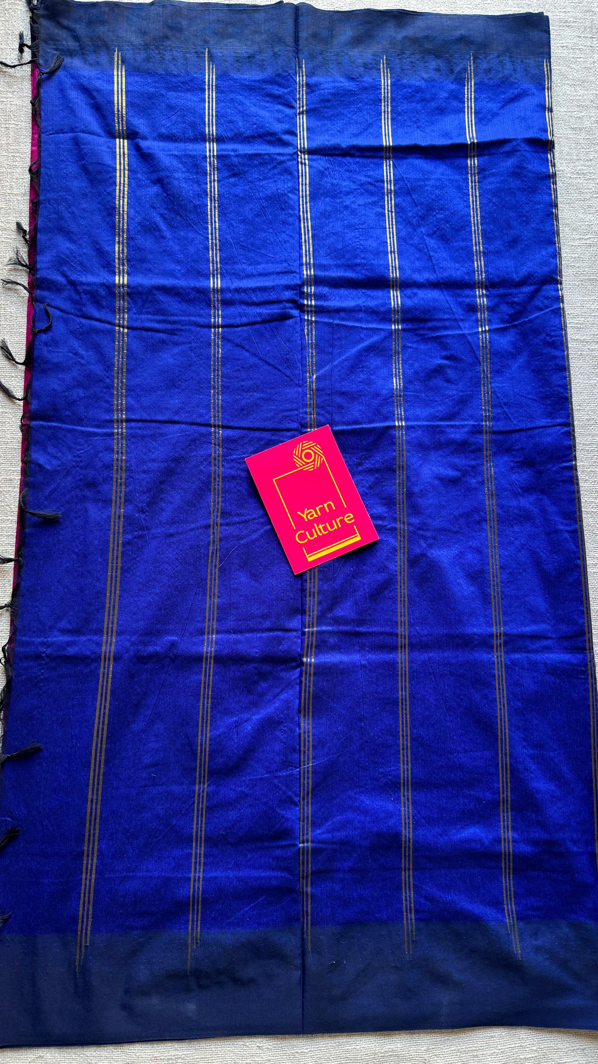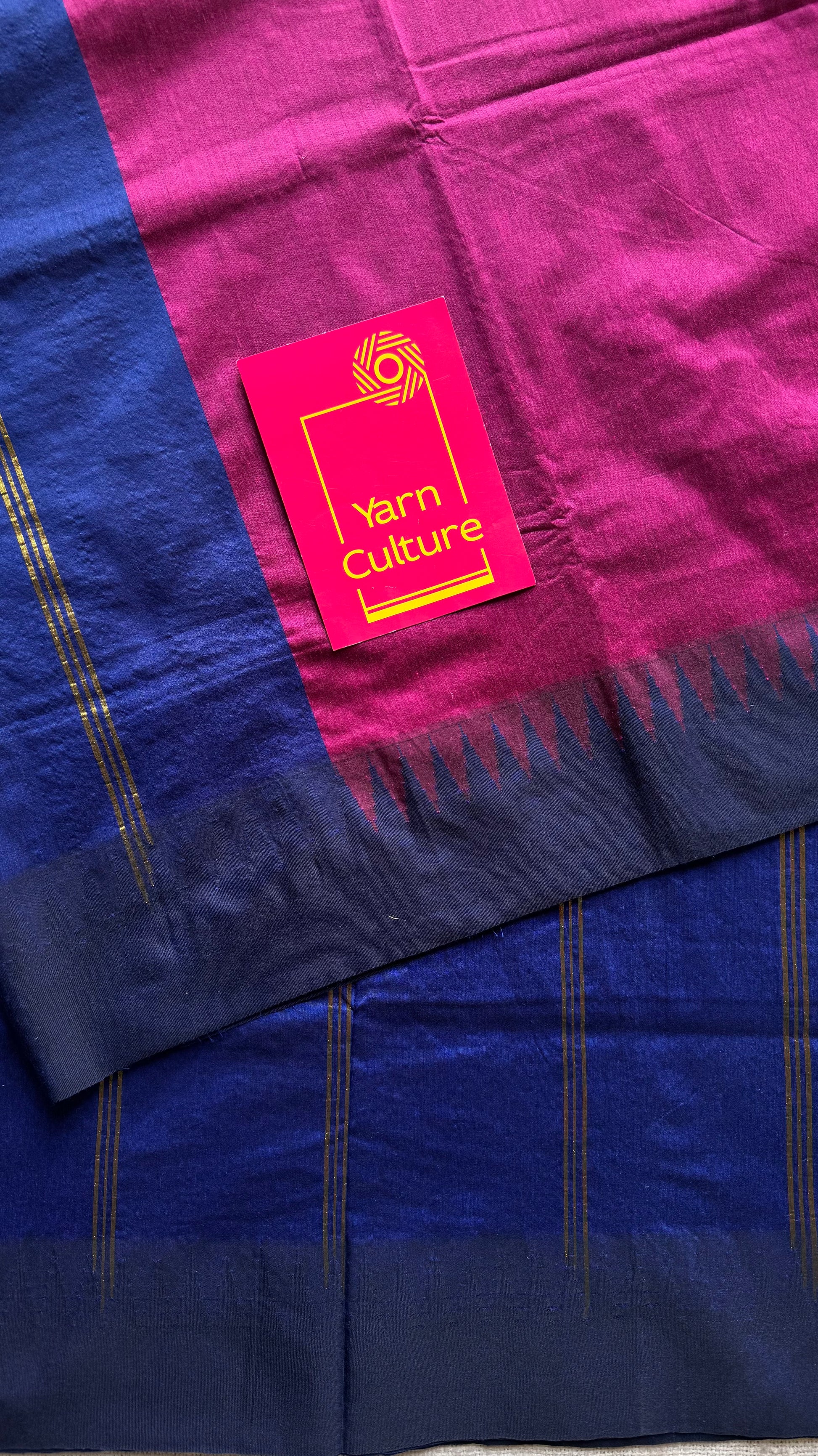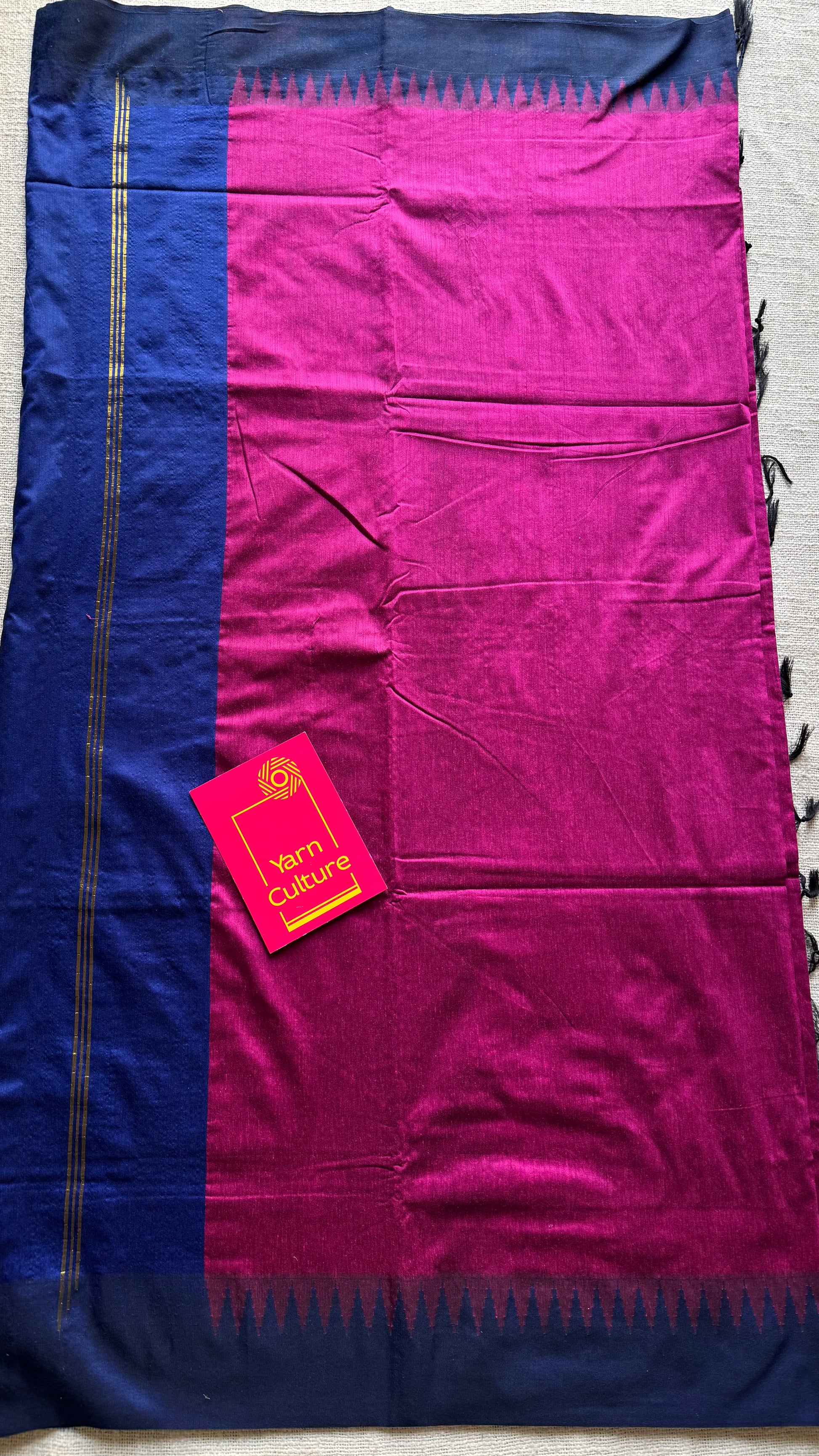 Magenta with blue contrast, temple border saree, cotton silk - YCCOTNTBFE62