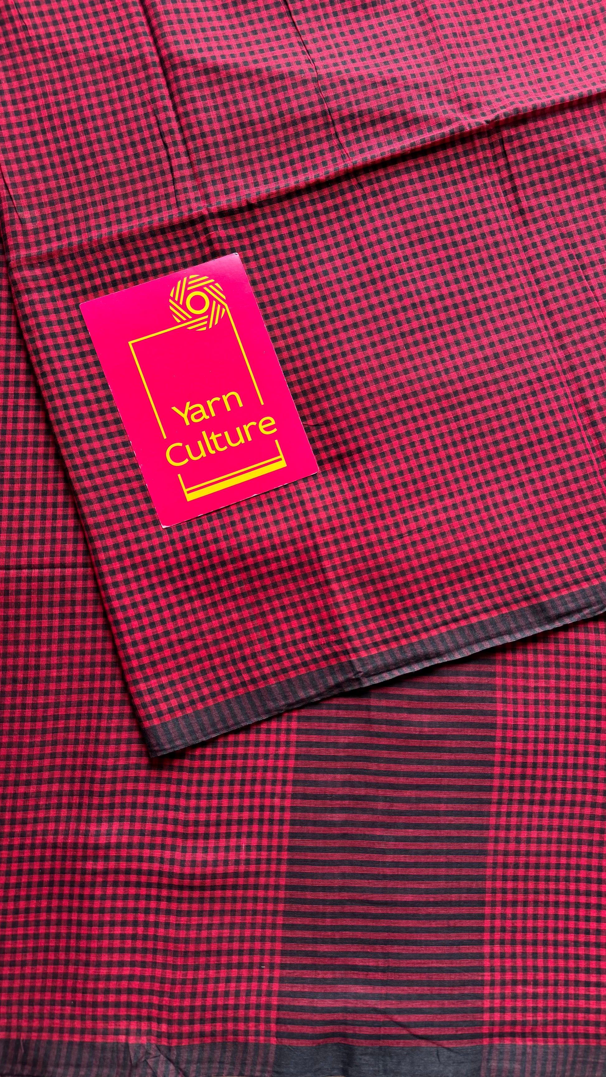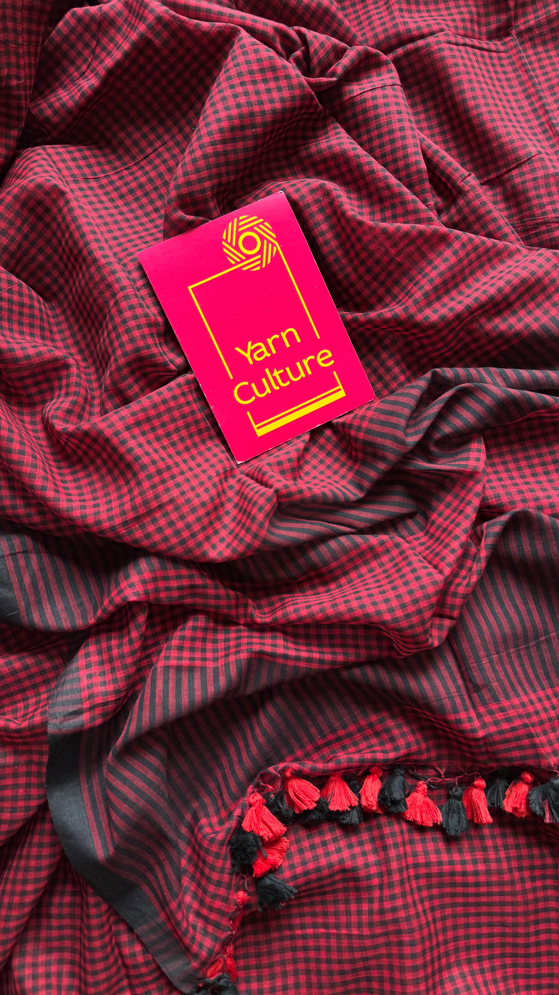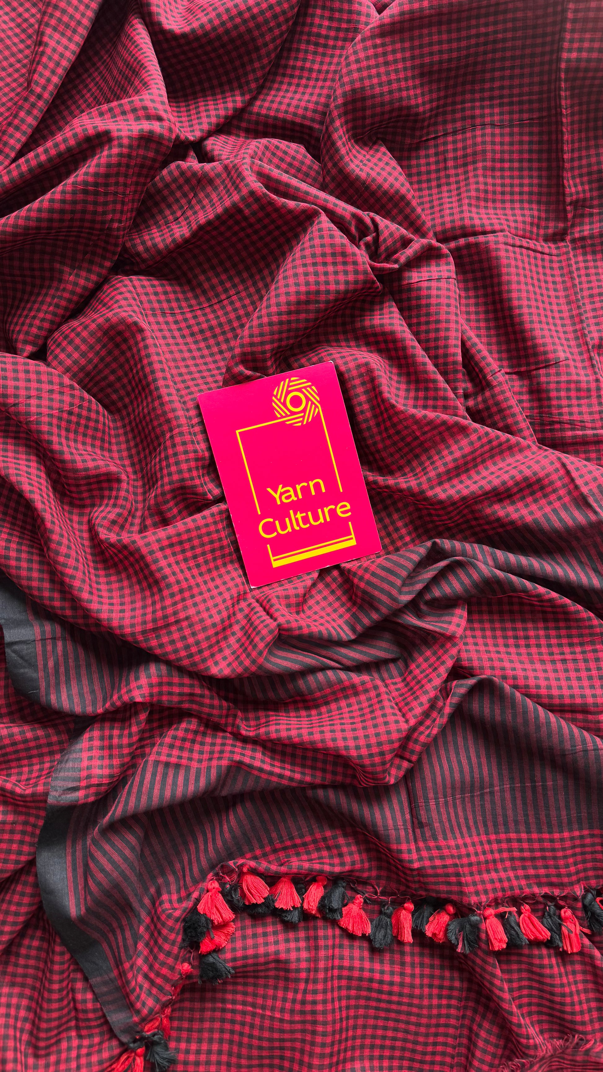 Everybody's favourite mul cotton in maroon and black micro checks, with tassels.
