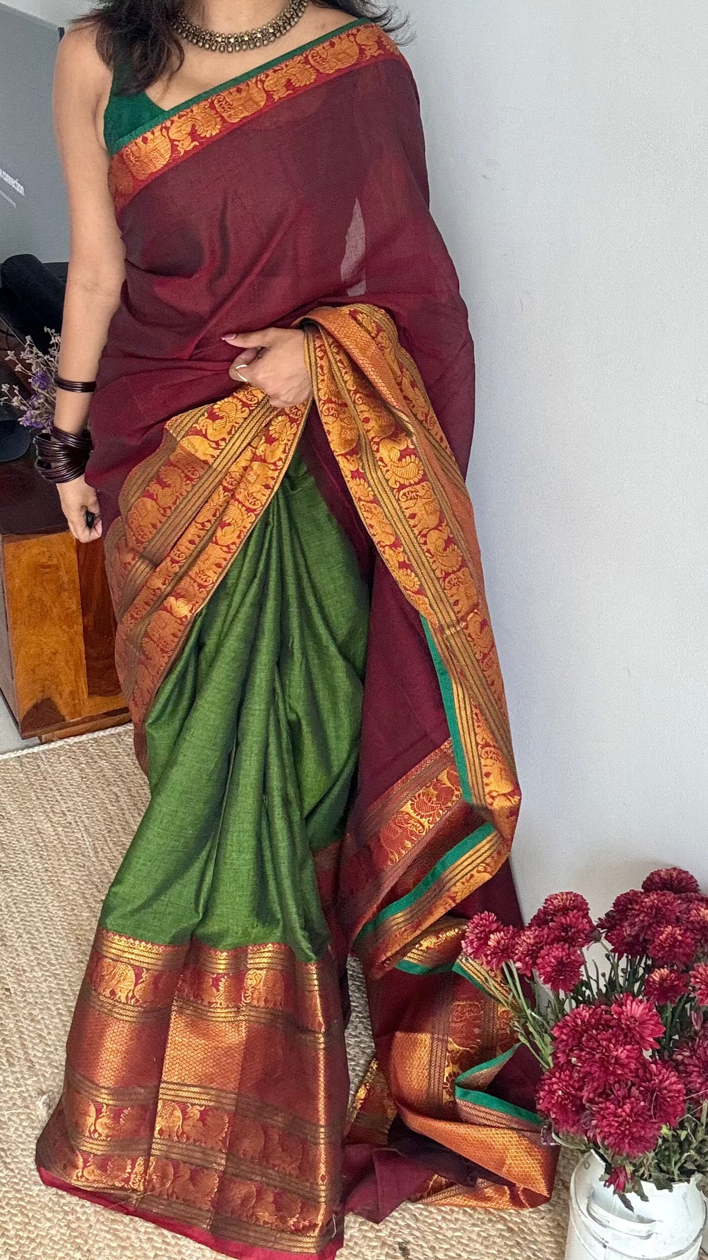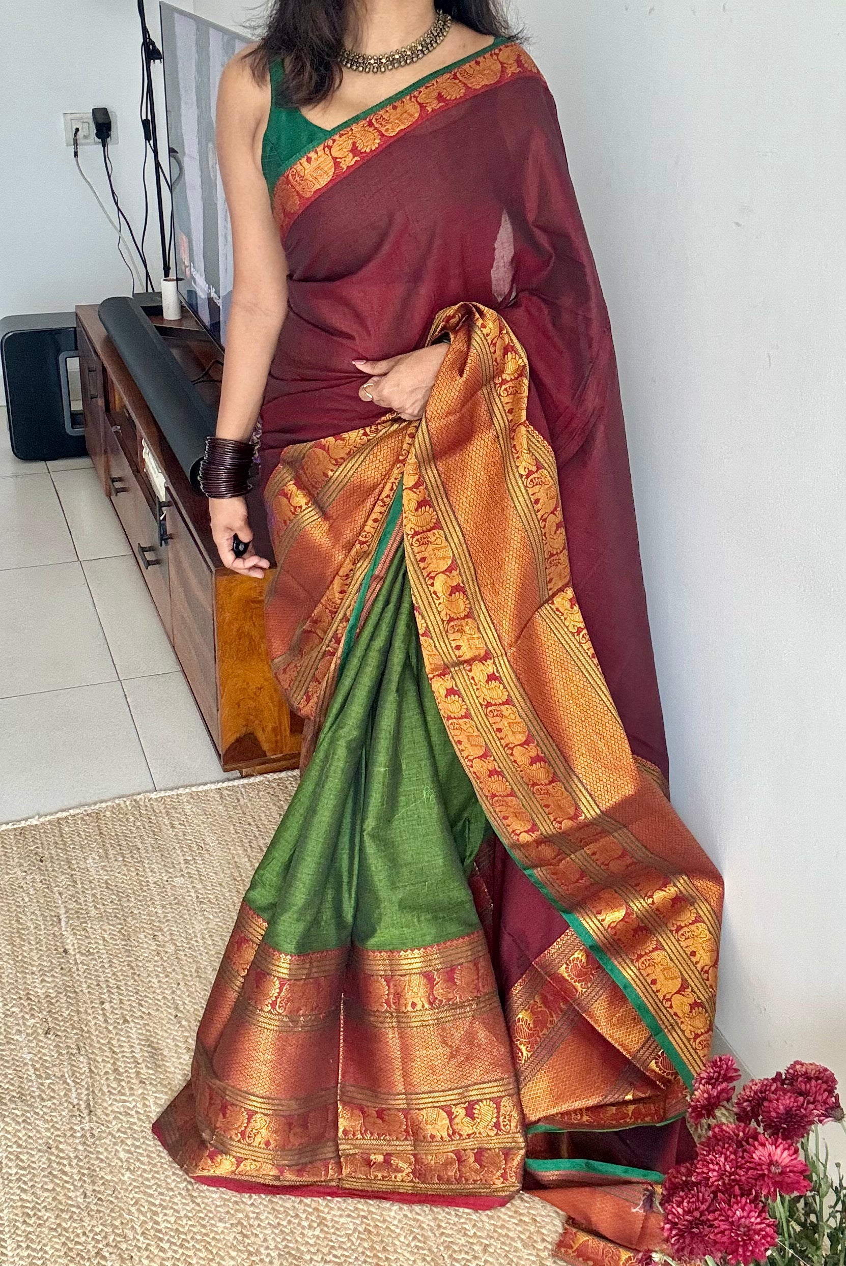 Maroon - Green Narayanpet half saree (dhavani), unstitched material, soft cotton - YCAHSN09