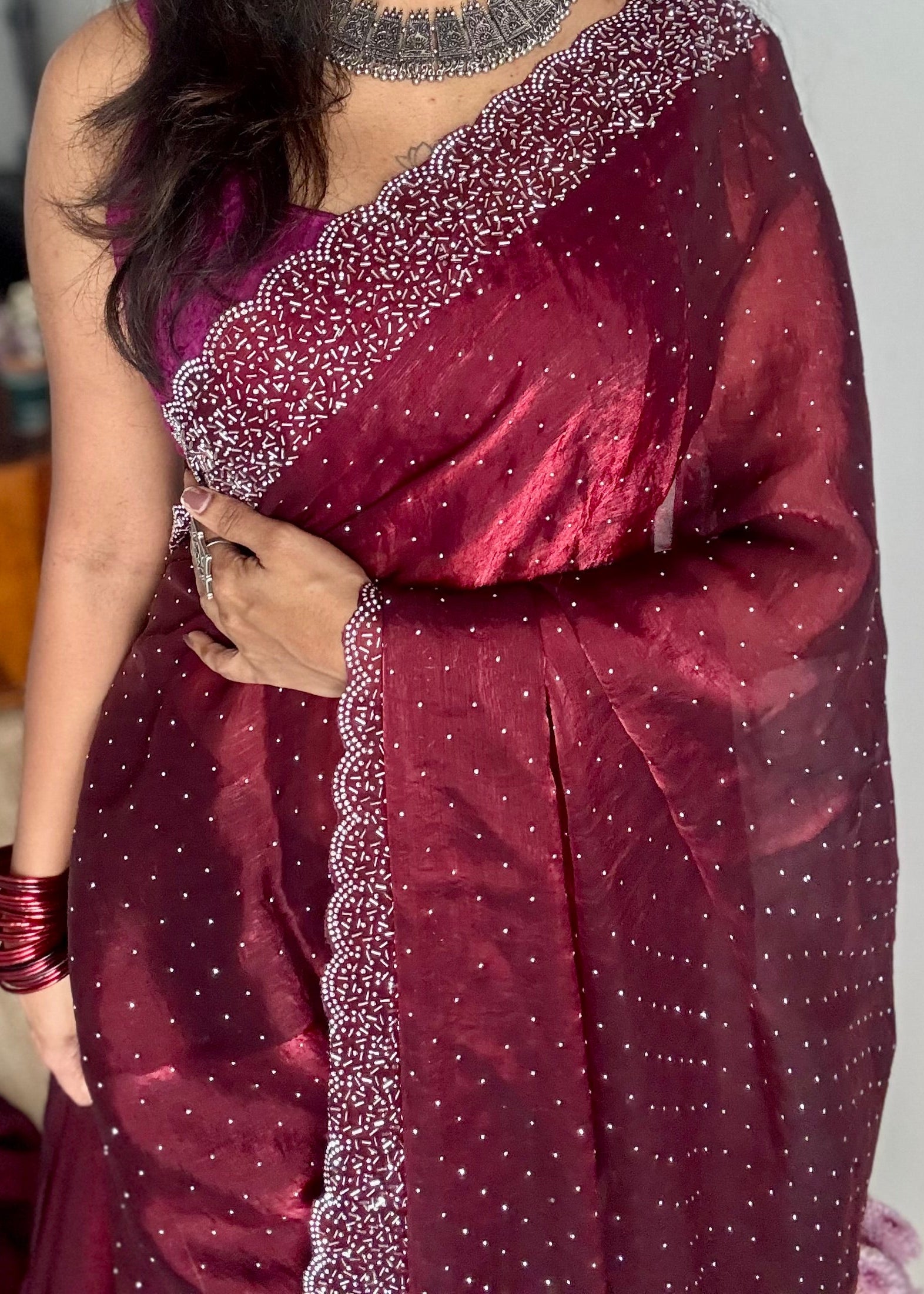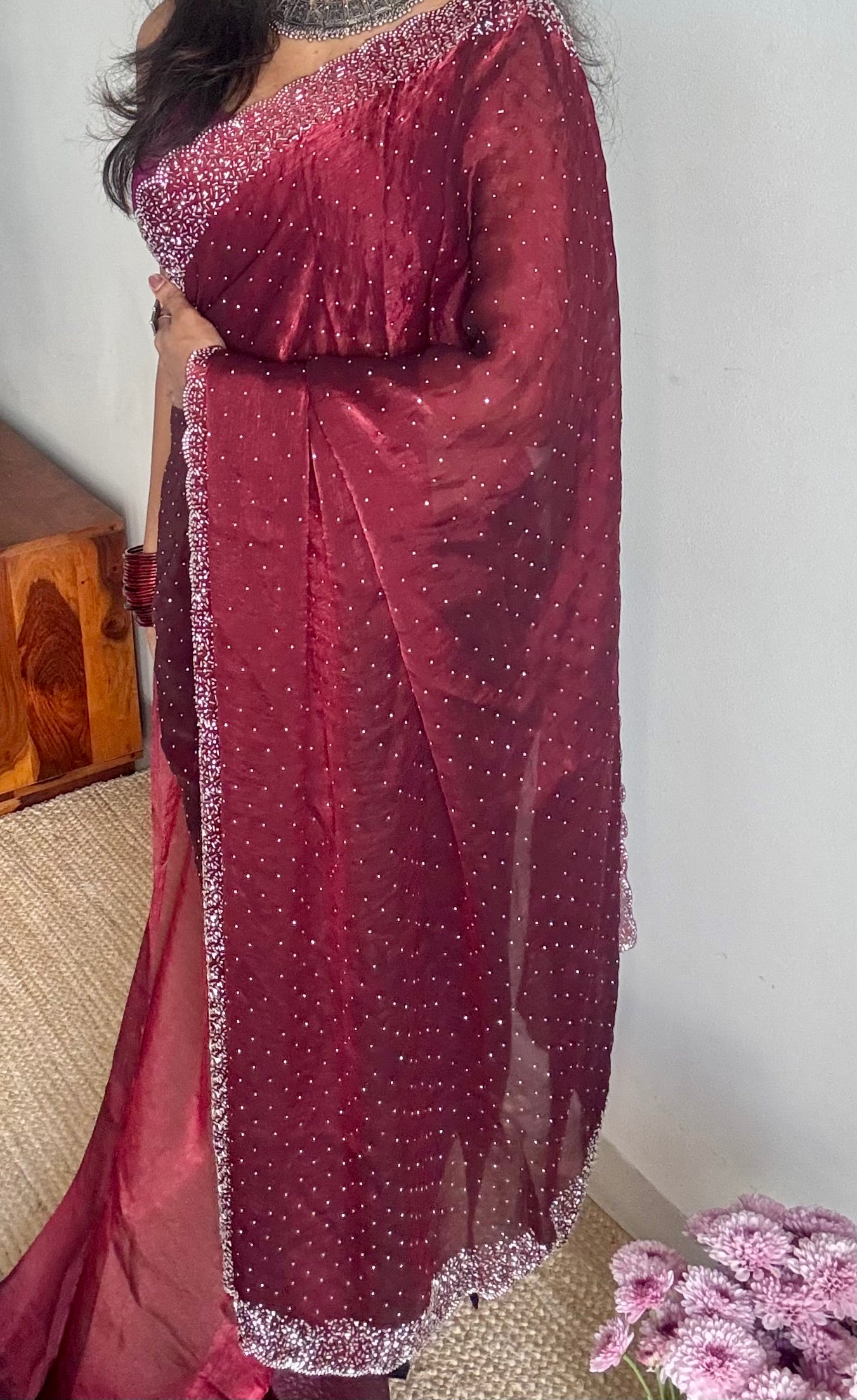 A rich maroon saree with a glossy finish, bold, festive, and full of playful charm, a colour that truly looks delicious.