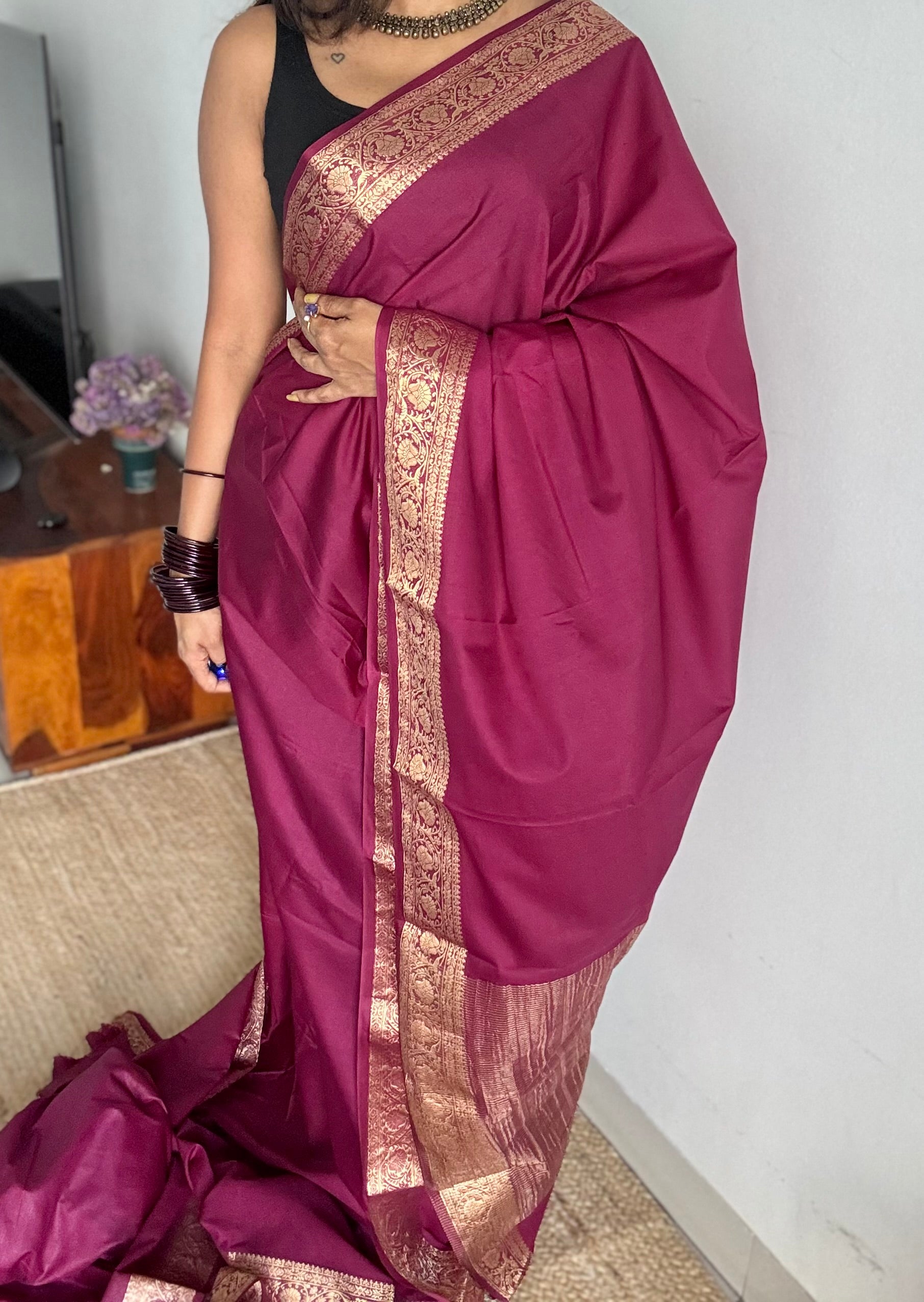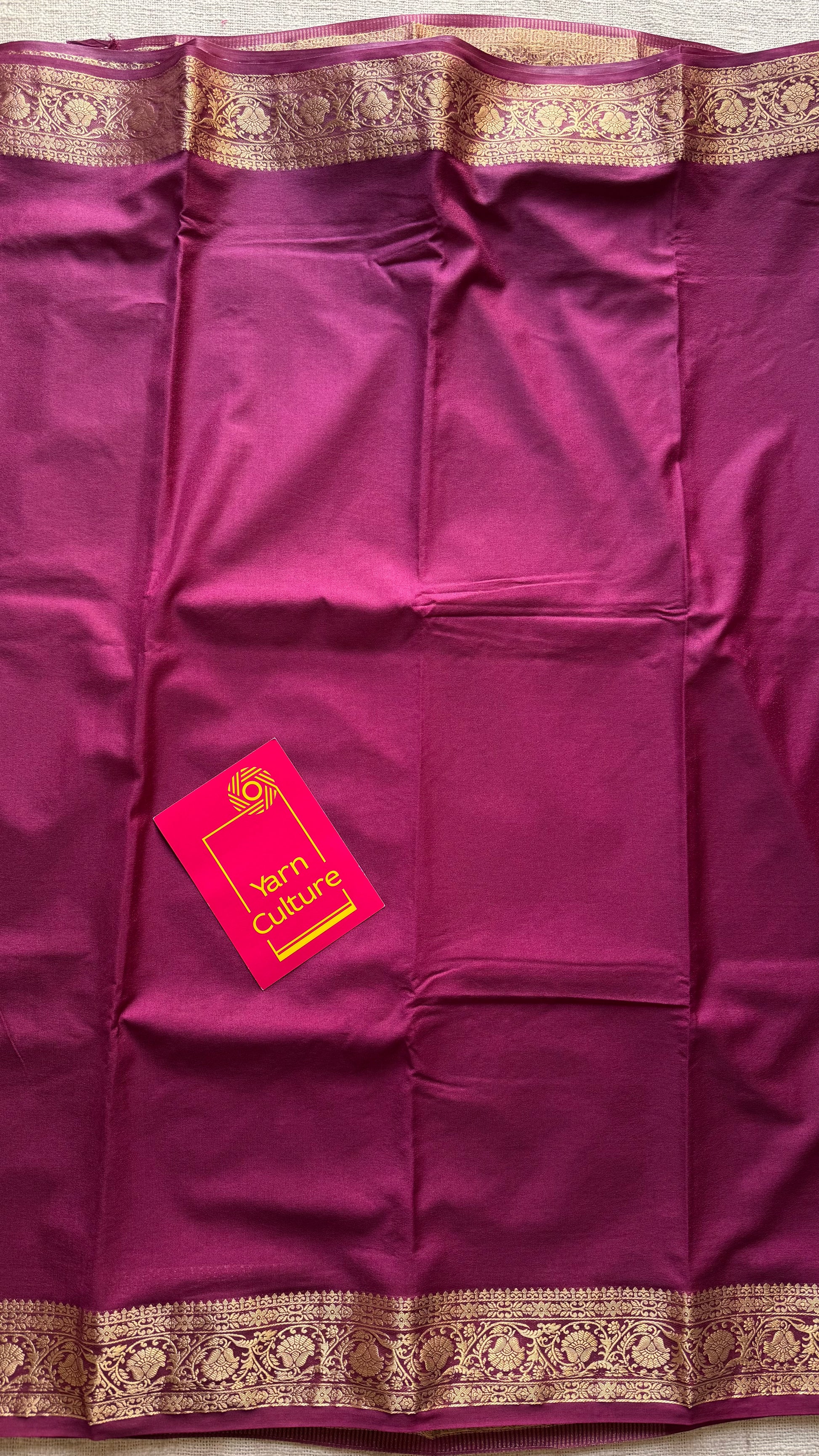 A rich maroon Mysore semi crepe silk saree featuring elegant floral zari borders and a rich zari pallu. Lightweight, soft, and easy to drape, it is perfect for festive occasions, formal gatherings, and refined everyday elegance.