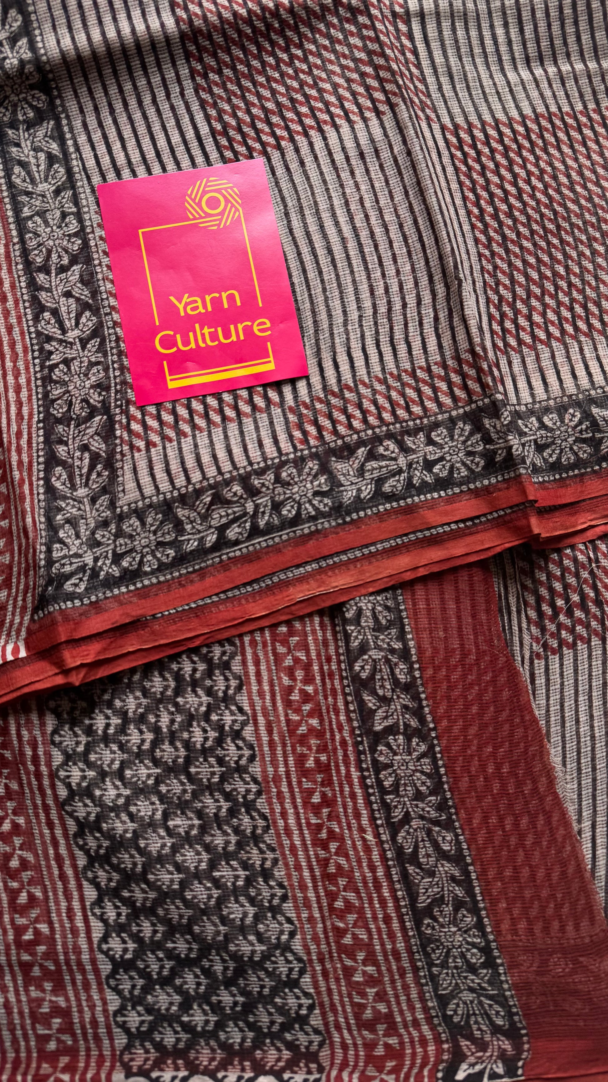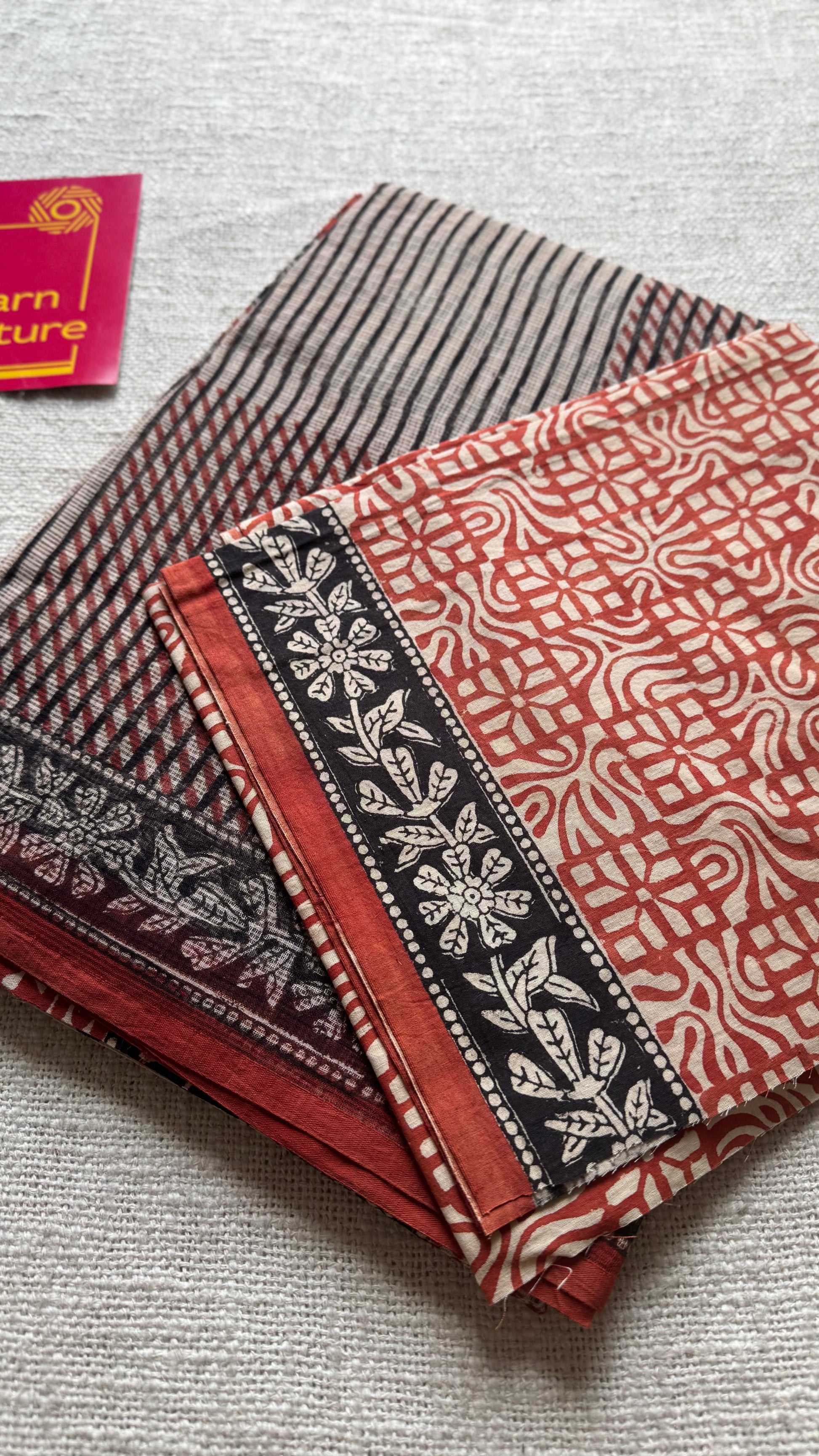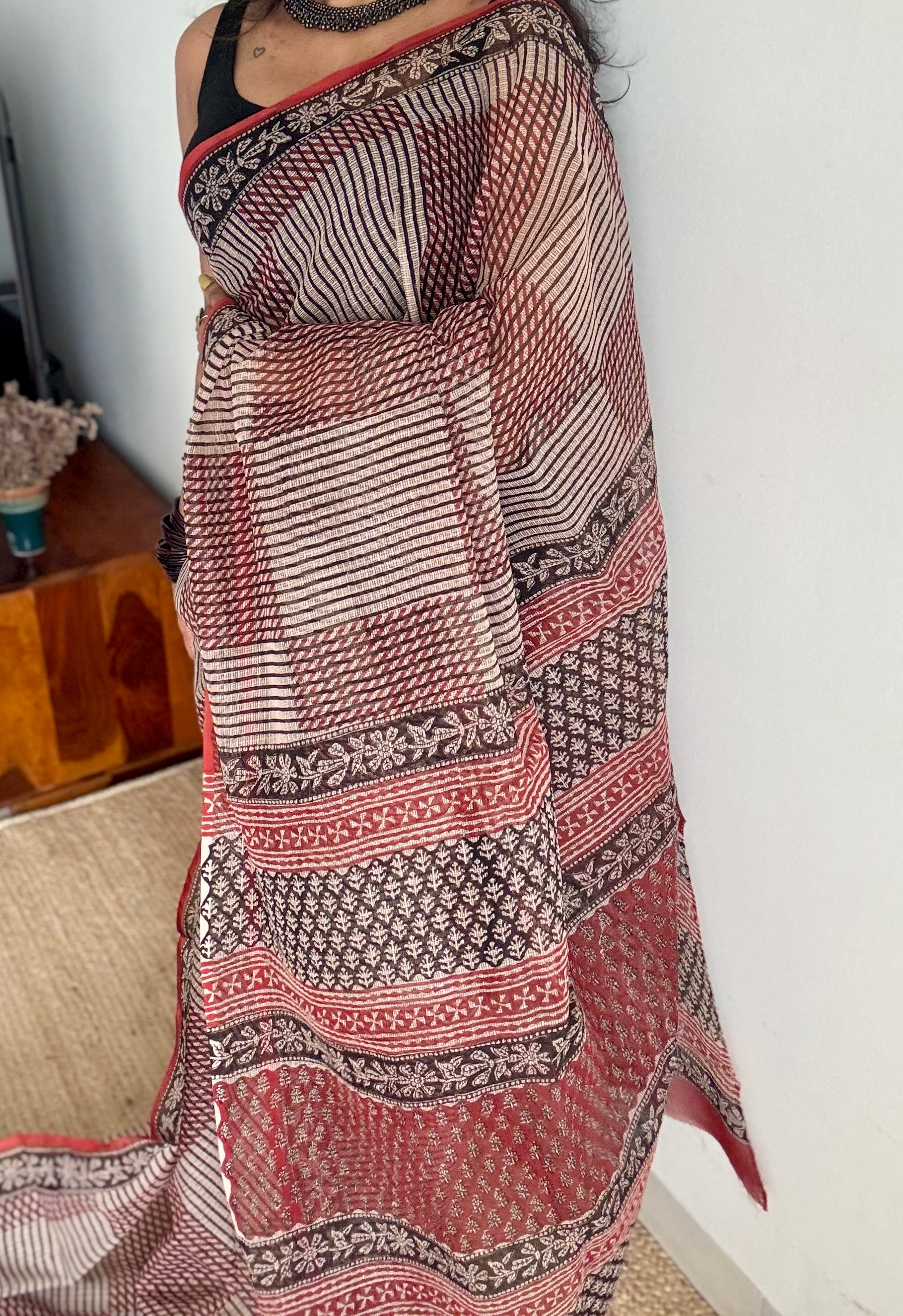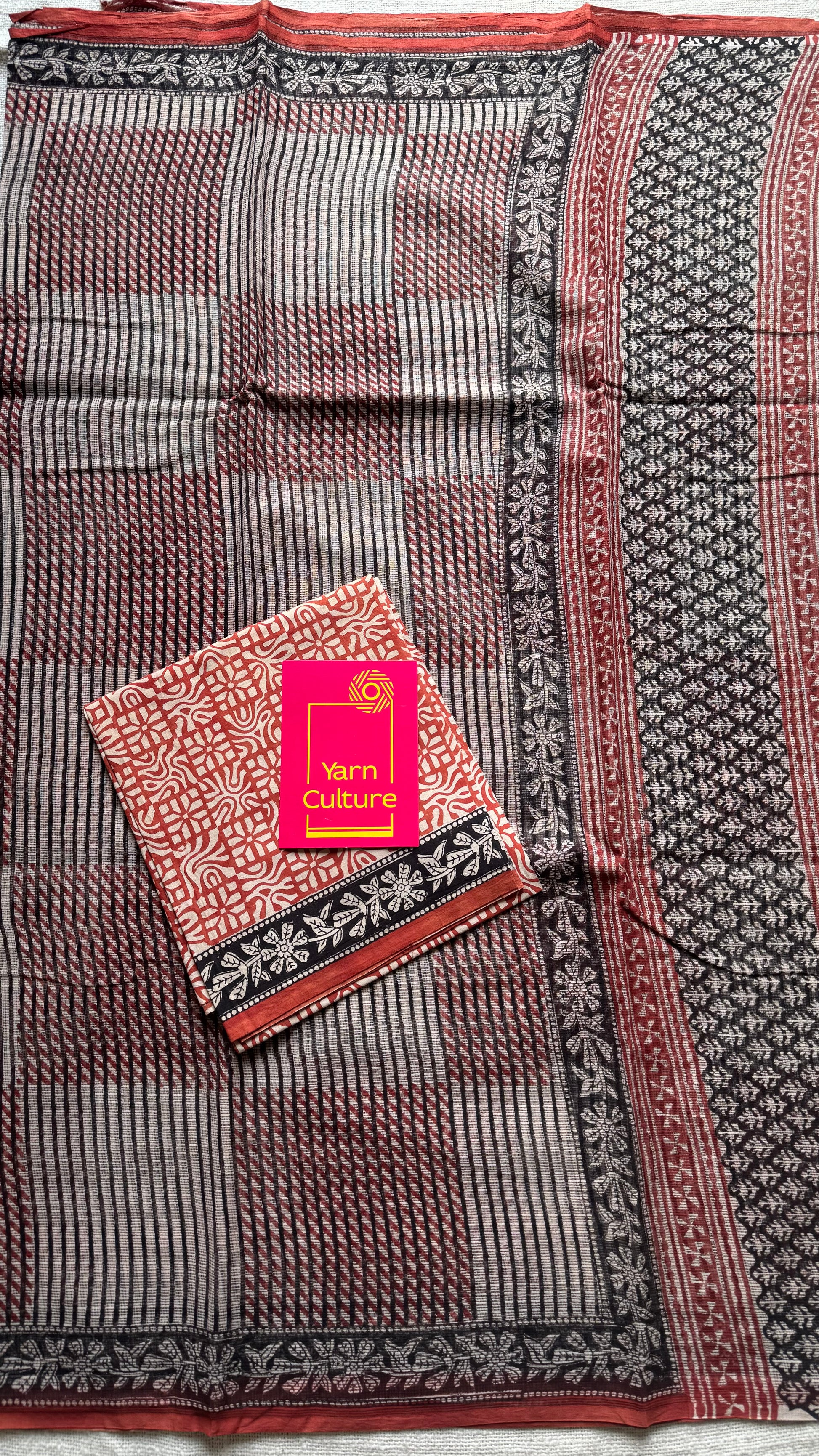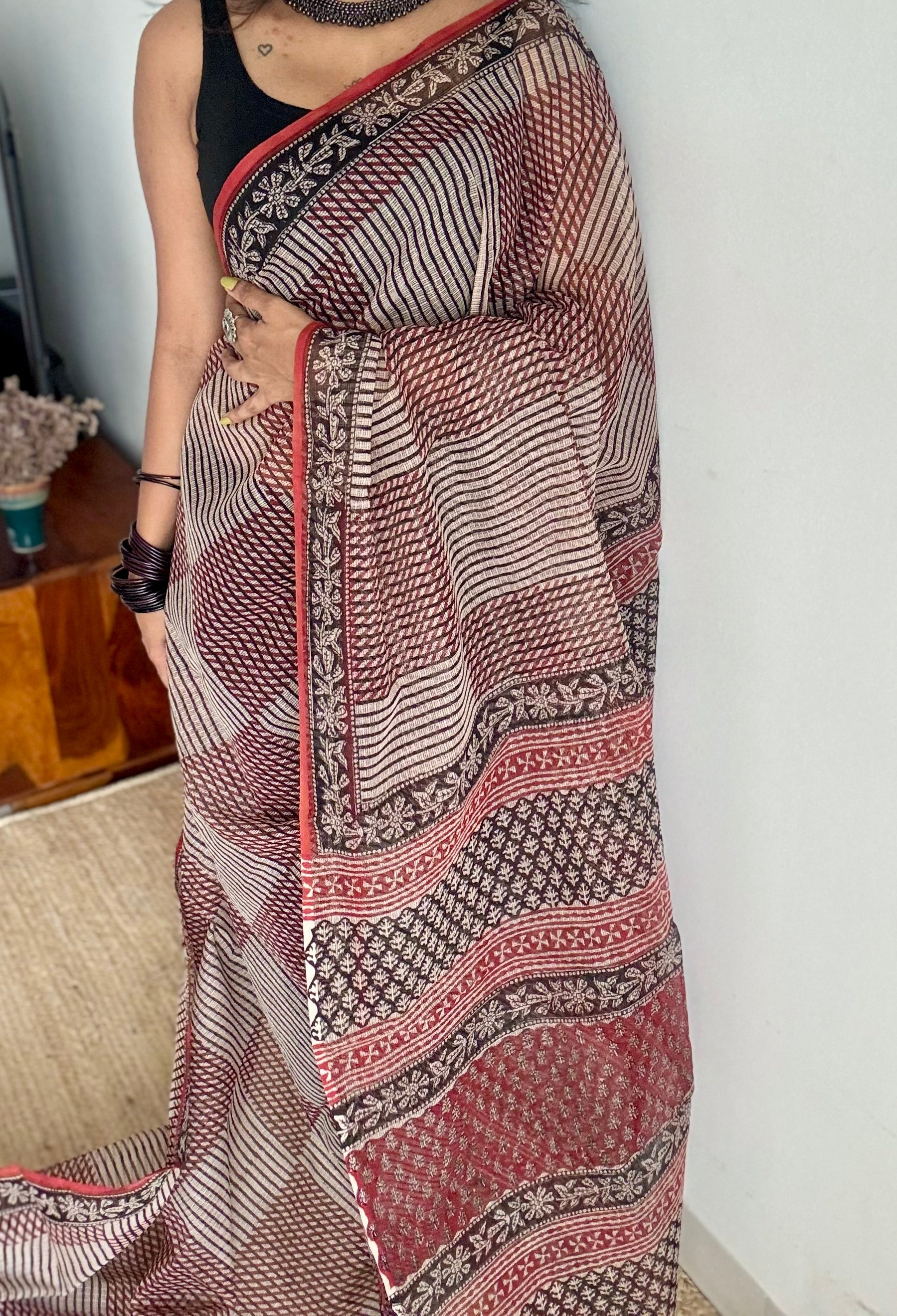 Maroon, black, and beige come together in geometric harmony, while floral borders trace the edges like soft music around structure. Lightweight, rooted, and refined, Mehfil is where tradition meets rhythm, just like every timeless gathering in Rajasthan.