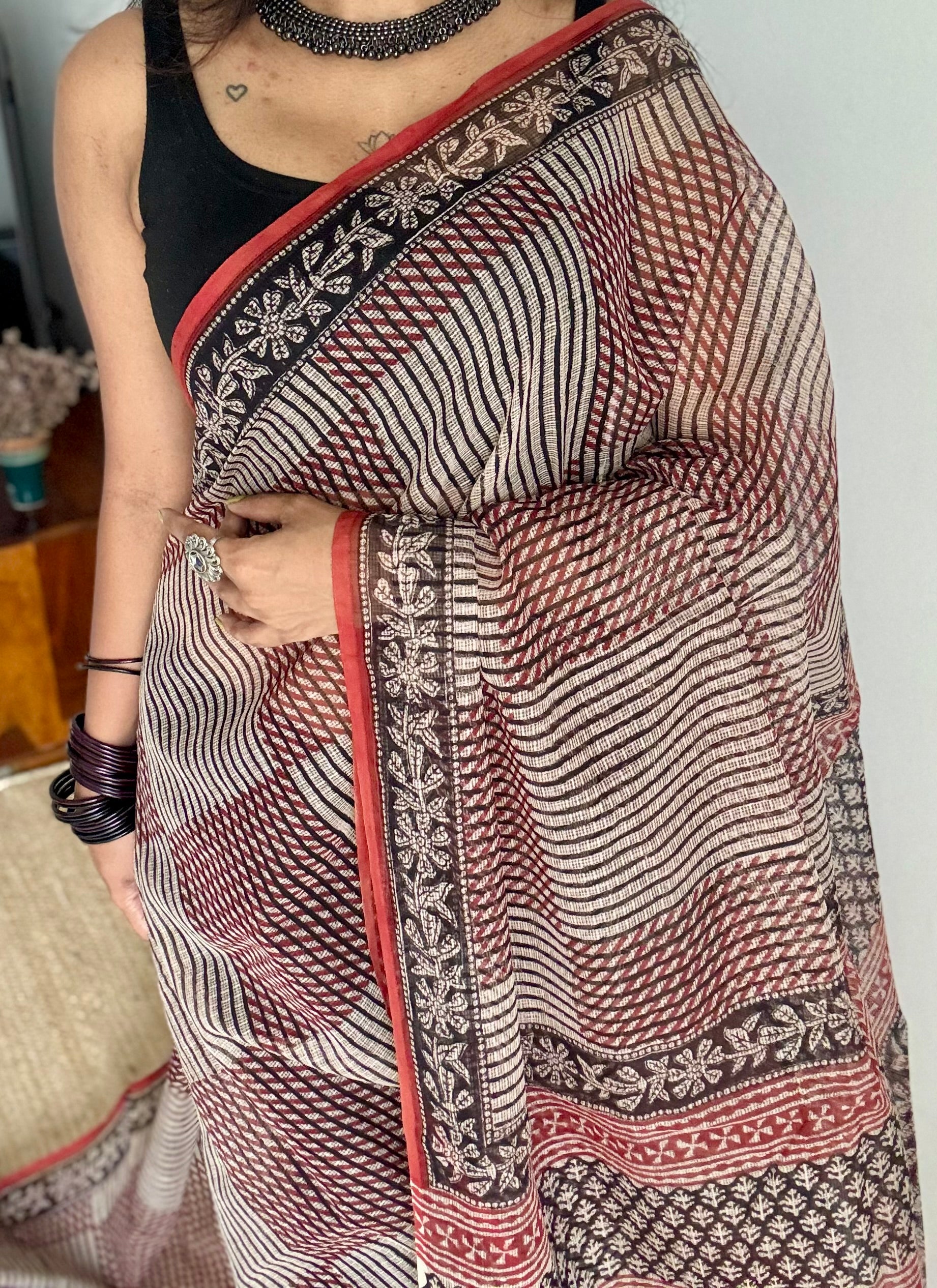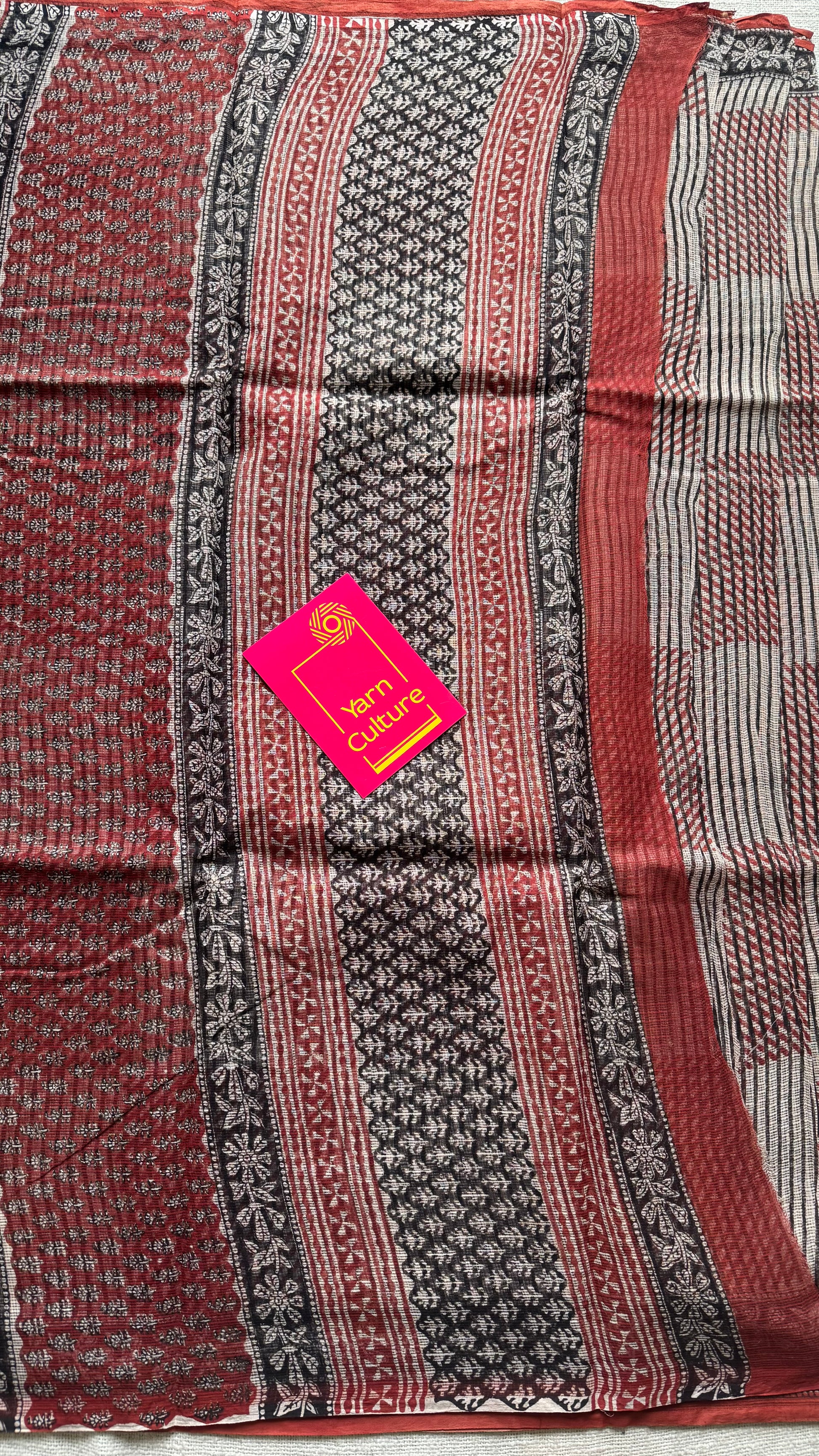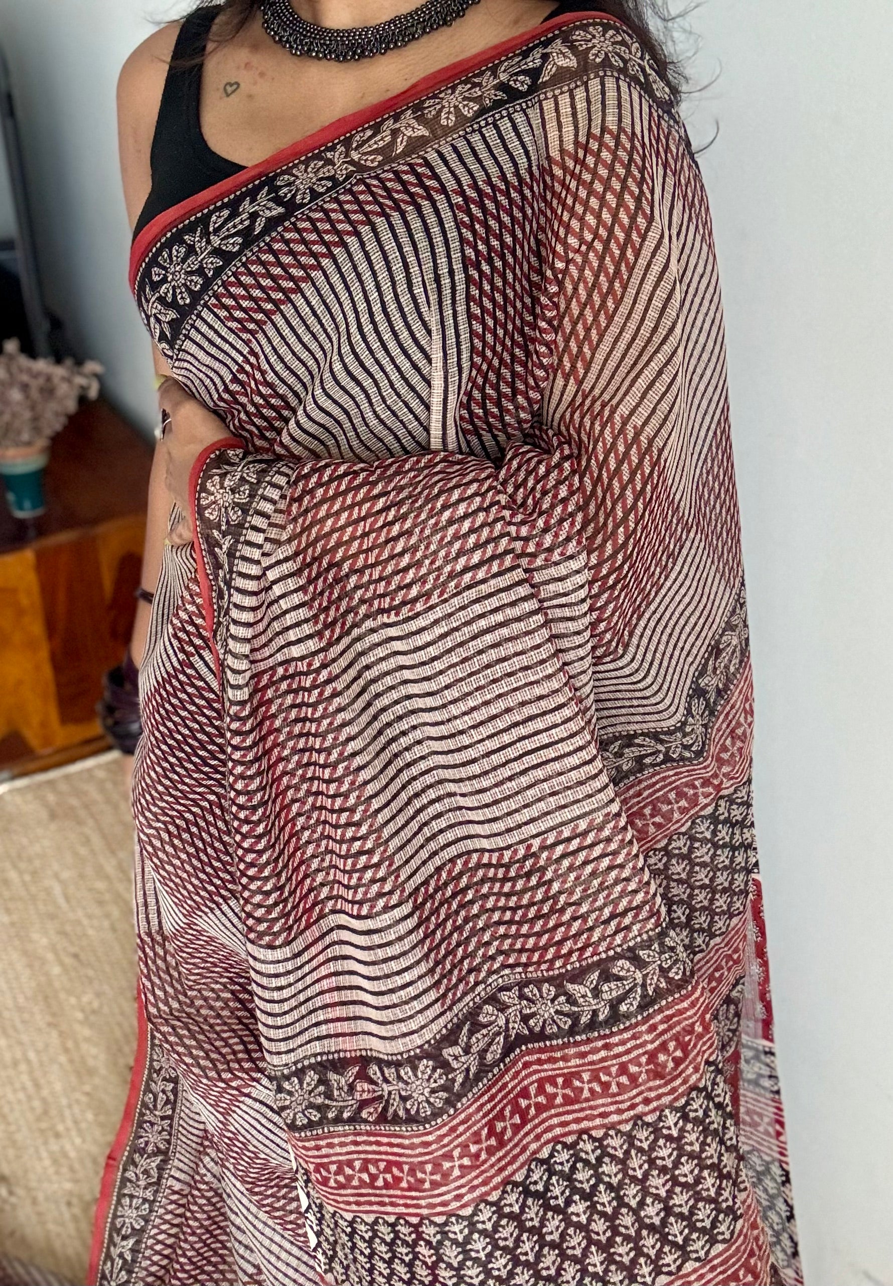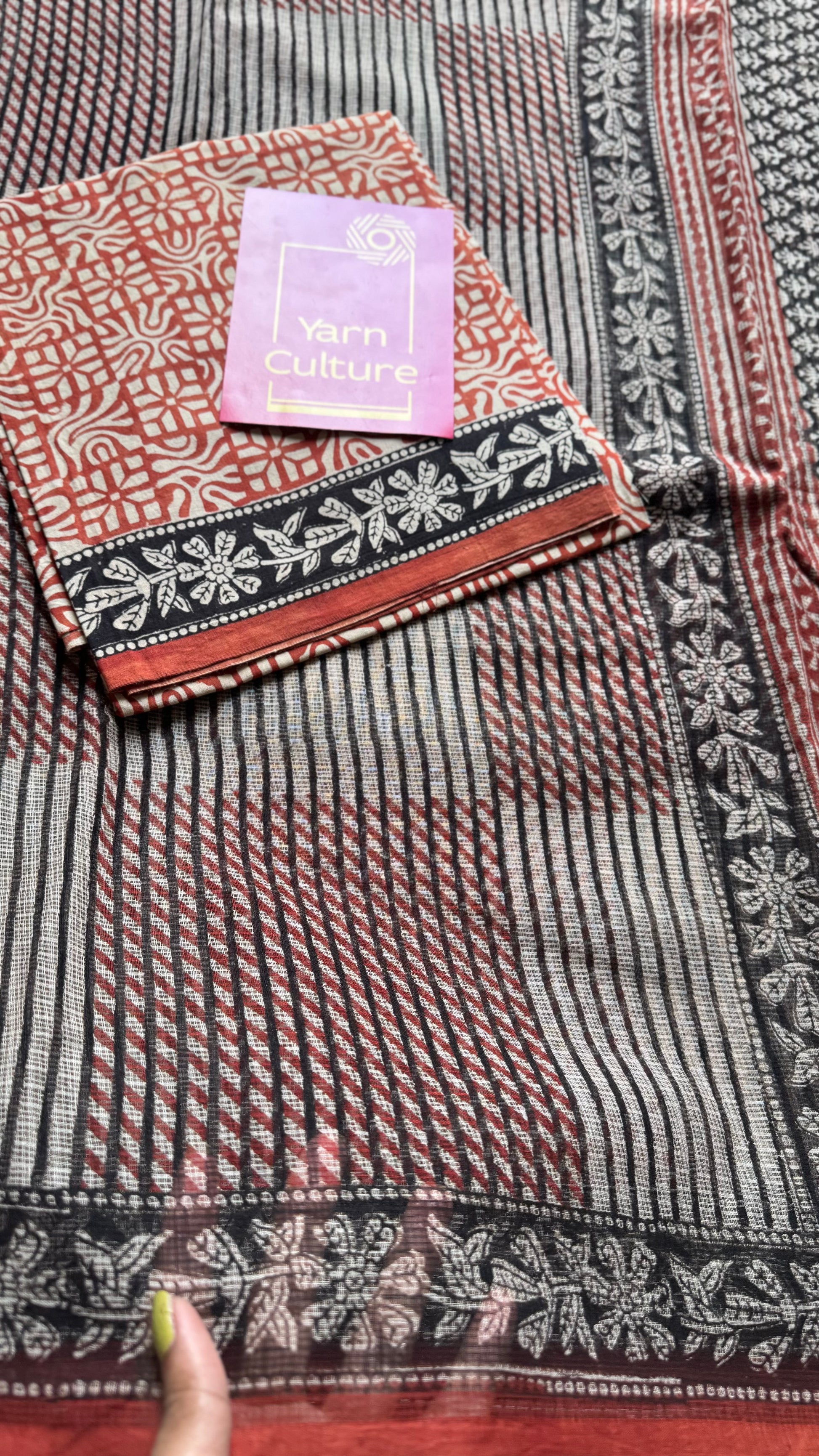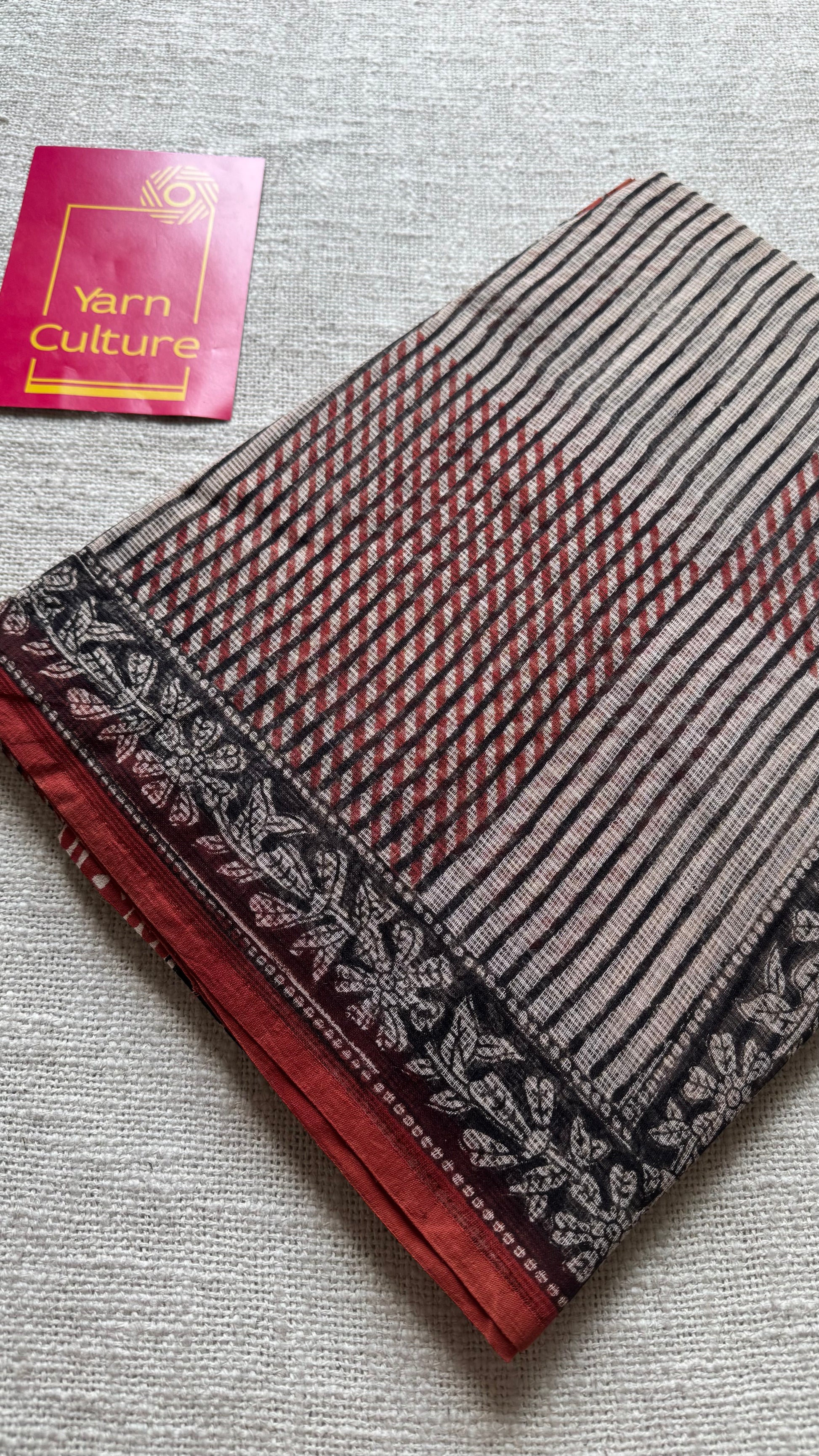 Maroon, black, and beige come together in geometric harmony, while floral borders trace the edges like soft music around structure. Lightweight, rooted, and refined, Mehfil is where tradition meets rhythm, just like every timeless gathering in Rajasthan.