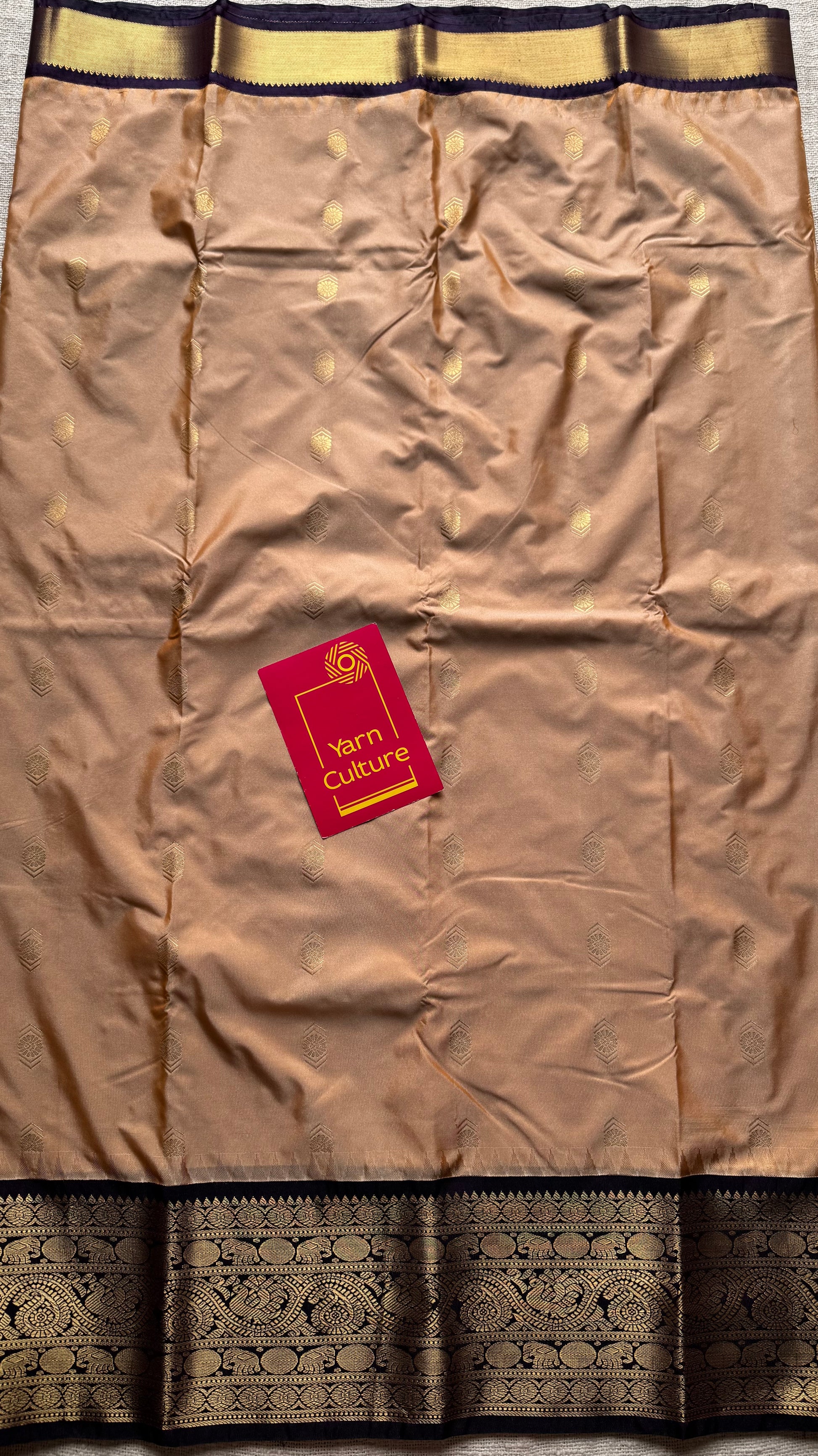 A soft beige body with deep wine purple borders, woven in the handloom semi silk korvai pattern. Light to drape, rich to look at, and made in the age-old korvai style where the body and border are woven separately and then skillfully joined on the loom. This gives the saree its sharp, contrasting borders and makes it a true South Indian classic.