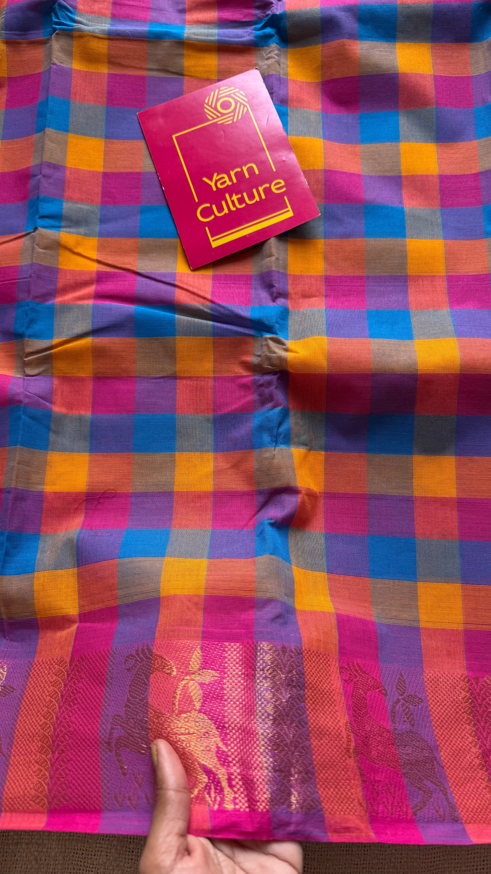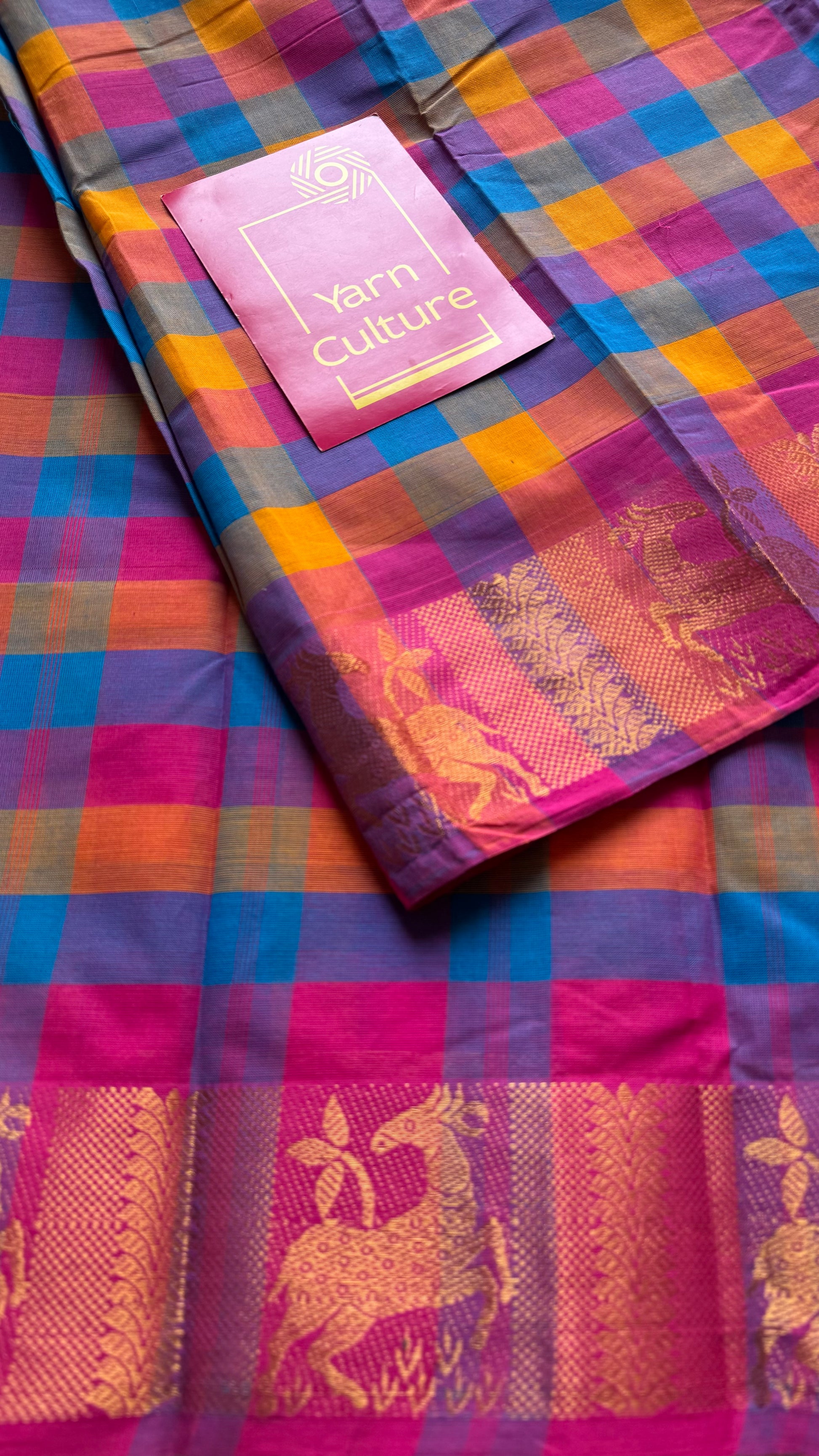 Multicolour Chettinad cotton saree with paalum pazhamum checks (pink, violet, blue, orange) - YCCOTNCCFE341