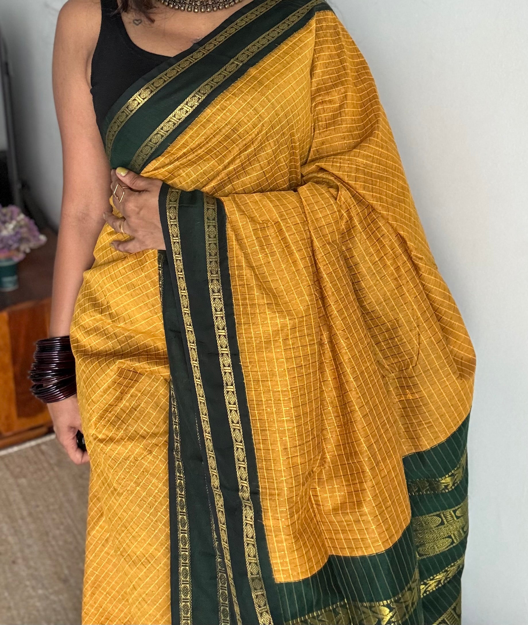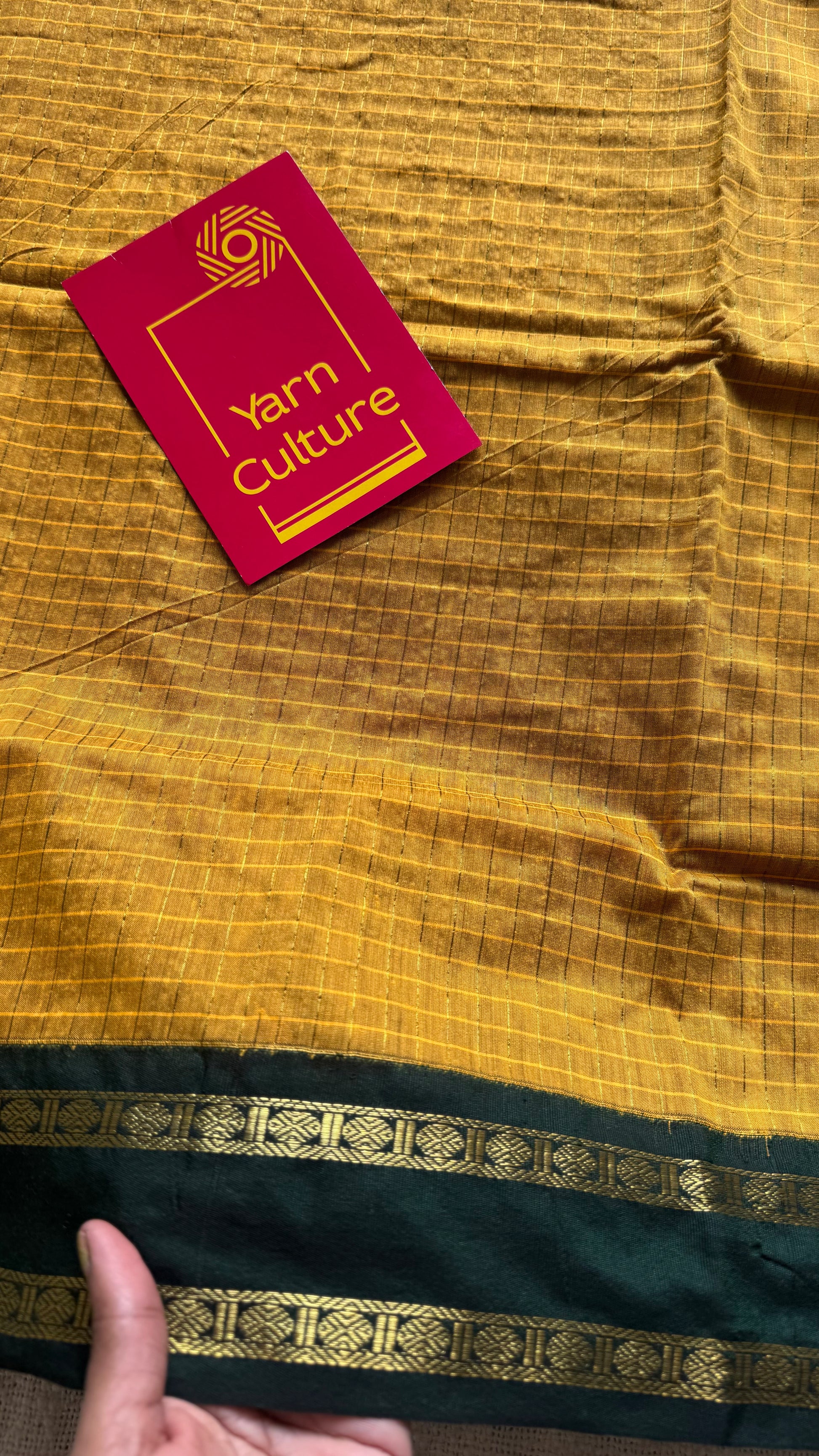 Mustard yellow with dark green contrast arani checkered saree, cotton silk - YCCOTNKCFE70