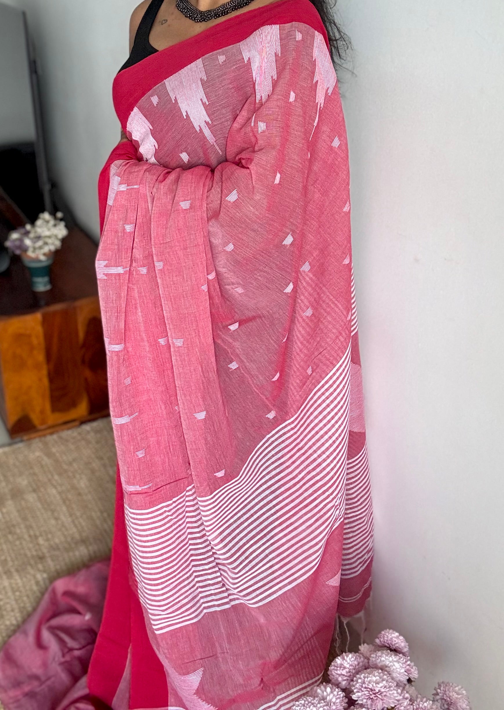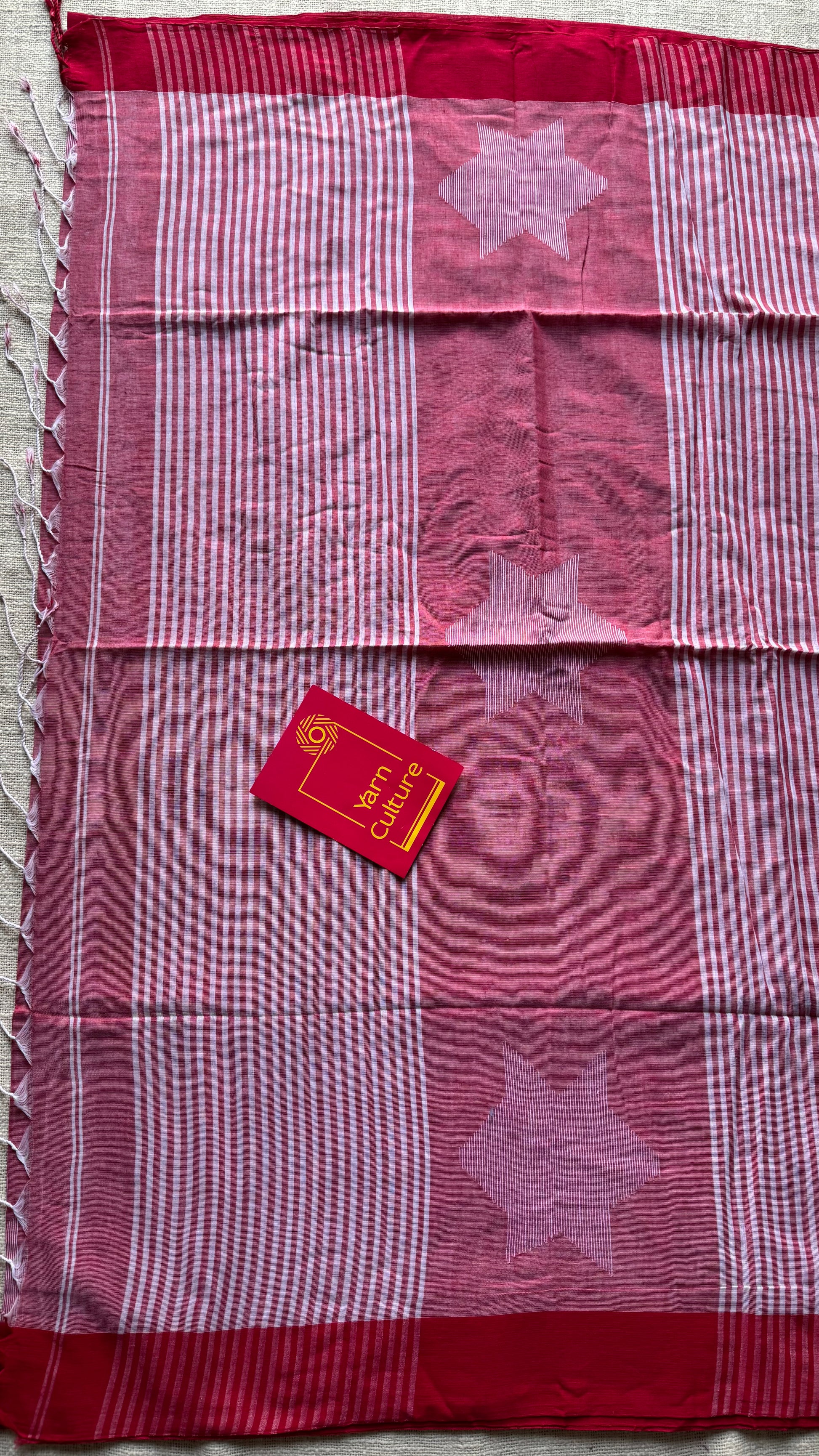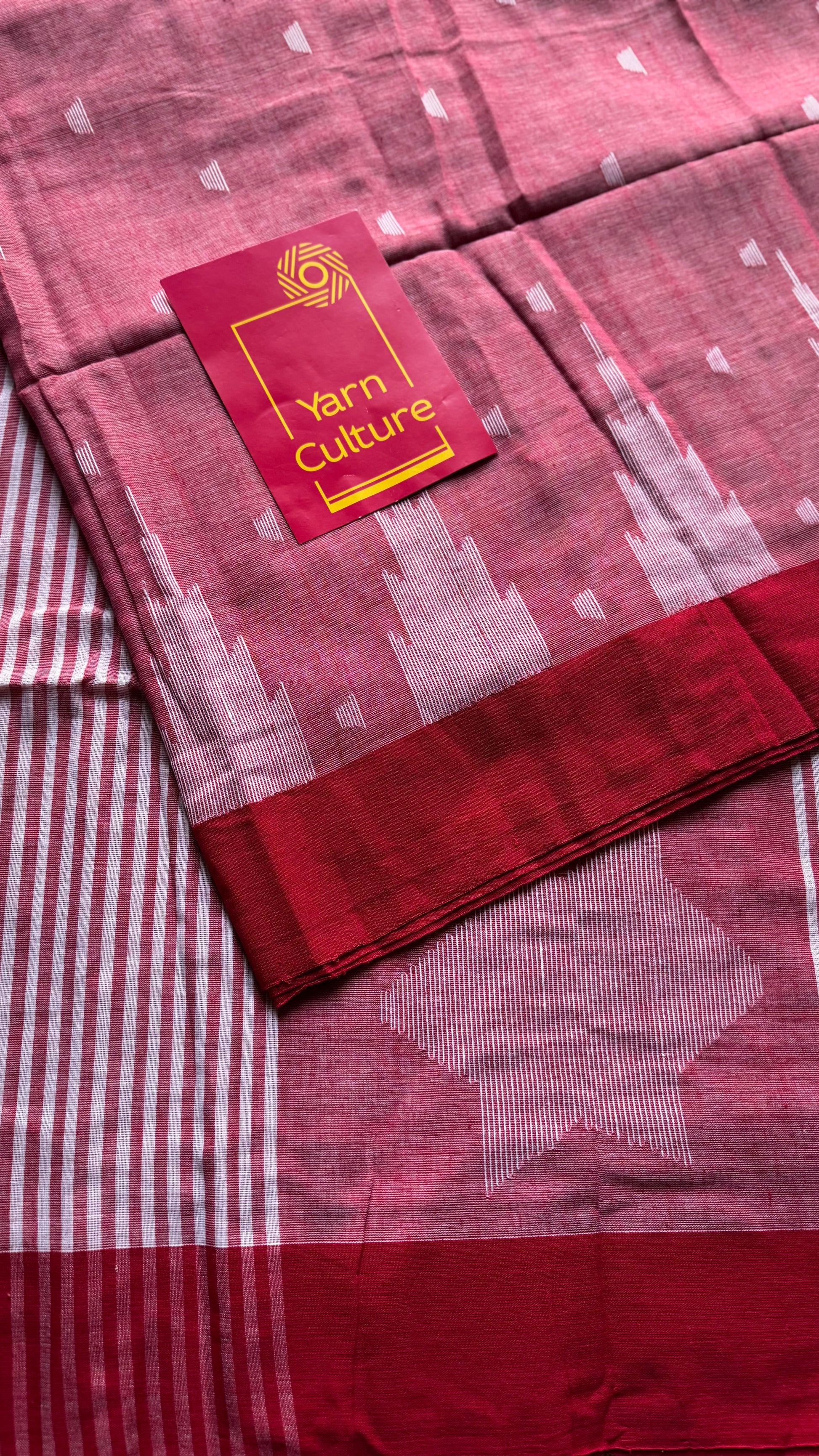 Muted red with dark red borders, temple motif woven threadwork, soft cotton. Soft, easy to drape, classy.