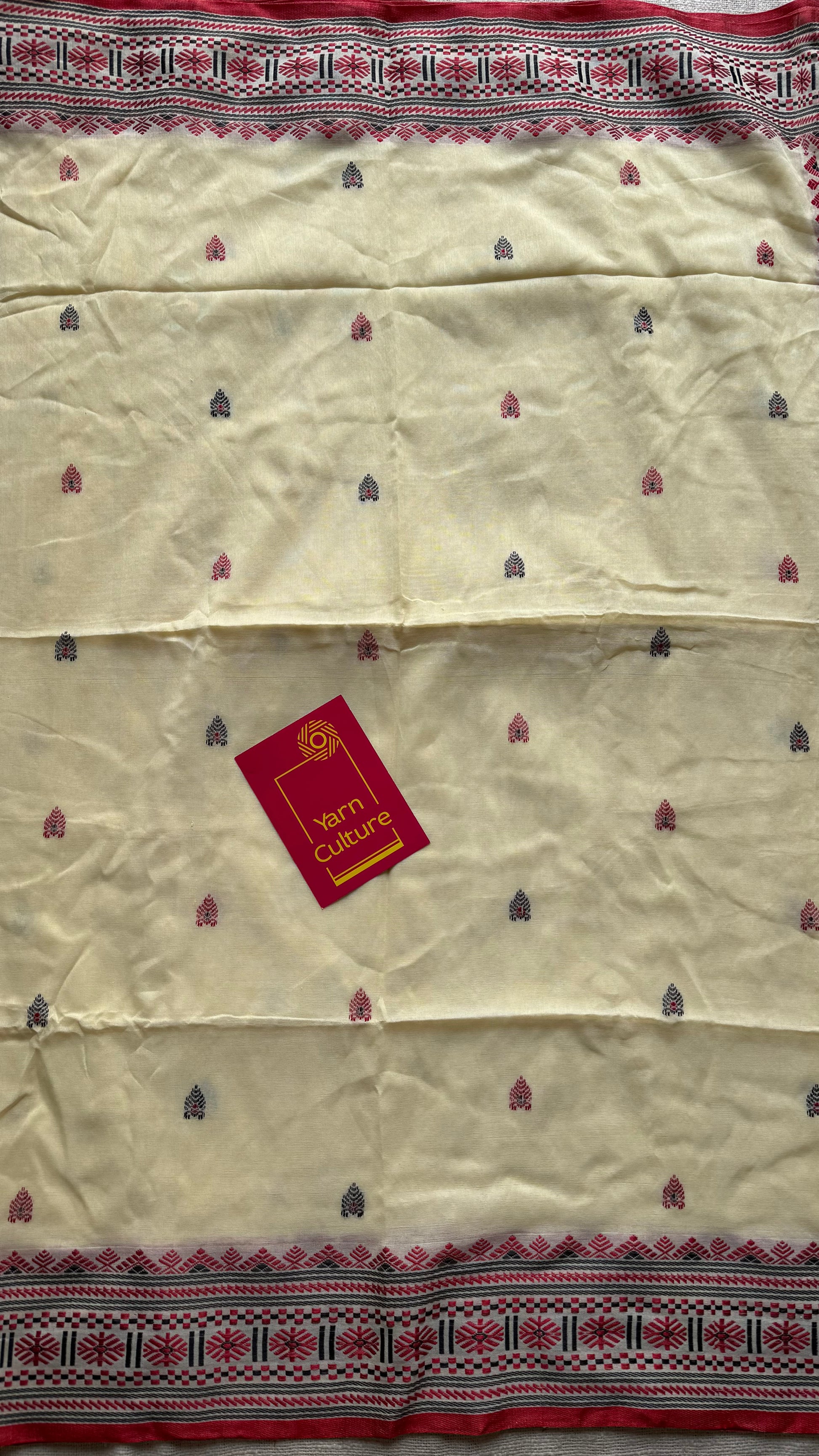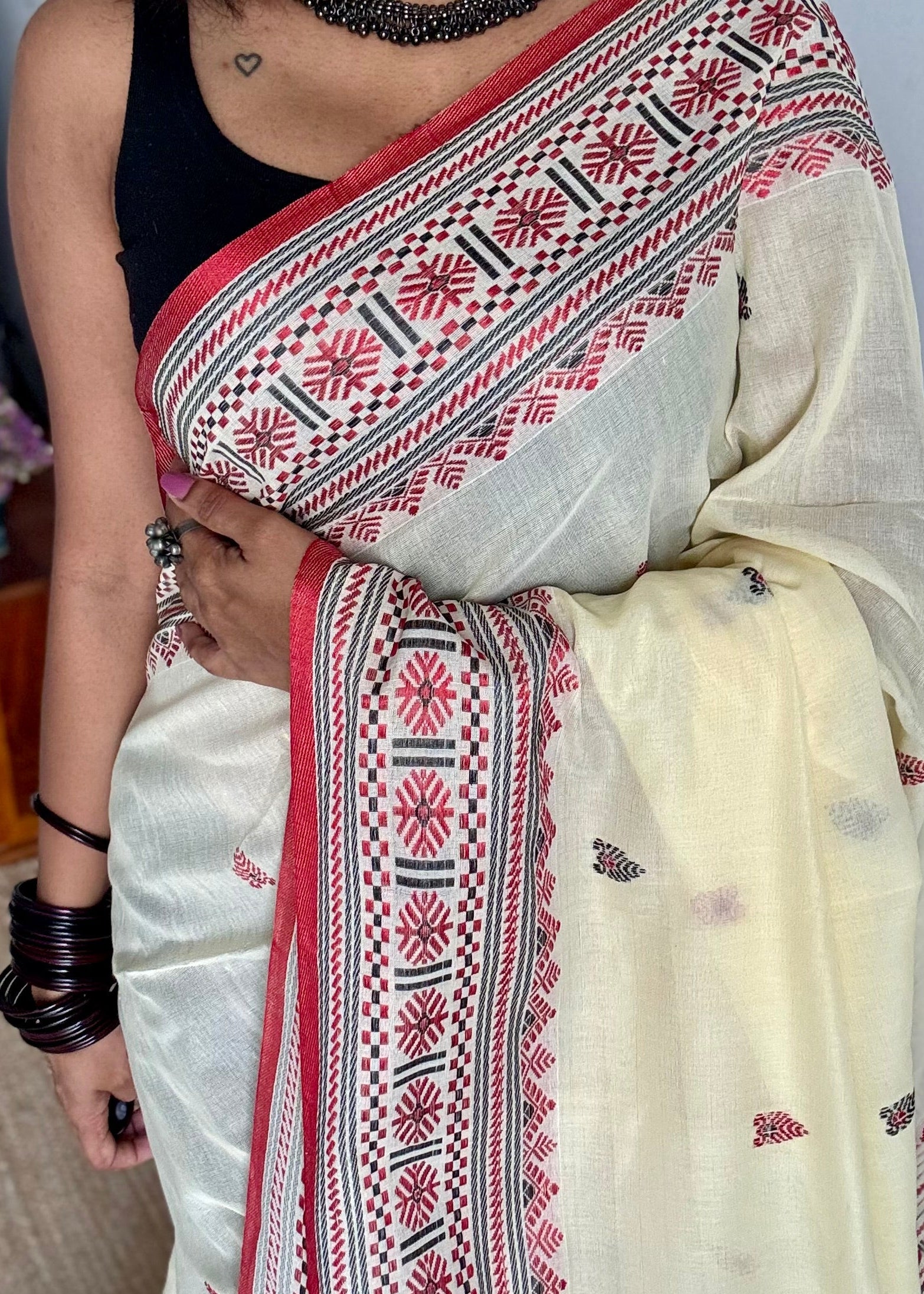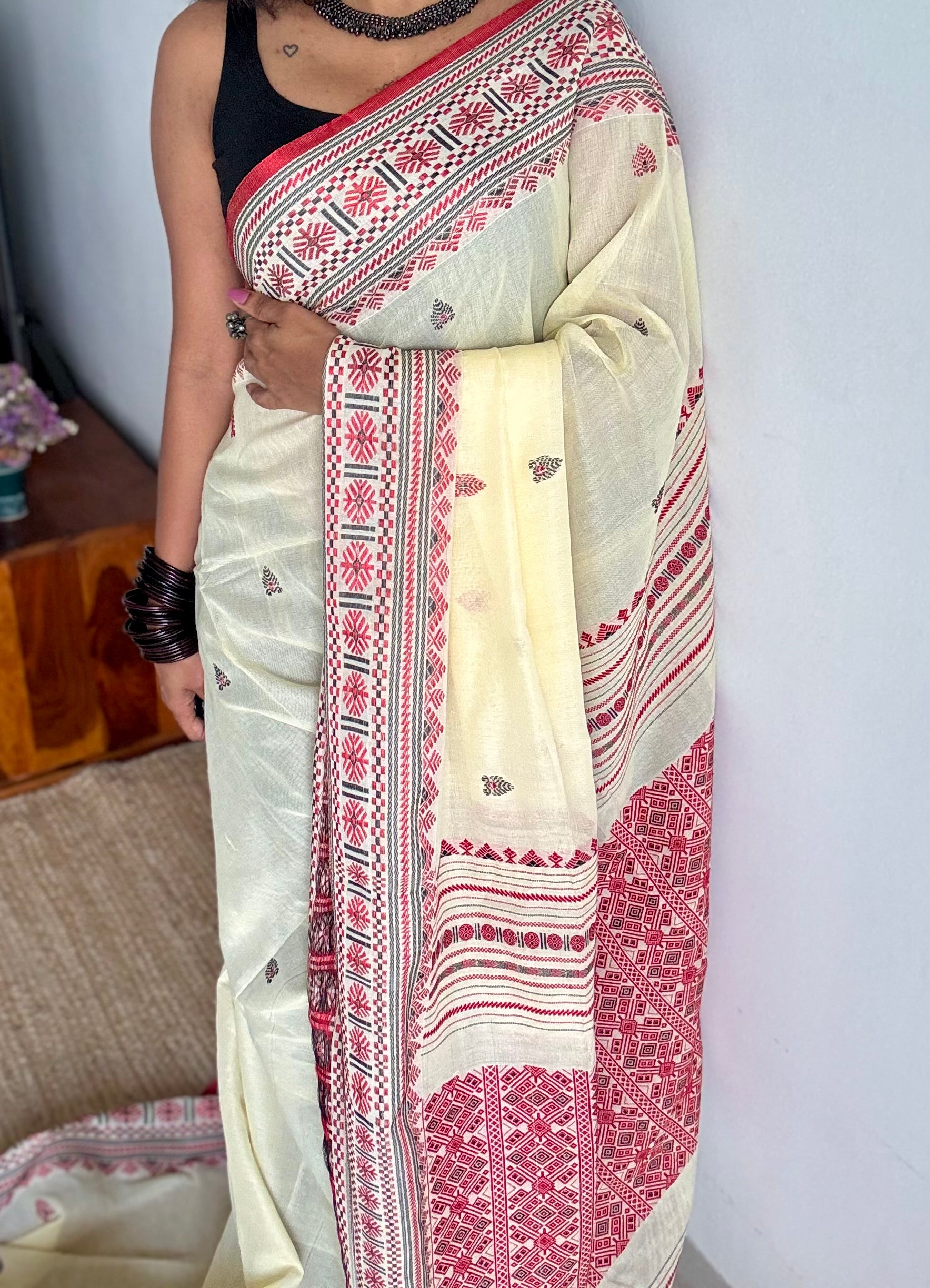 Naamghor, a serene cream drape with red and black threadwork, echoing the quiet strength and simplicity of Assam’s sacred spaces. Handwoven treasure of Assam.