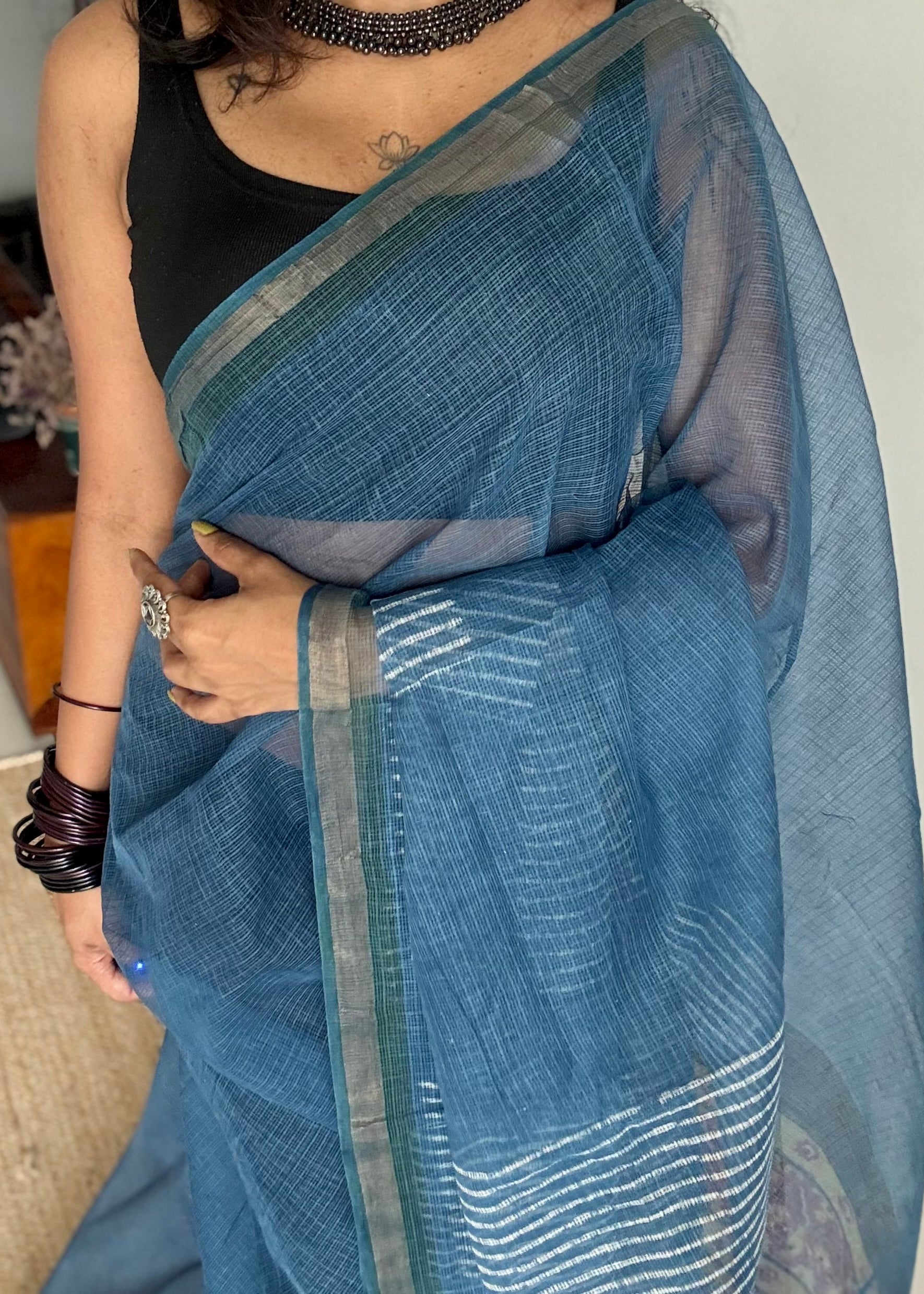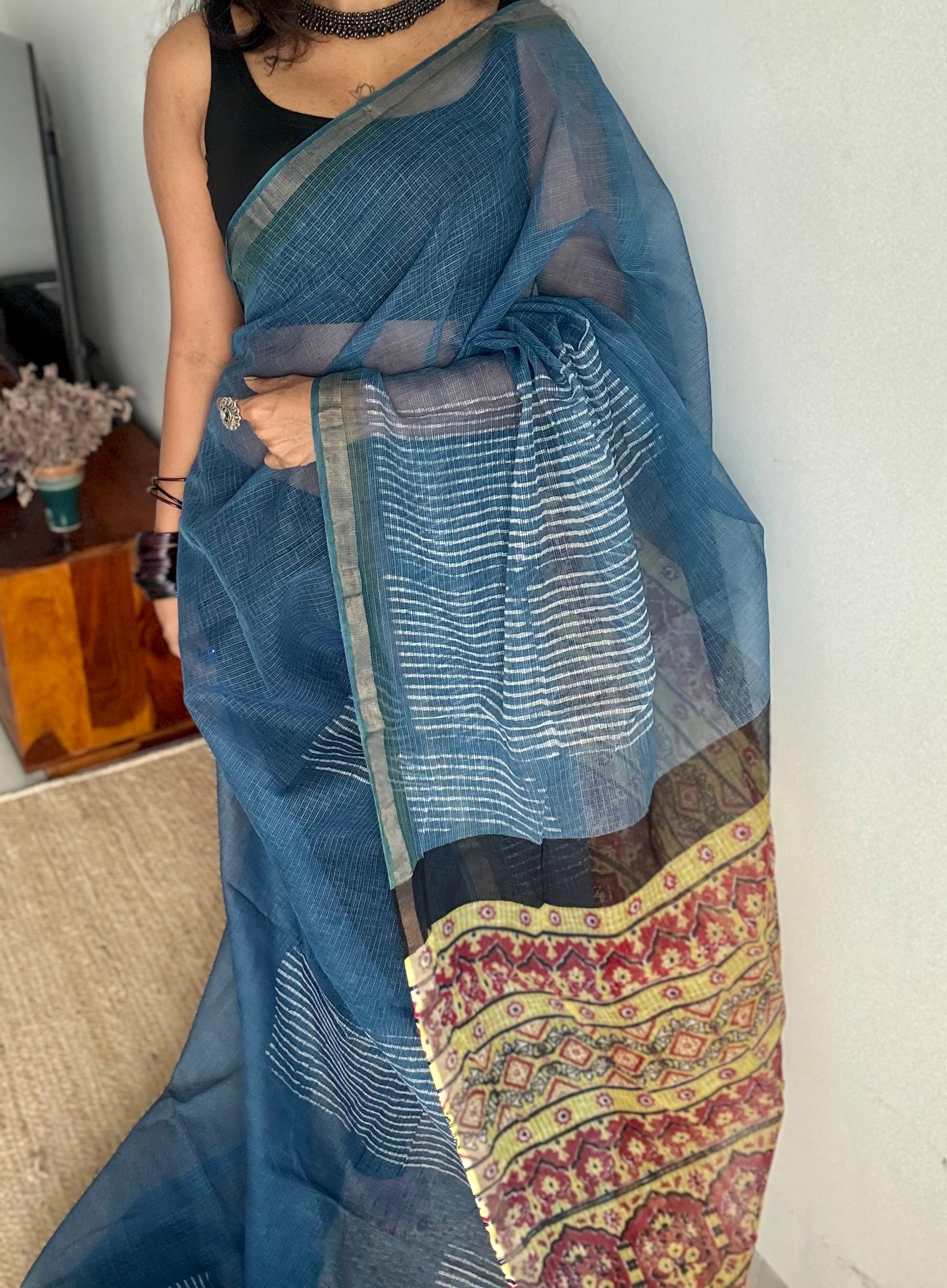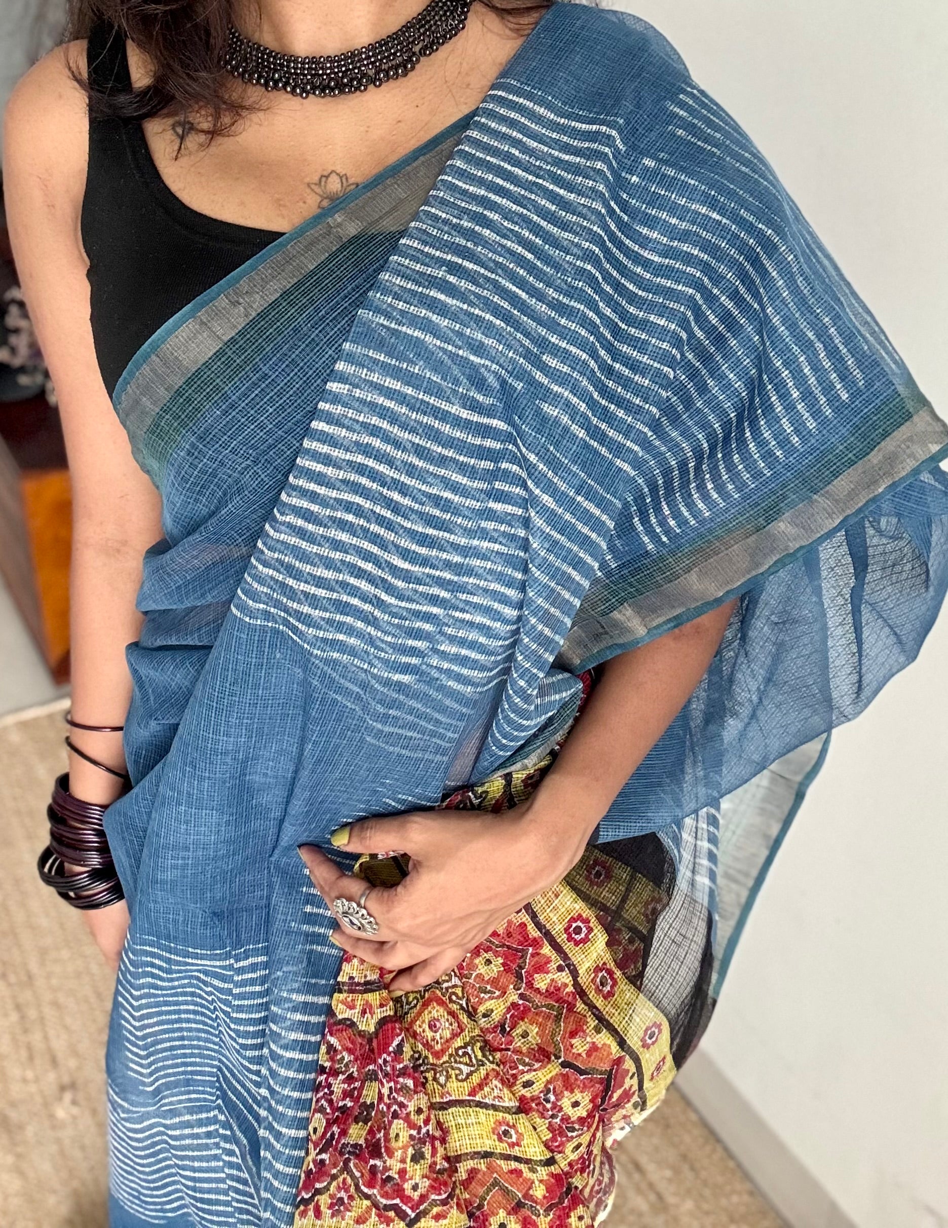 Indigo draped in white geometric lines, framed by an antique gold border touched with a gentle green hue and a colourful pallu. Neelvahini feels fluid and composed, a saree that moves like calm waters under moonlight.