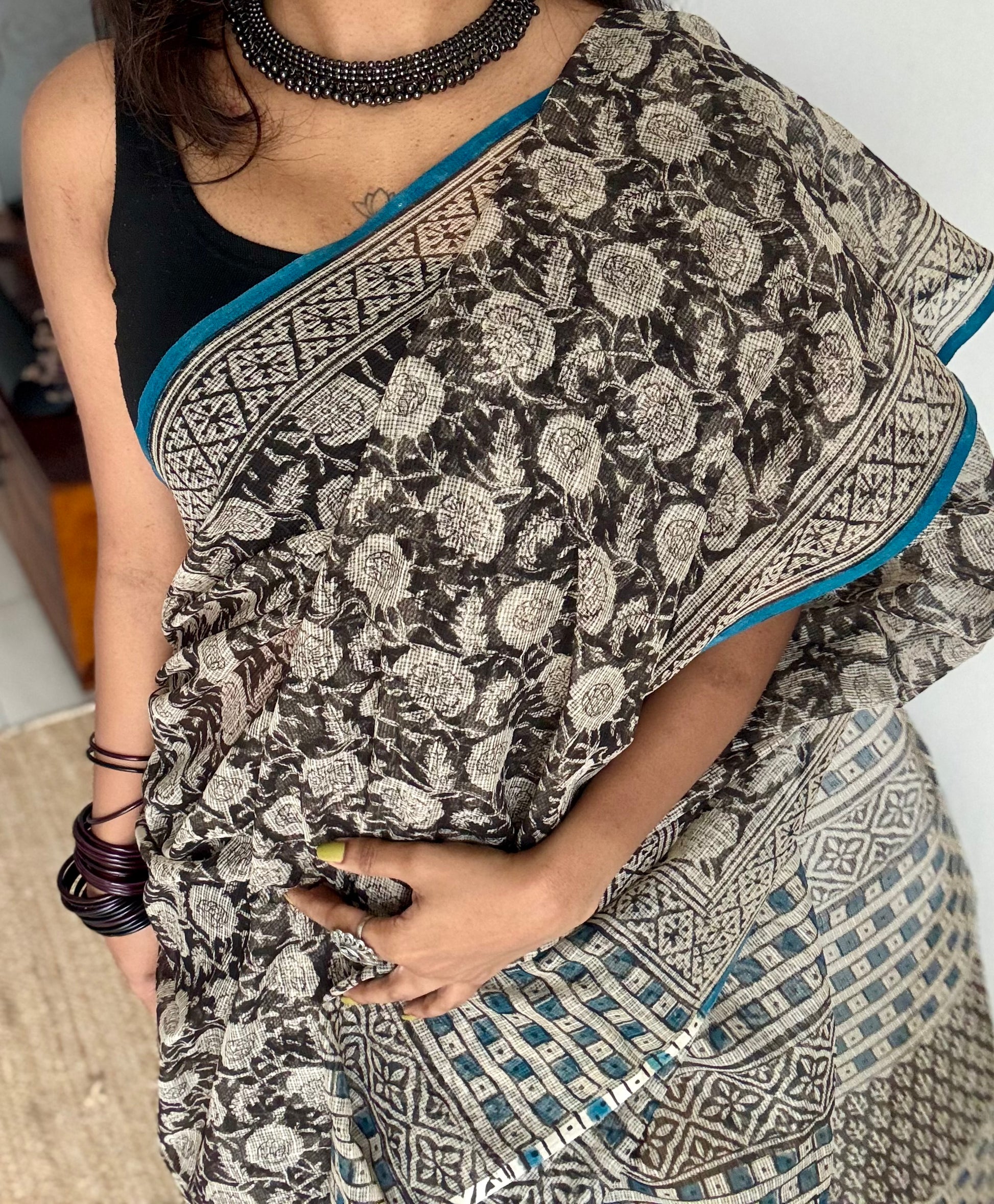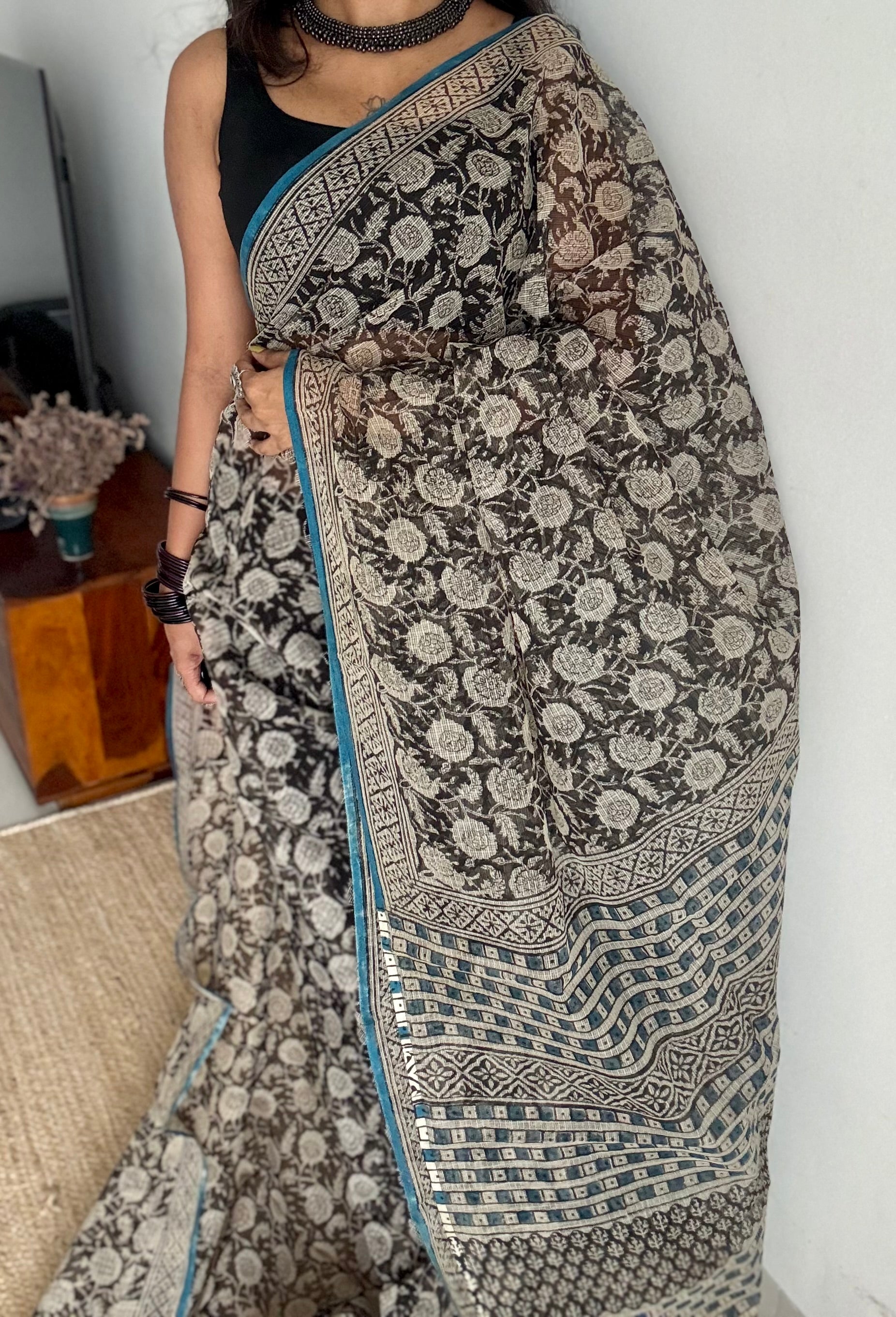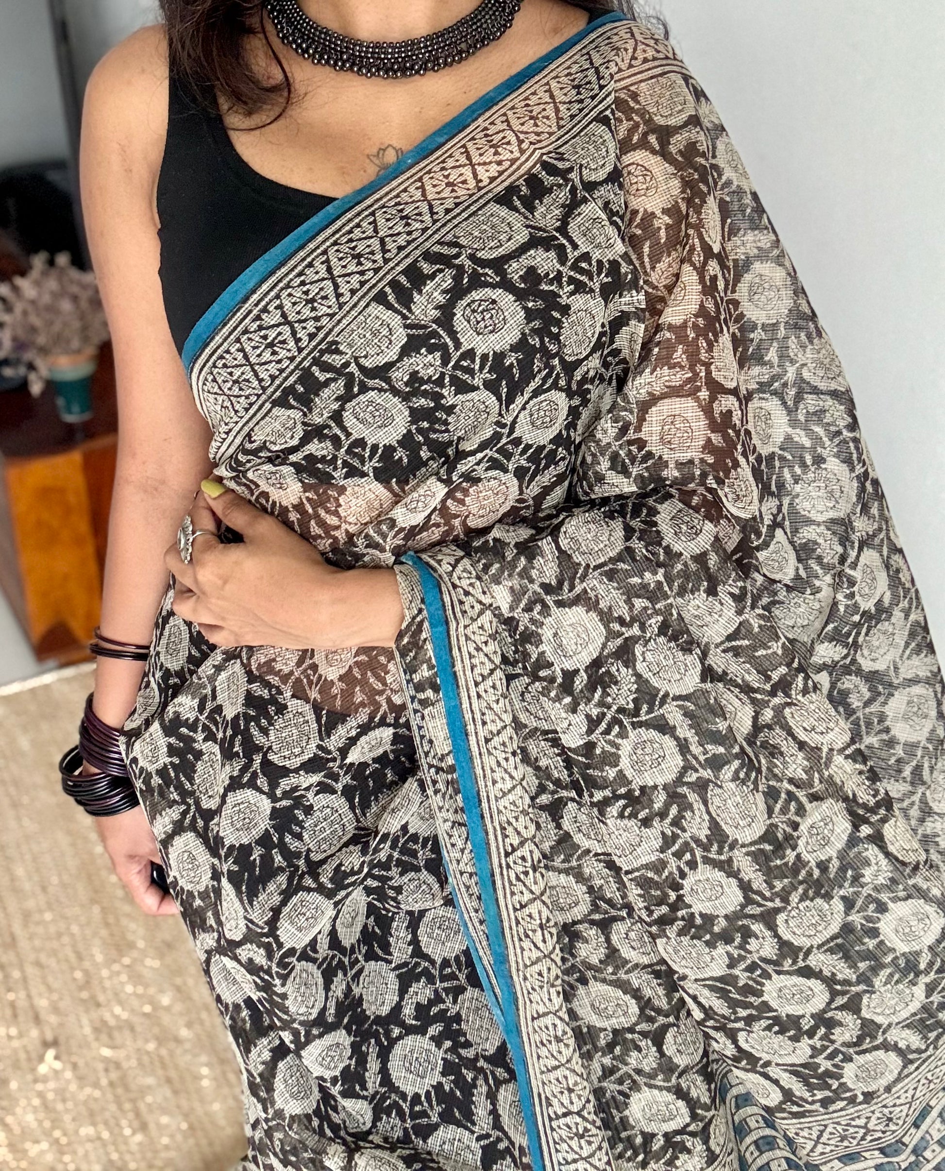 A saree that balances depth and lightness, black draped in white florals, touched by a tranquil blue border. Nilaya feels like dusk meeting dawn, where darkness softens into serenity, a quiet, graceful ode to the skies above Rajasthan.