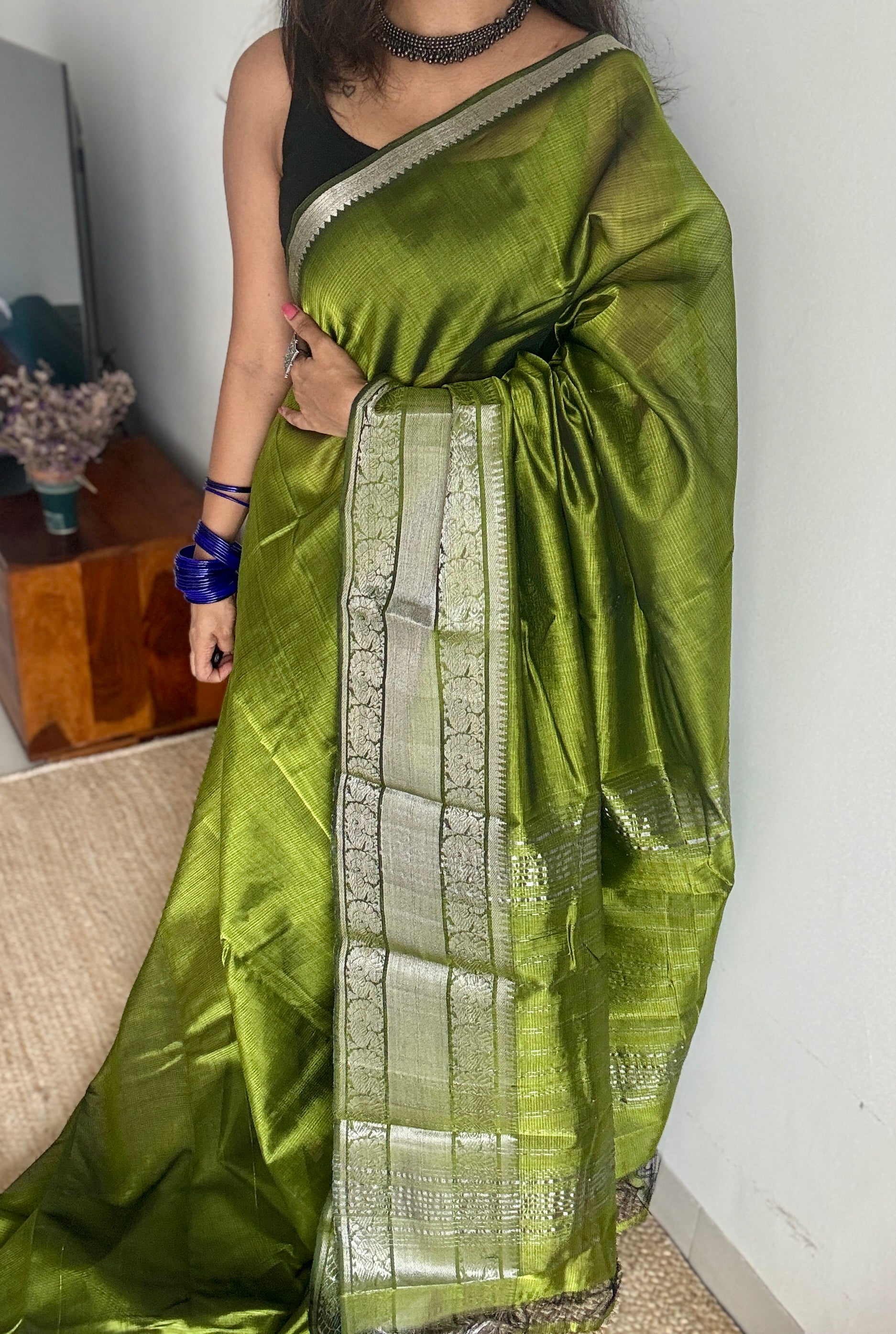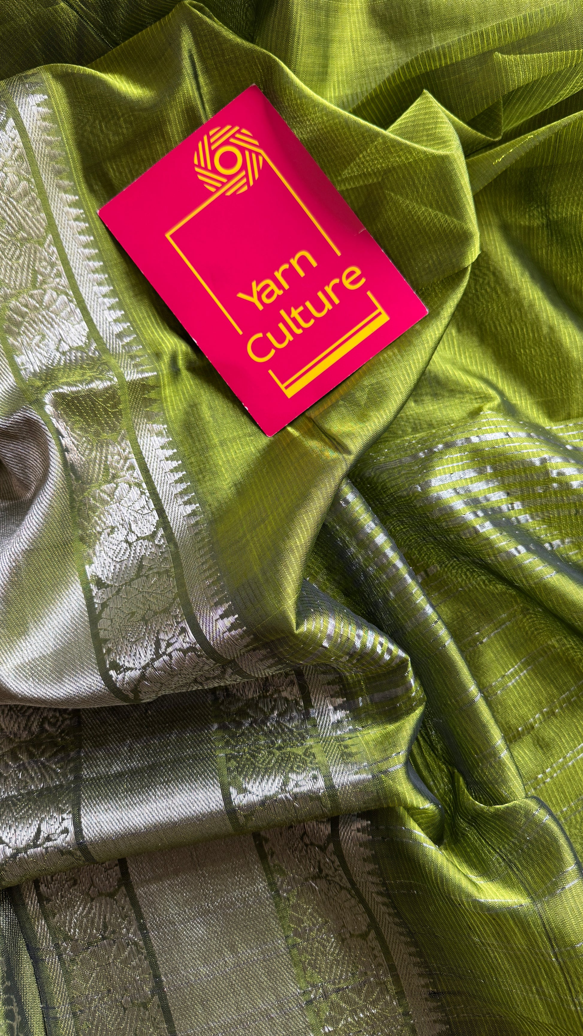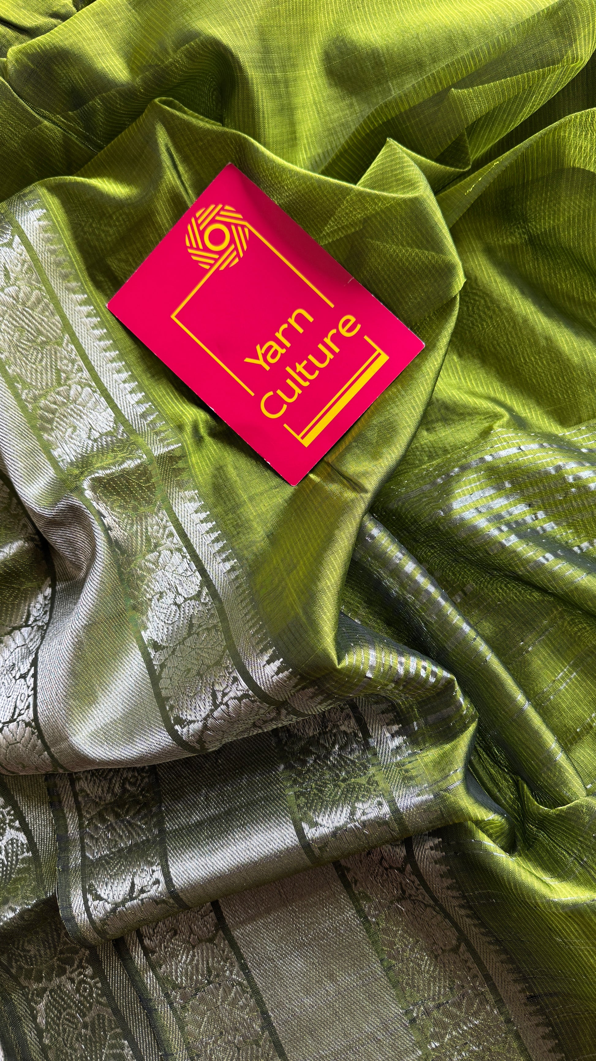 Olive green with silver peacock woven zari border, mangalgiri silk cotton, handwoven, soft, light weight- YCWOTDMSCM04