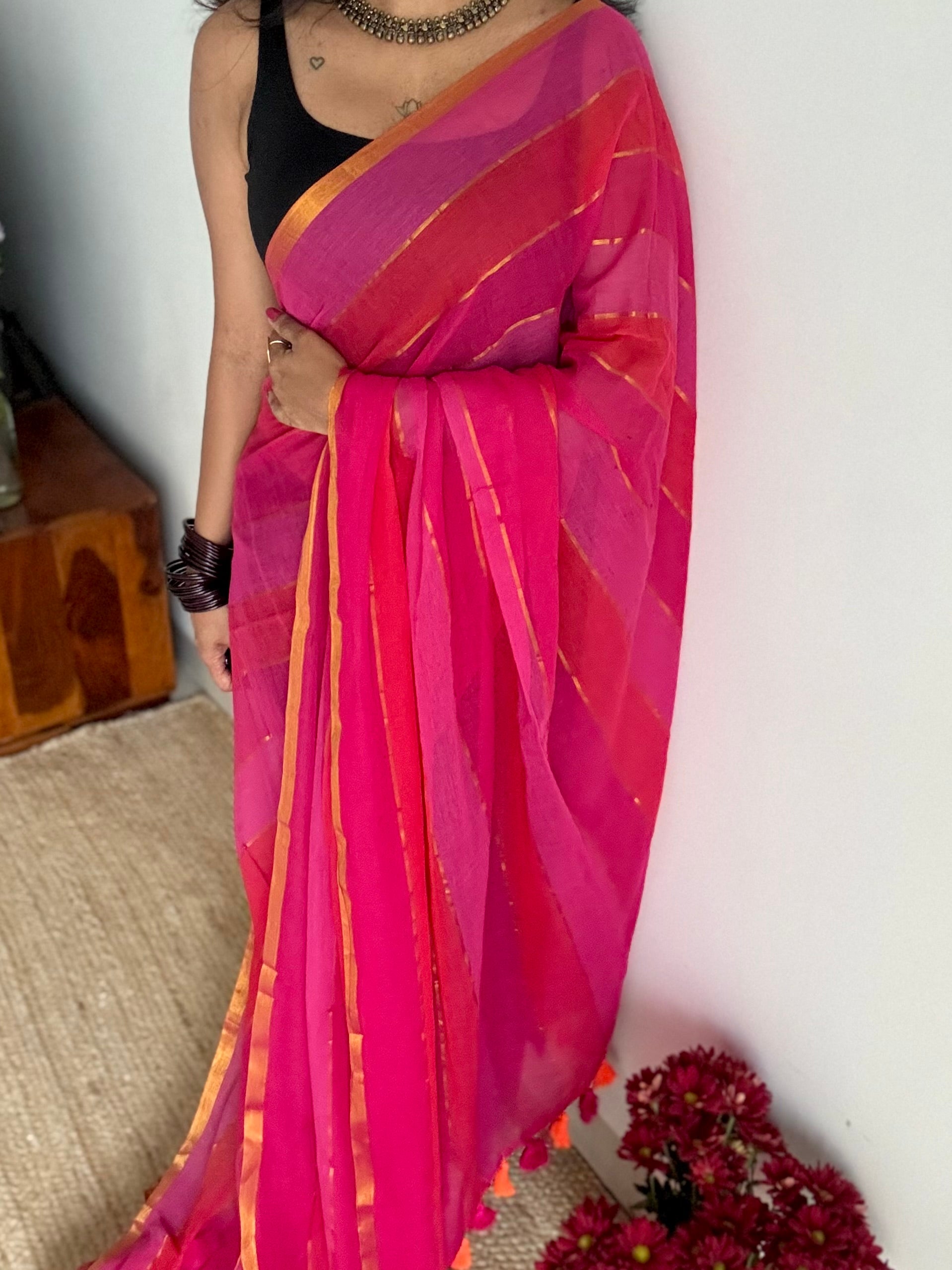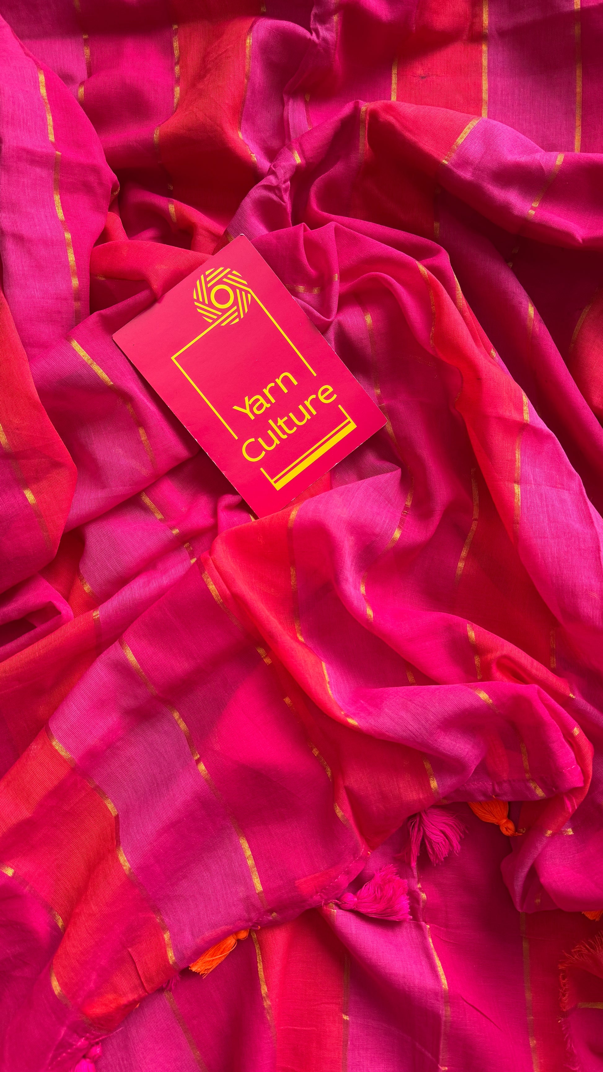 Everybody's favourite mul cotton in orange, pink, gold multicoloured broad stripes with tassels.