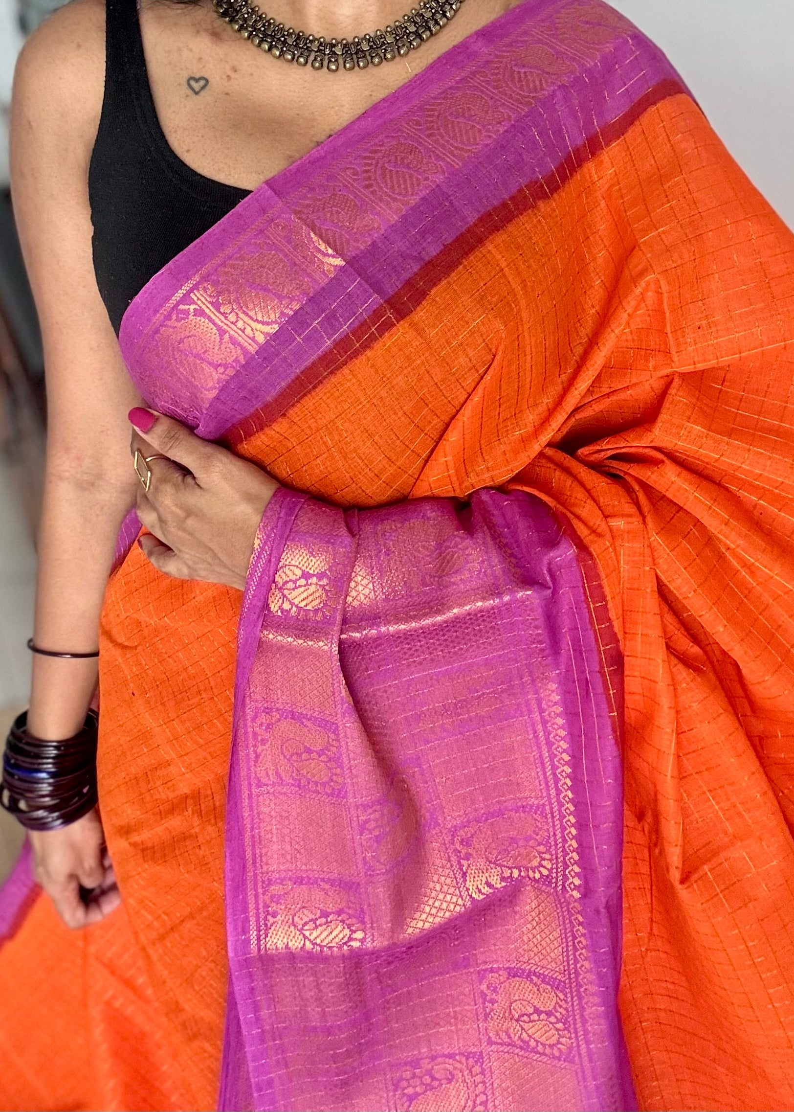 Orange checks with purple pink mayuri checkered zari border, madurai cotton with contrast blouse fabric 💖