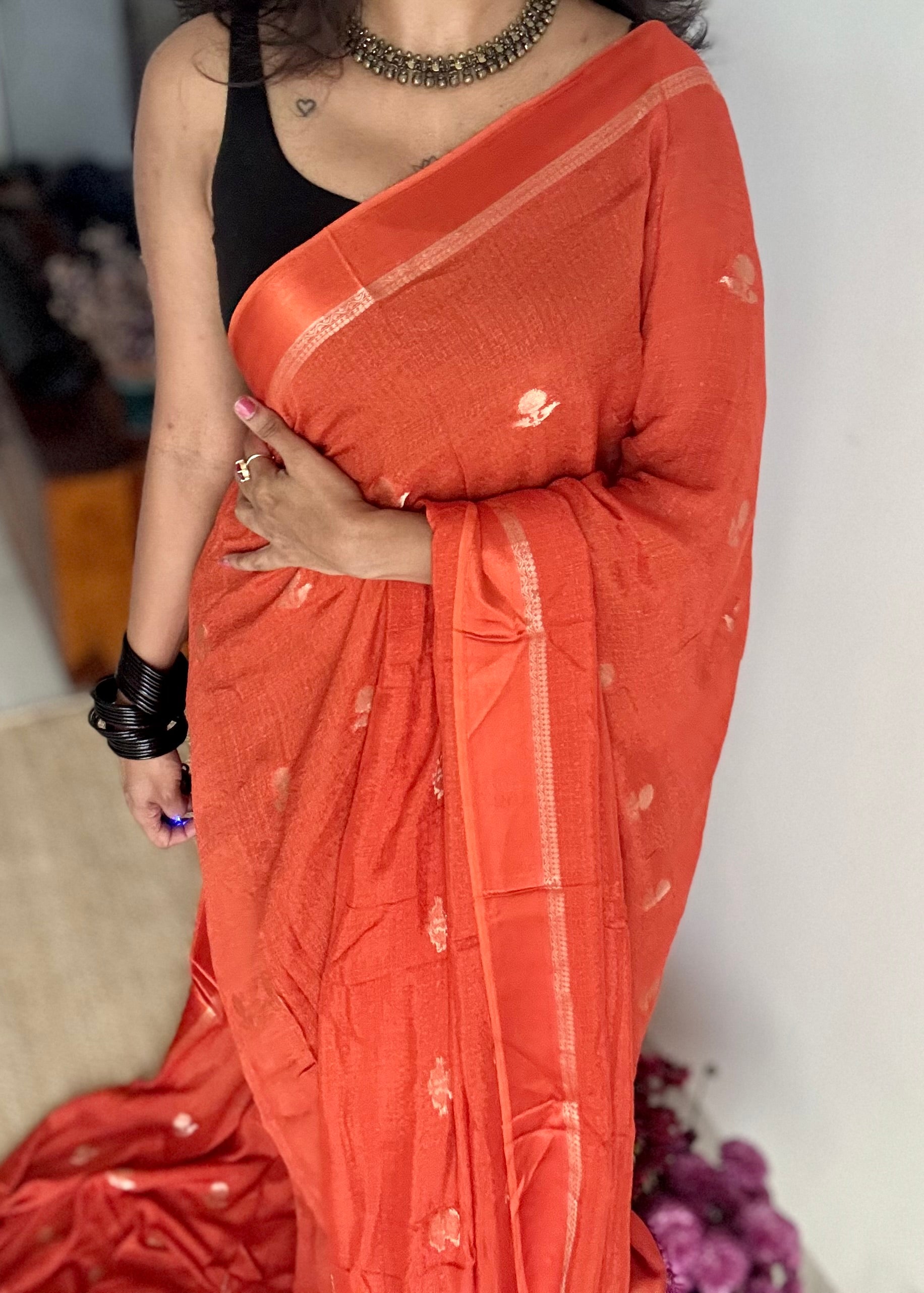 Orange semi Khadi silk with satin borders, jacquard zari and motifs all over in gold.
