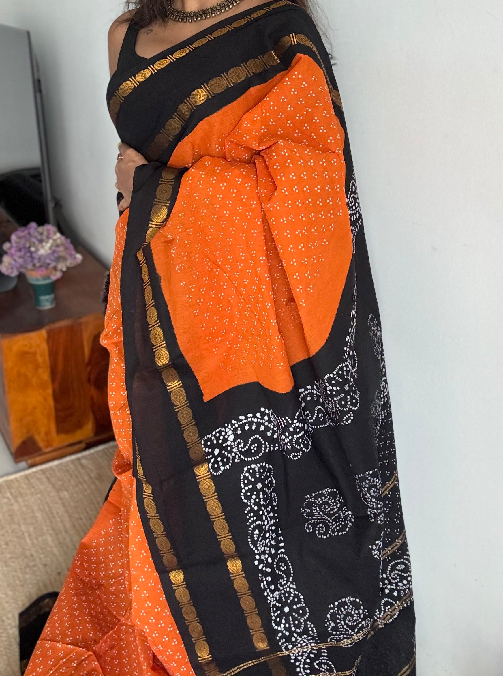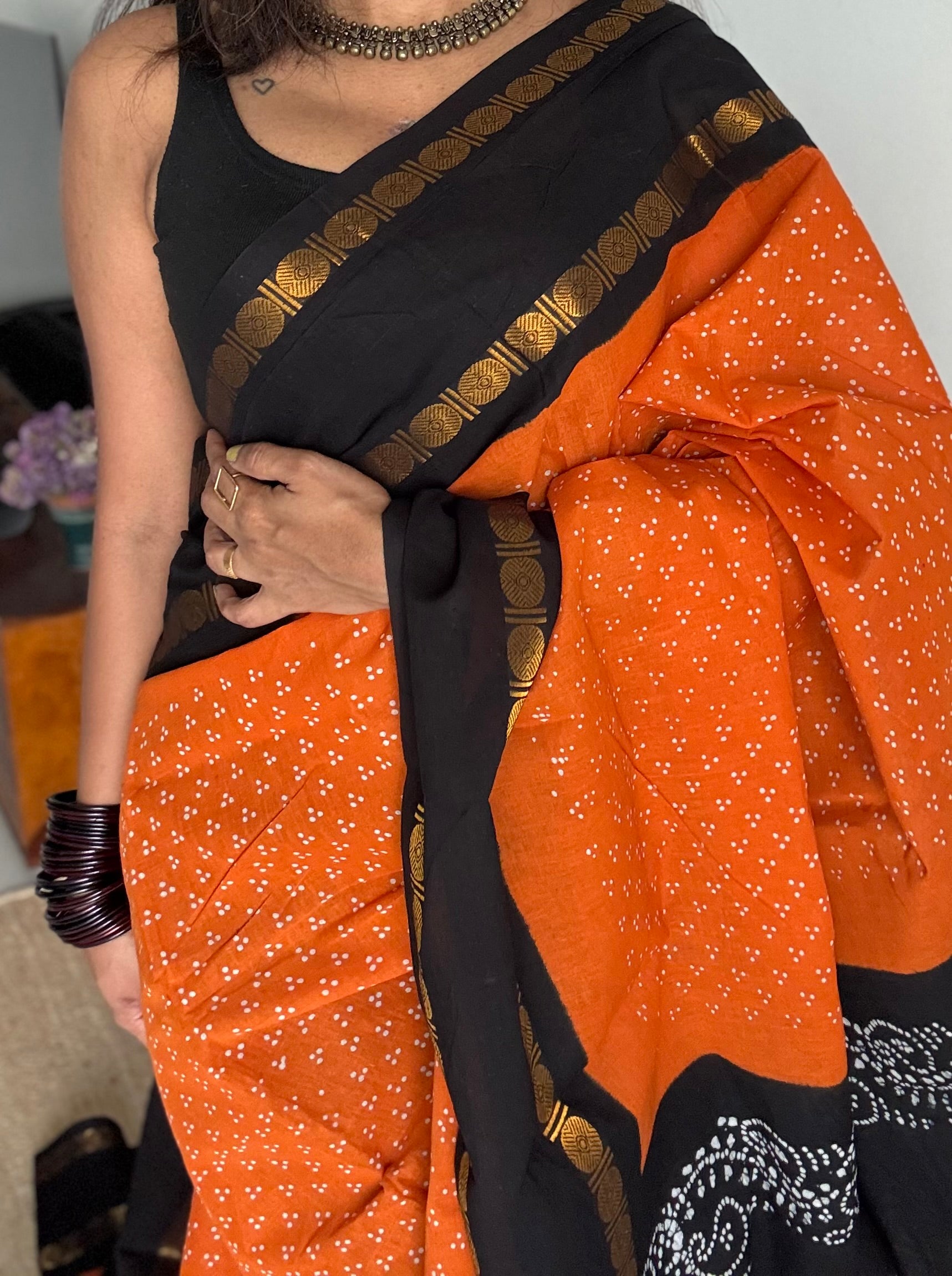 Orange with black contrast border, kattuchayam dyed madurai sungudi cotton saree - YCCOTNMSFE83