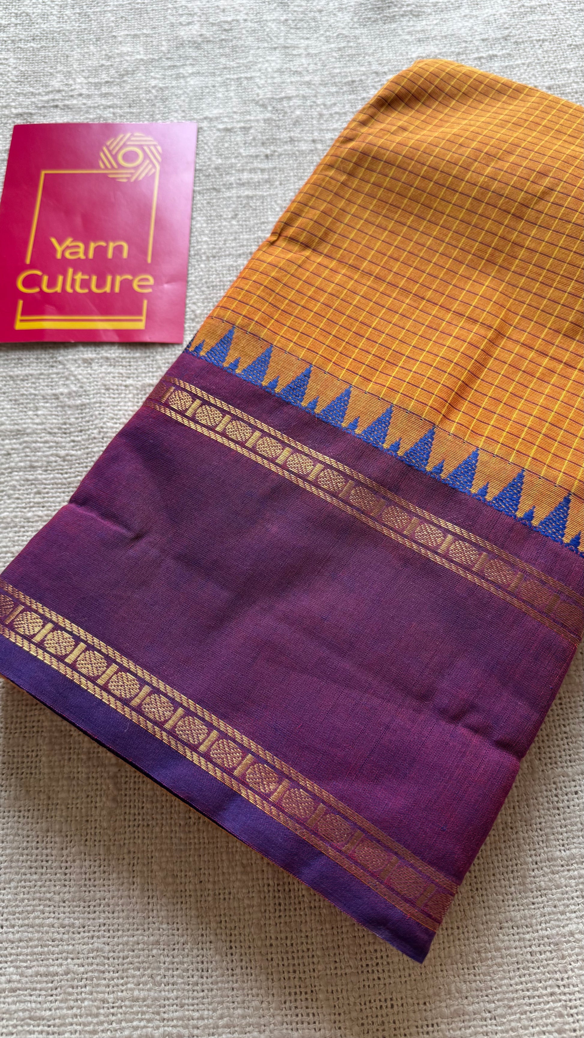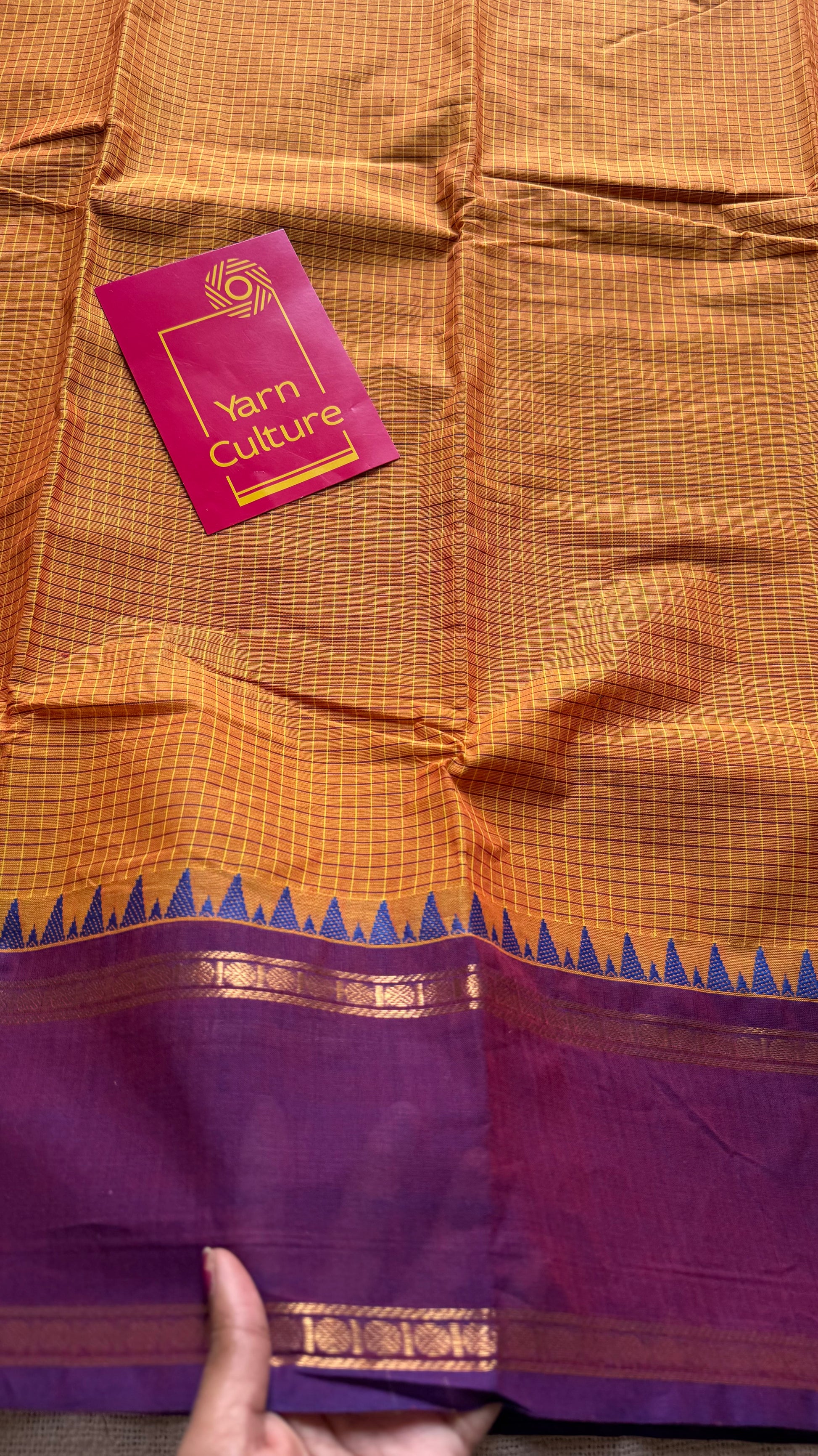 Orange with purple border, temple motifs, checkered body, kanchi cotton - YCCOTNOCKC26