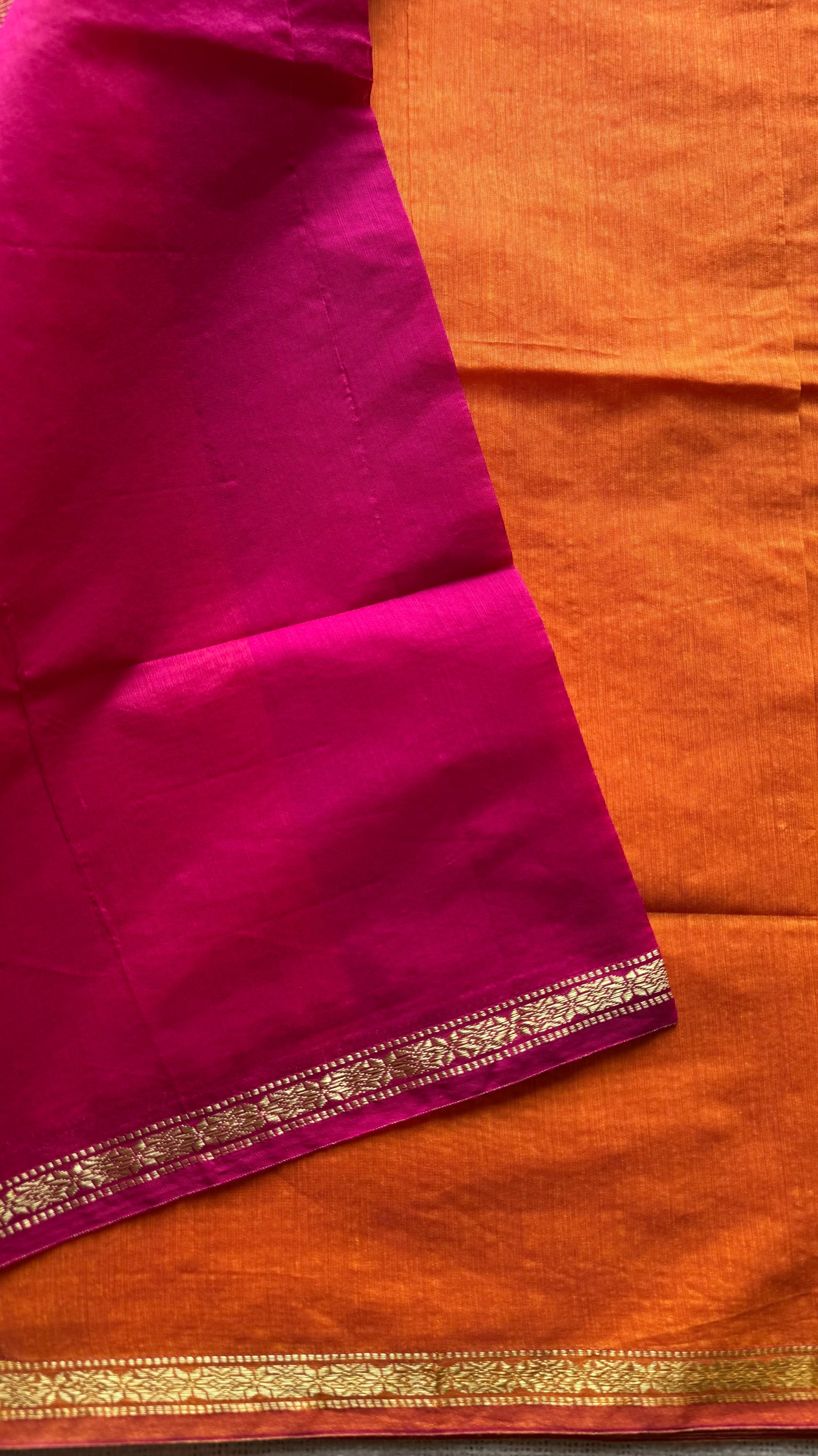 Semi maheshwari cotton silk in orange and rani pink, gold buttas, and contrast blouse.