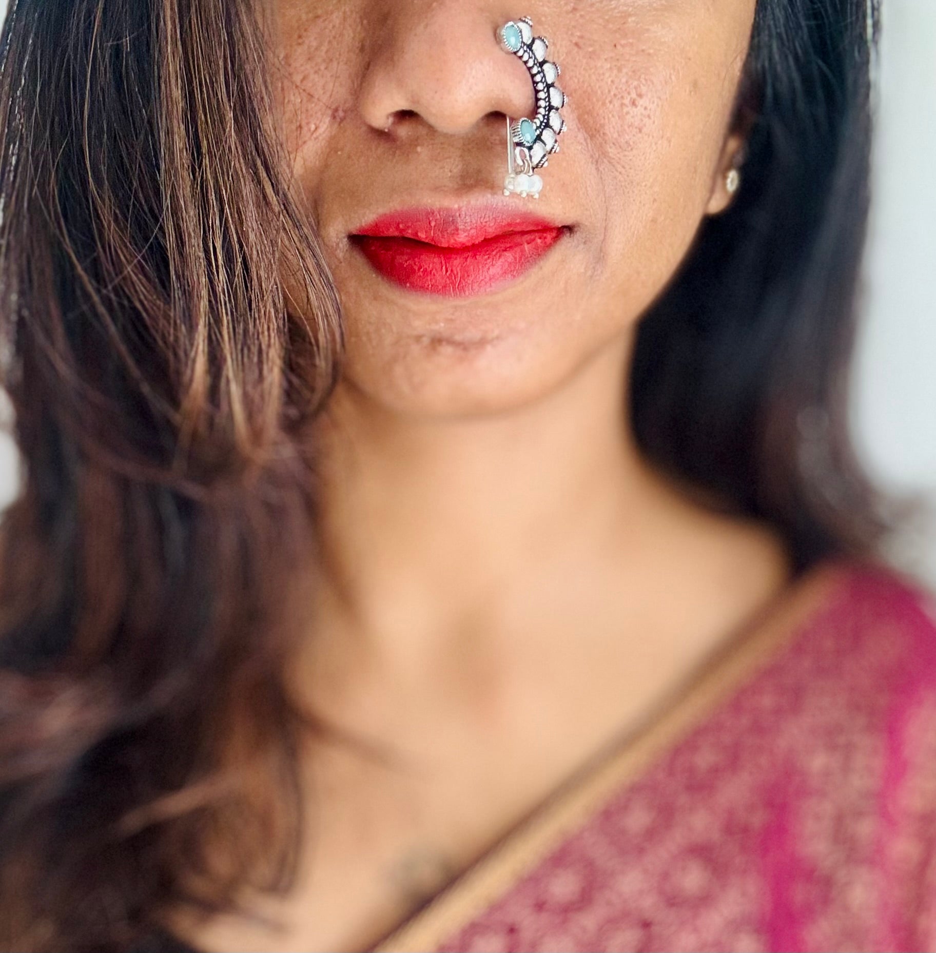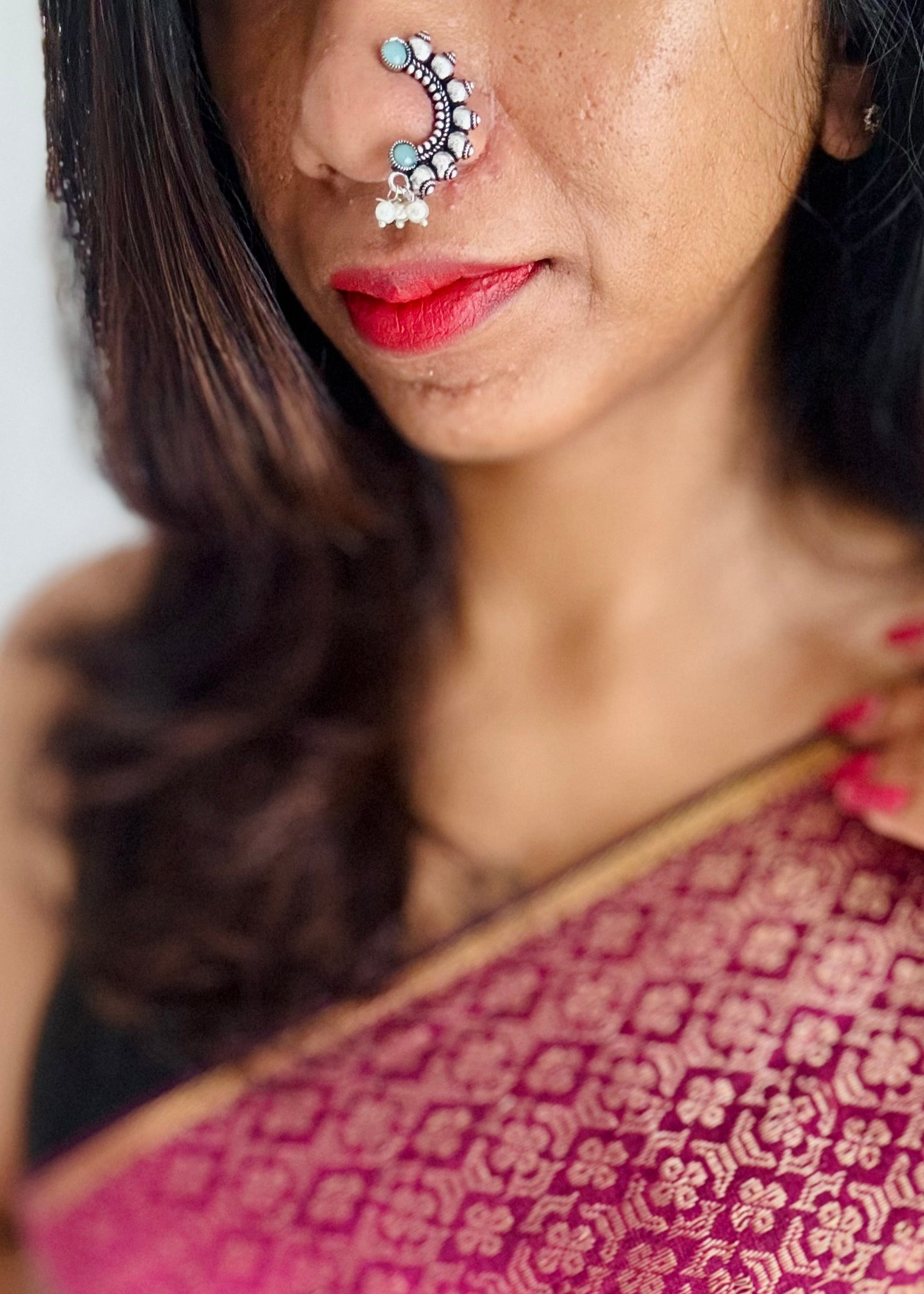 This is a clip-on Maharashtrian nath, designed for the left nostril. Simply place the stud on your left nostril, gently press the back to secure it, and it will comfortably hook in place. No piercing required, just clip, press, and flaunt.