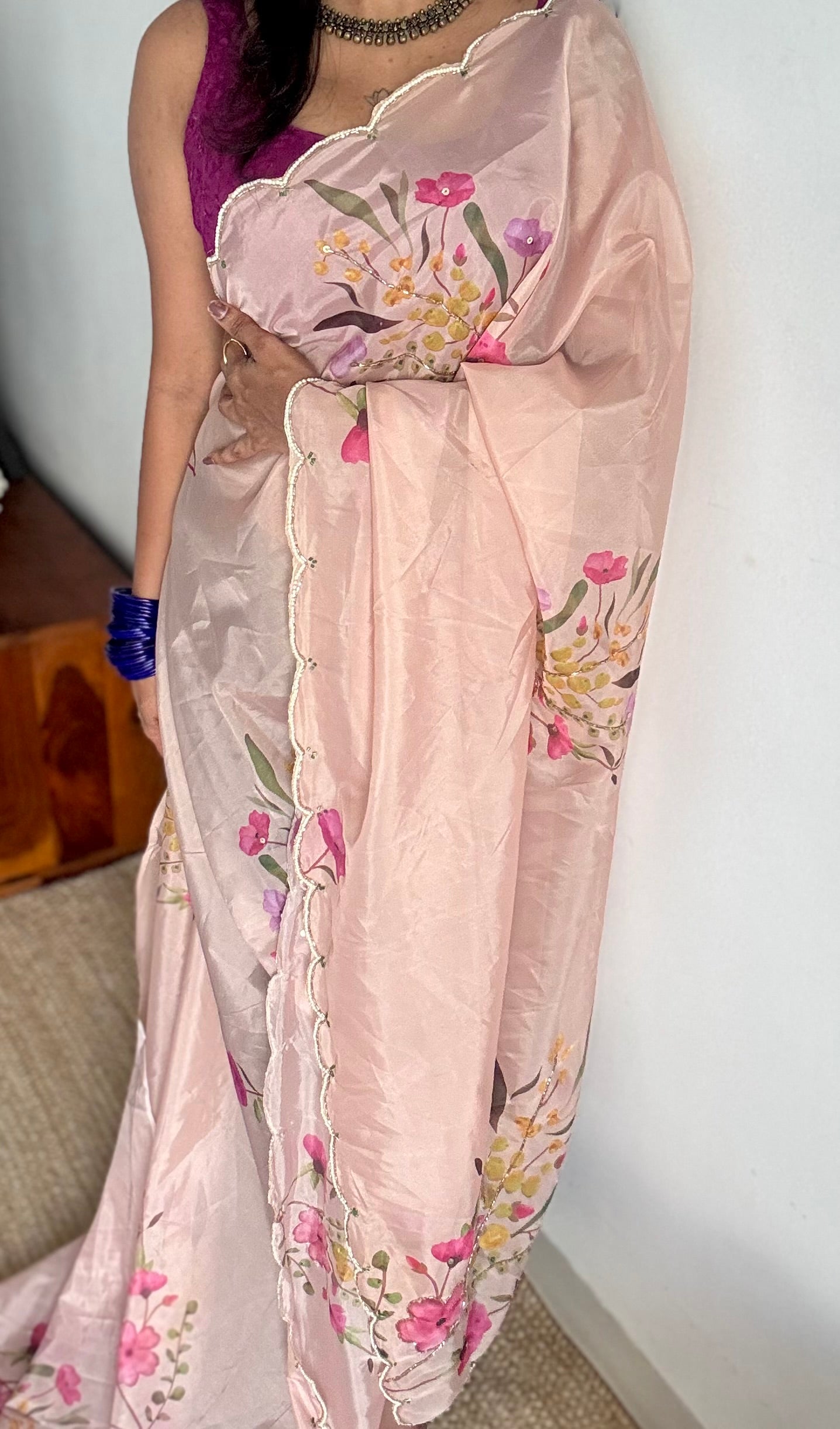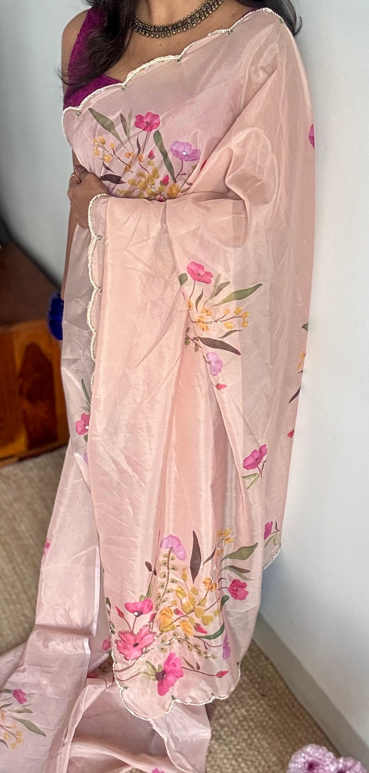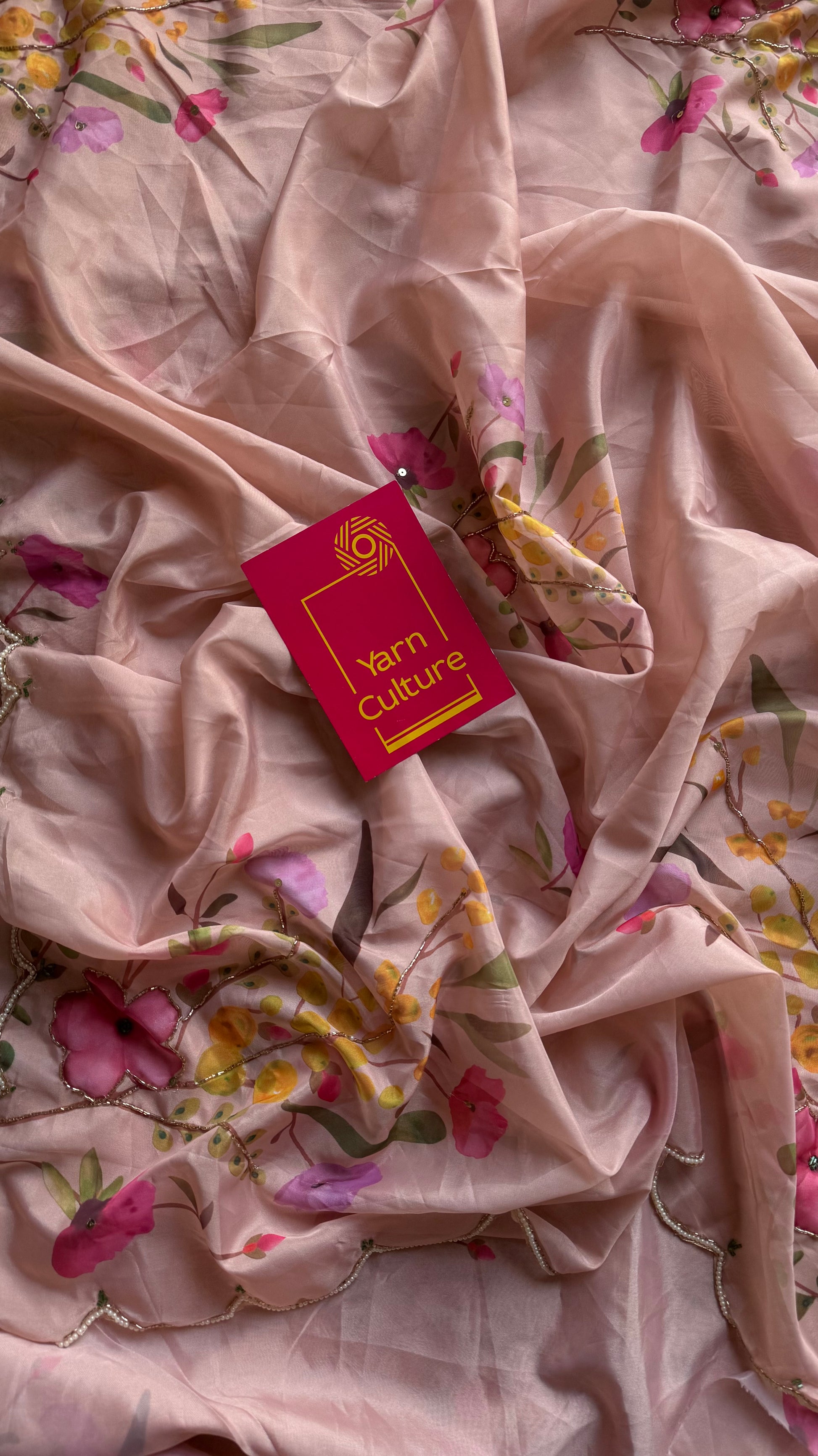 A delicate peach tabby silk saree with hand-embellished floral designs using sequins and beads. Finished with a scalloped border adorned with pearl-toned beads, soft, dreamy, and full of blooming charm.