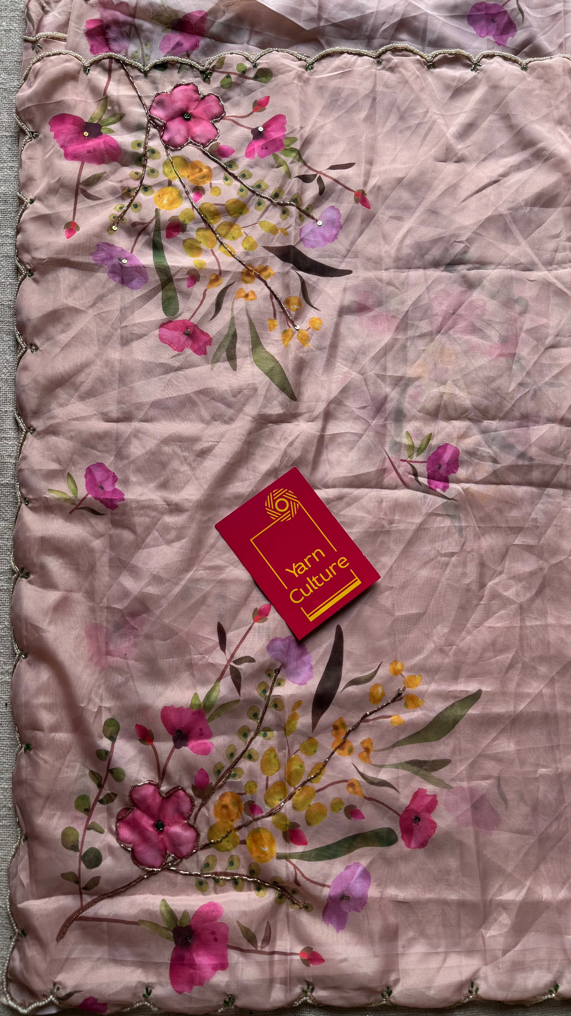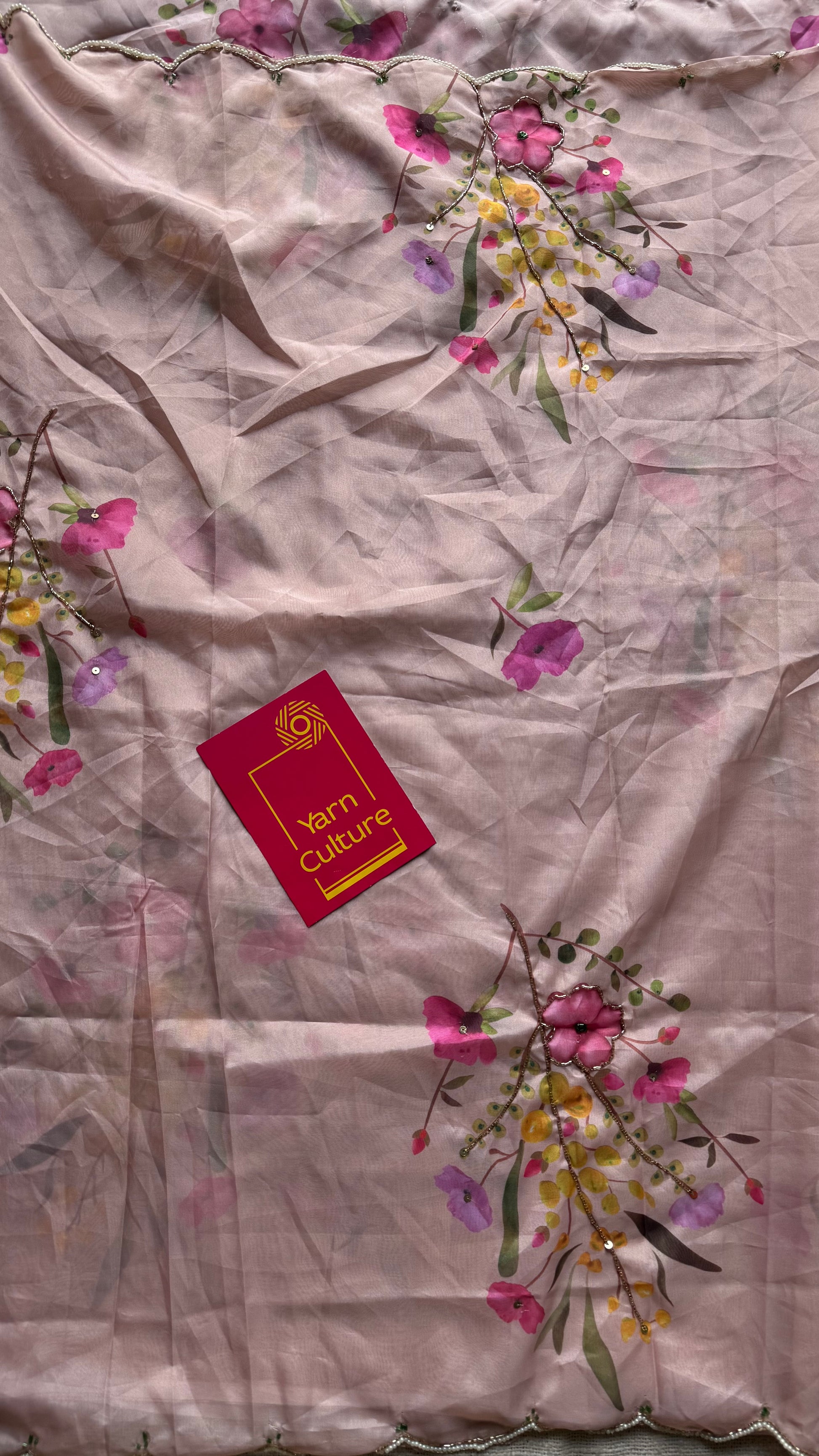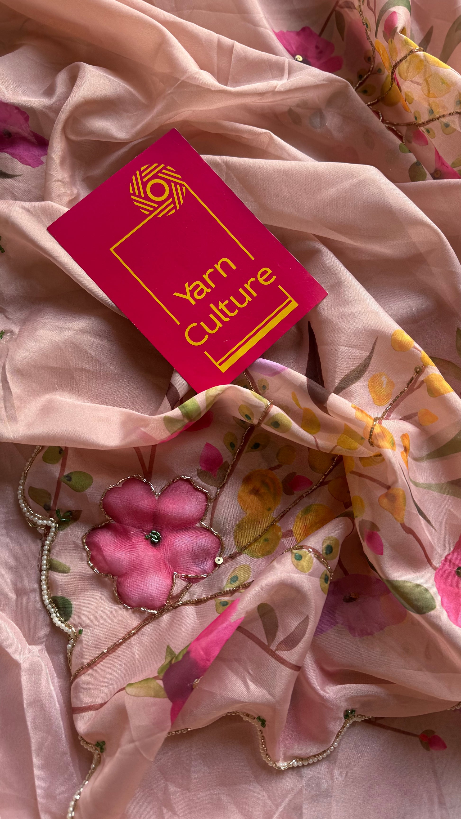 A delicate peach tabby silk saree with hand-embellished floral designs using sequins and beads. Finished with a scalloped border adorned with pearl-toned beads, soft, dreamy, and full of blooming charm.