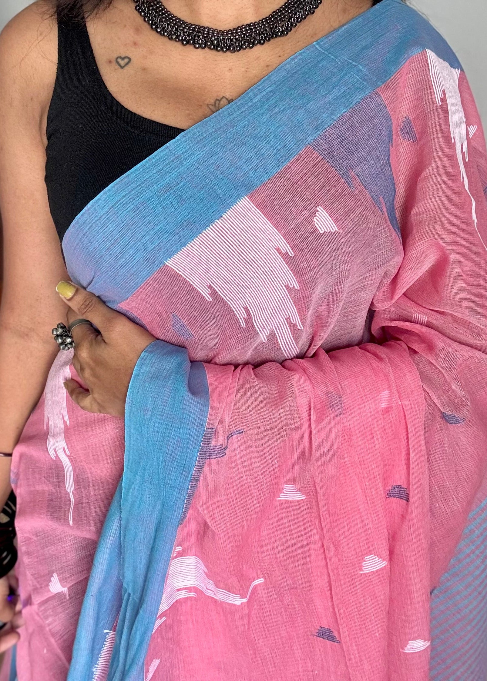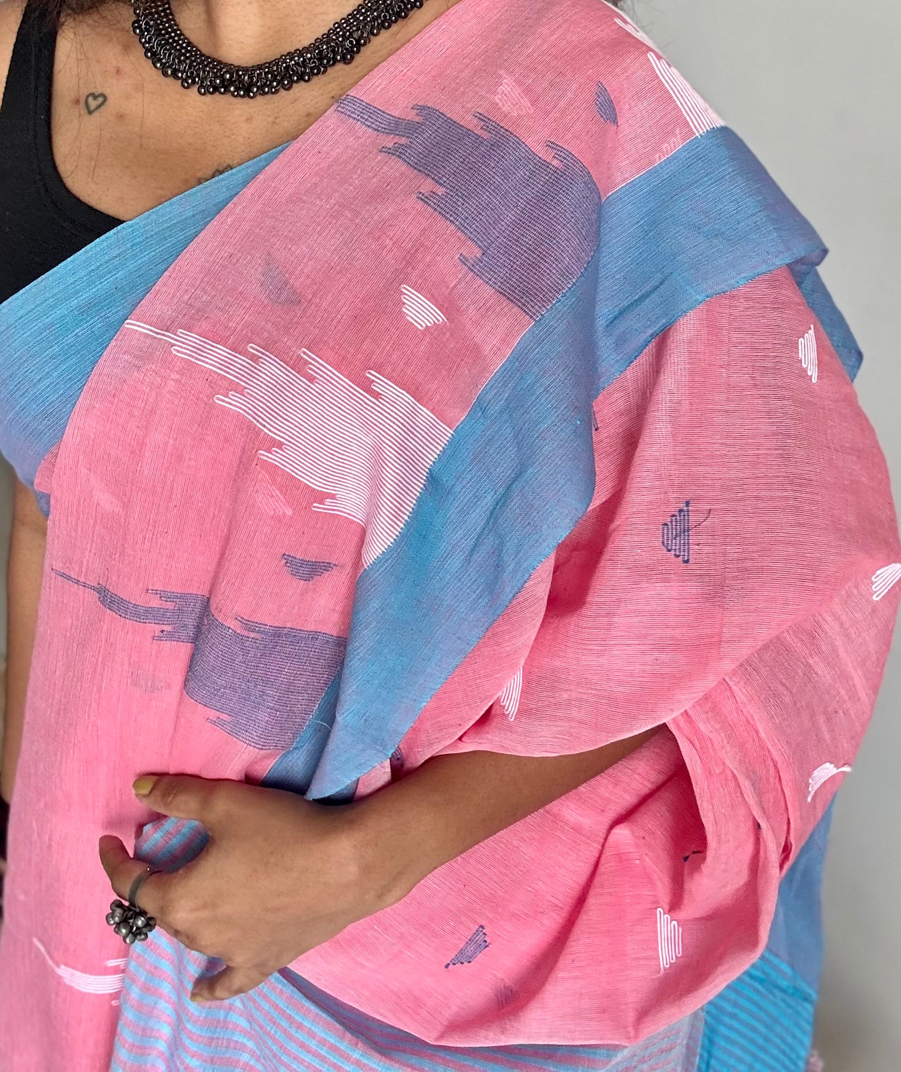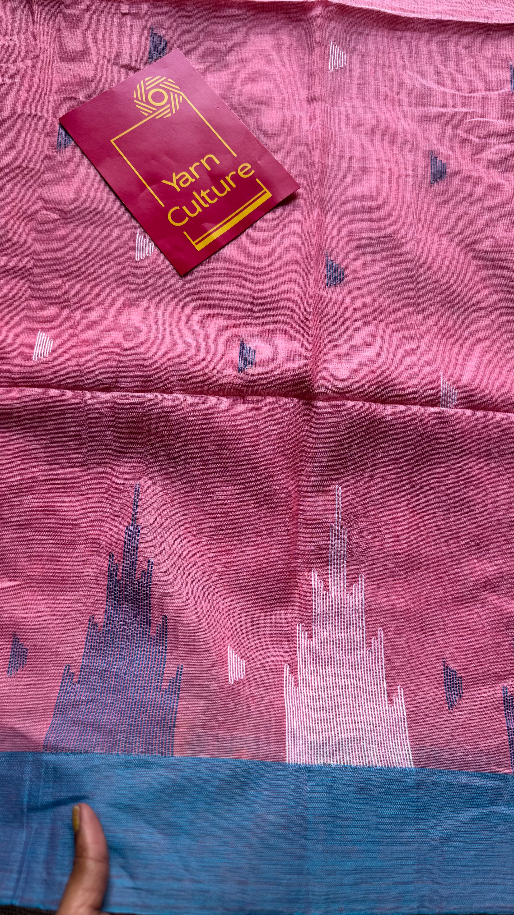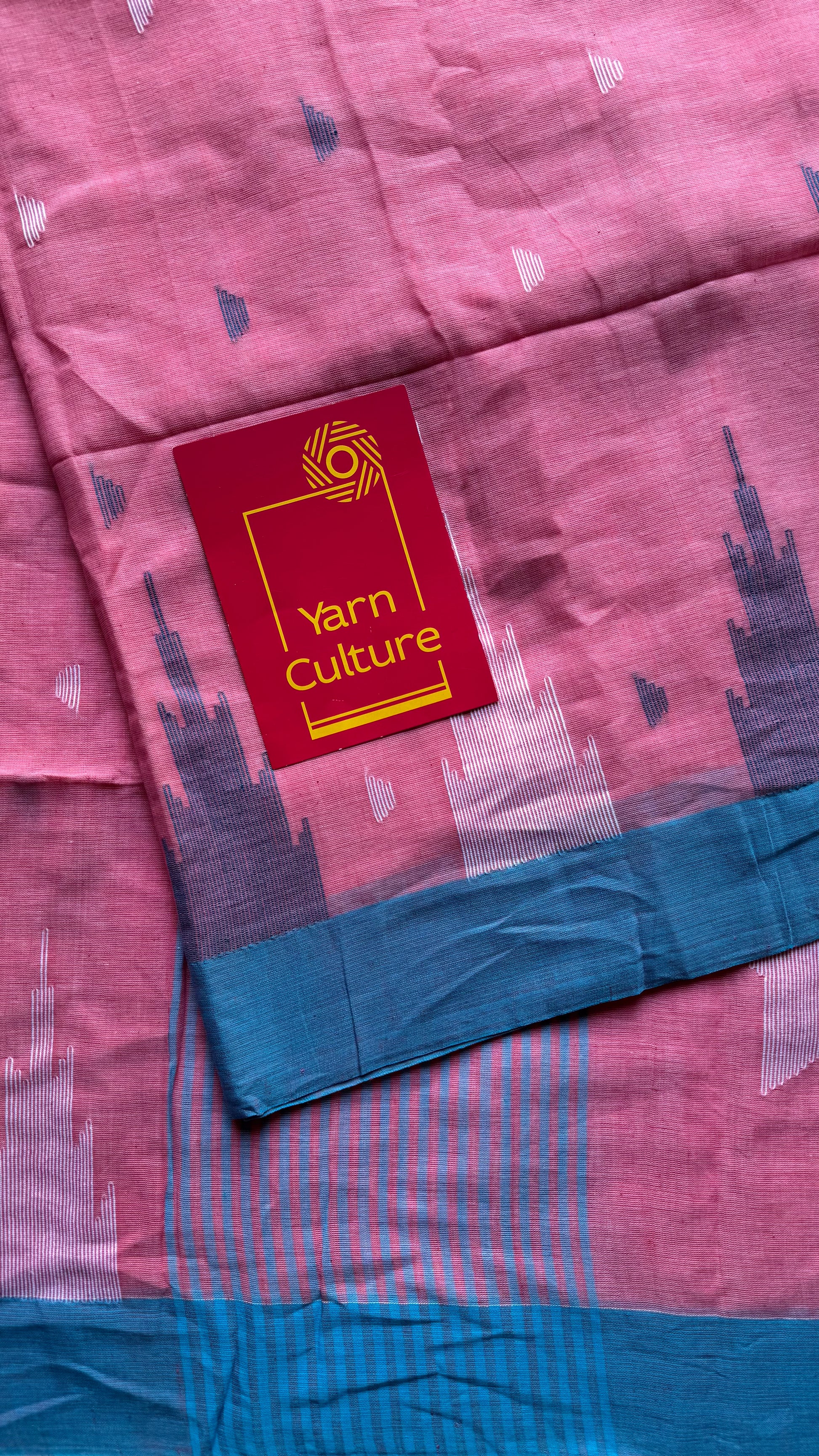 Peach pink with blue borders, temple motif woven threadwork, soft cotton. Soft, easy to drape, classy.