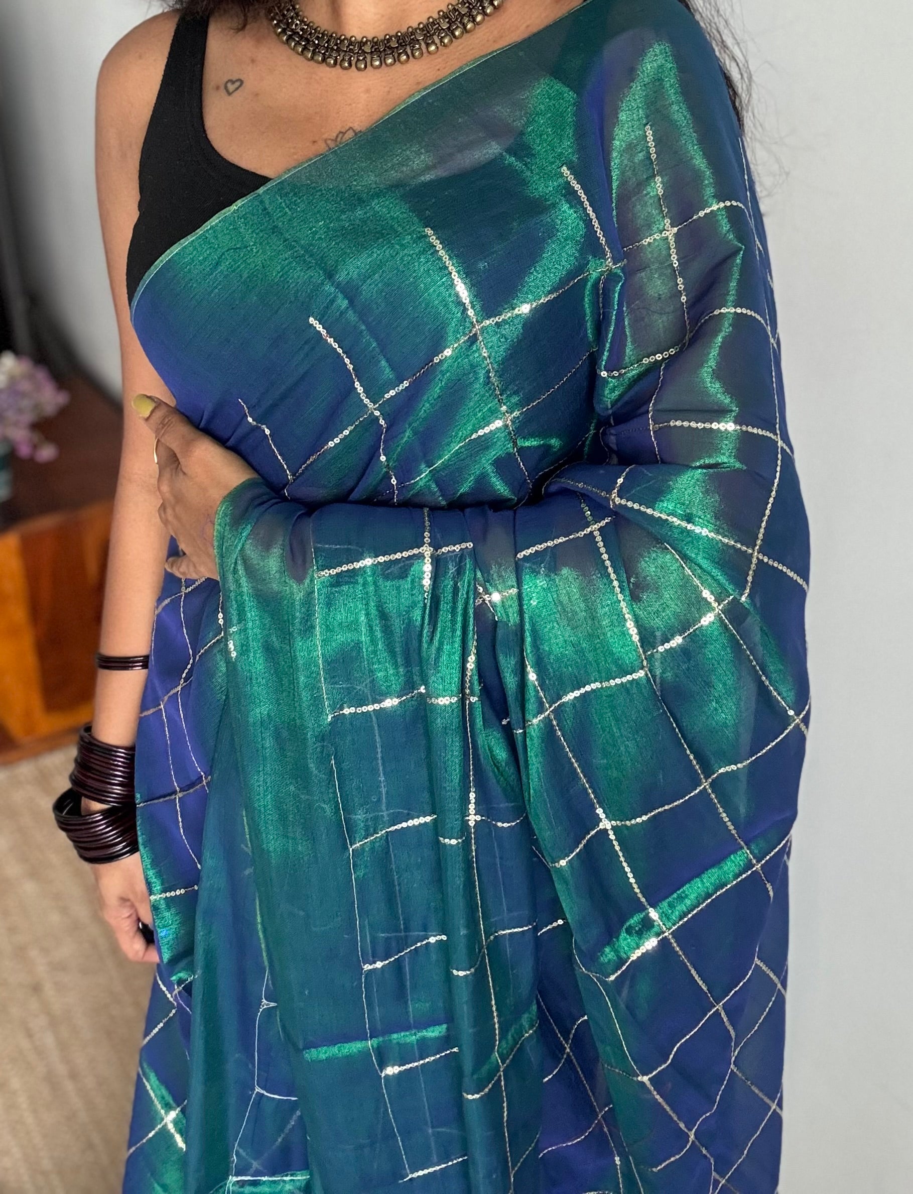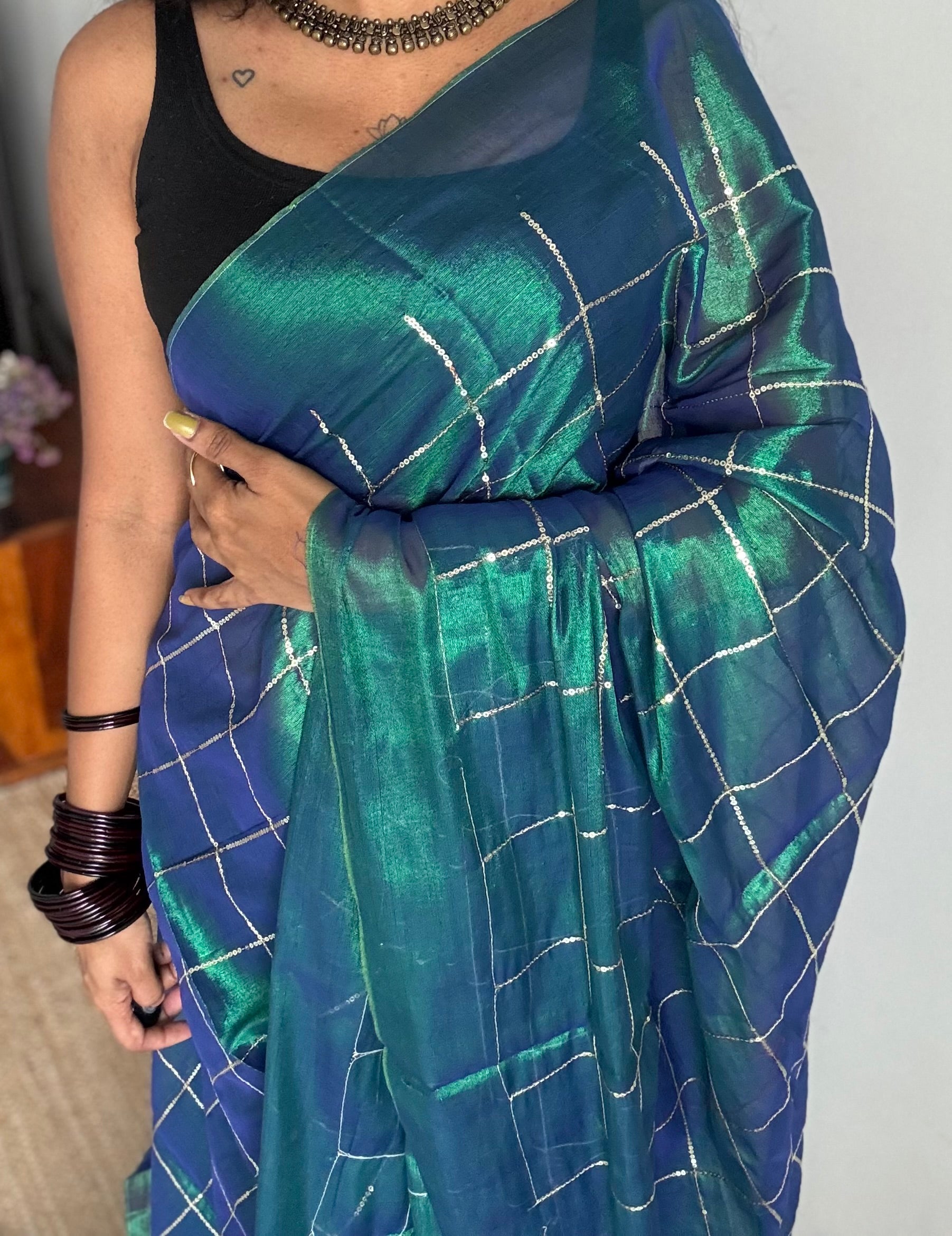 Metallic mul tissue with checkered sequins work, soft, easy to drape, light weight, simple and elegant.