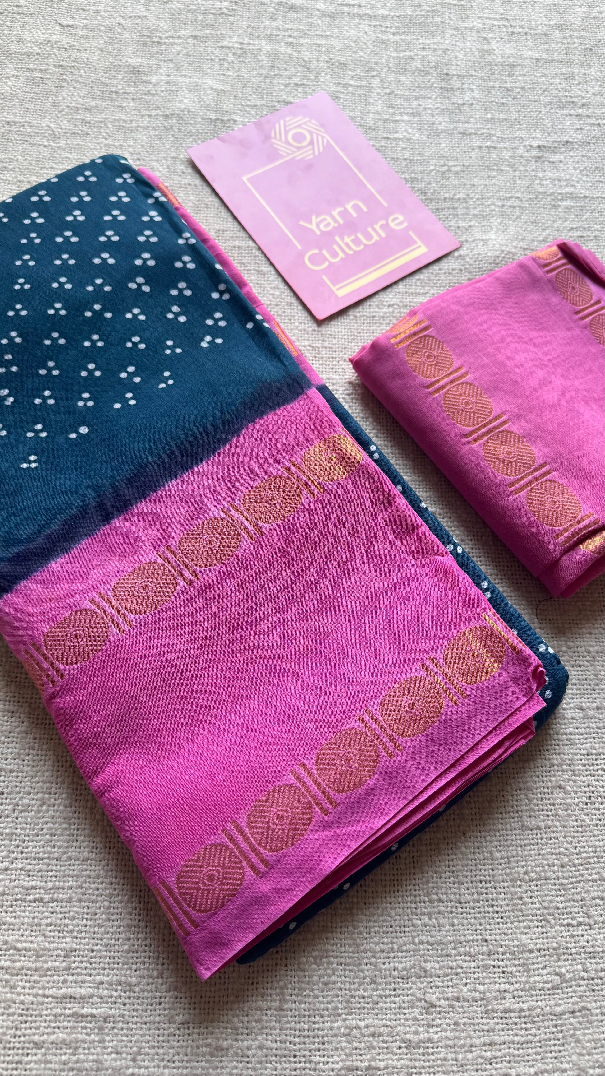 Peacock blue with pink contrast border, kattuchayam dyed madurai sungudi cotton saree - YCCOTNMSFE84
