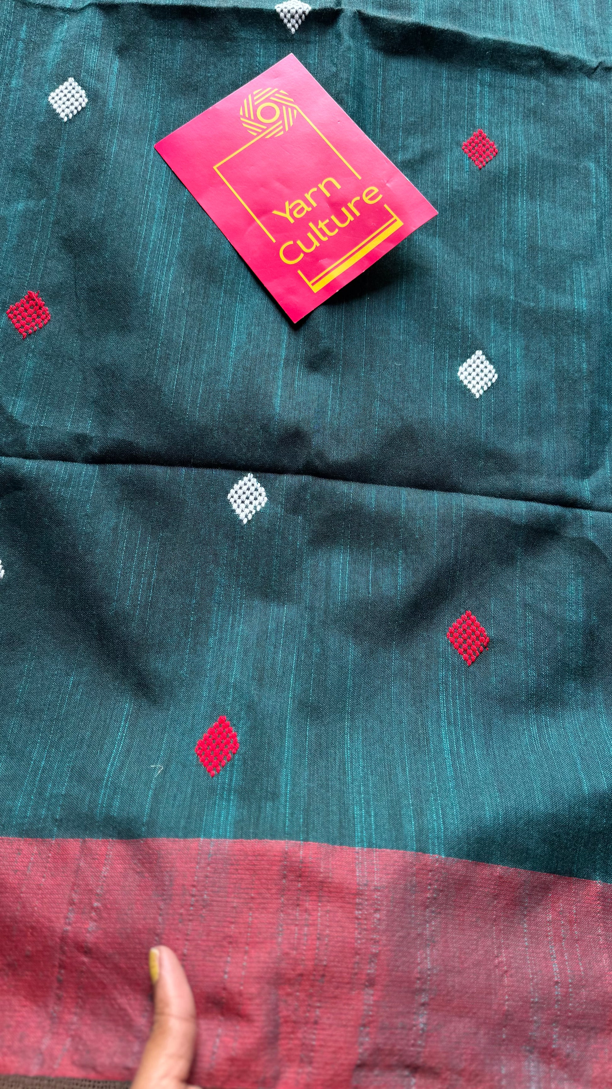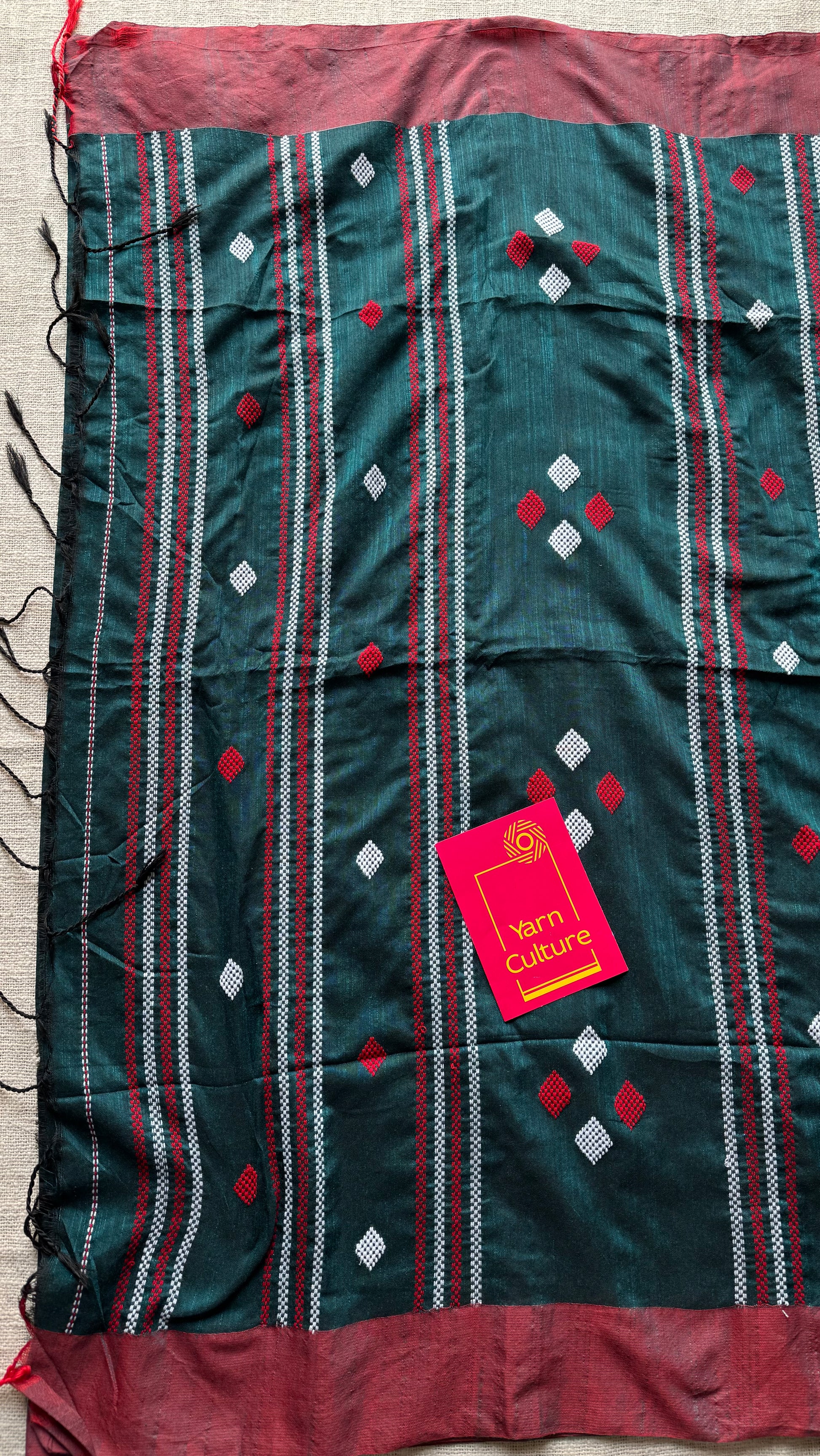Peacock green with burnt red, soft khadi cotton with woven motifs. Soft, easy to drape, classy.
