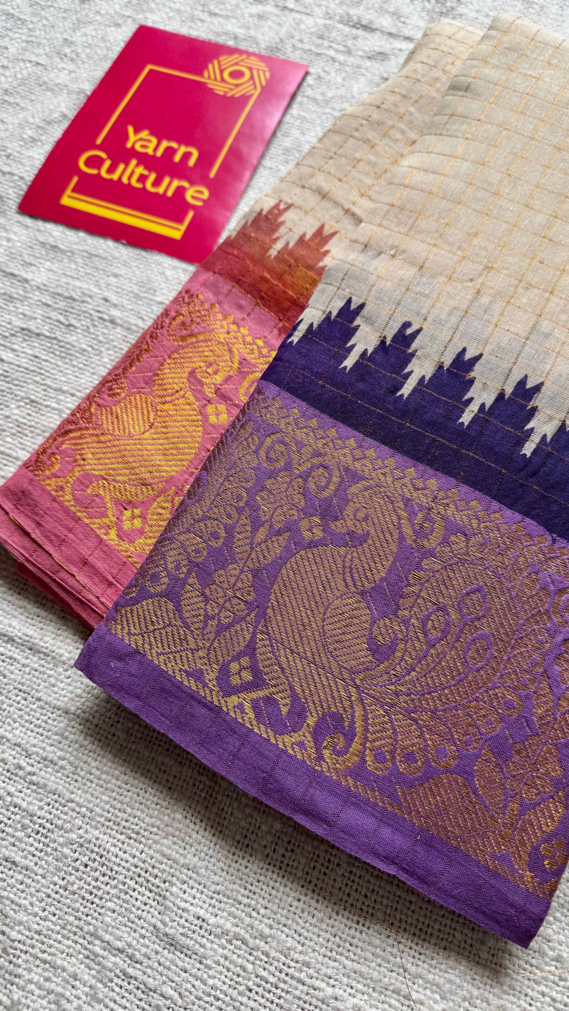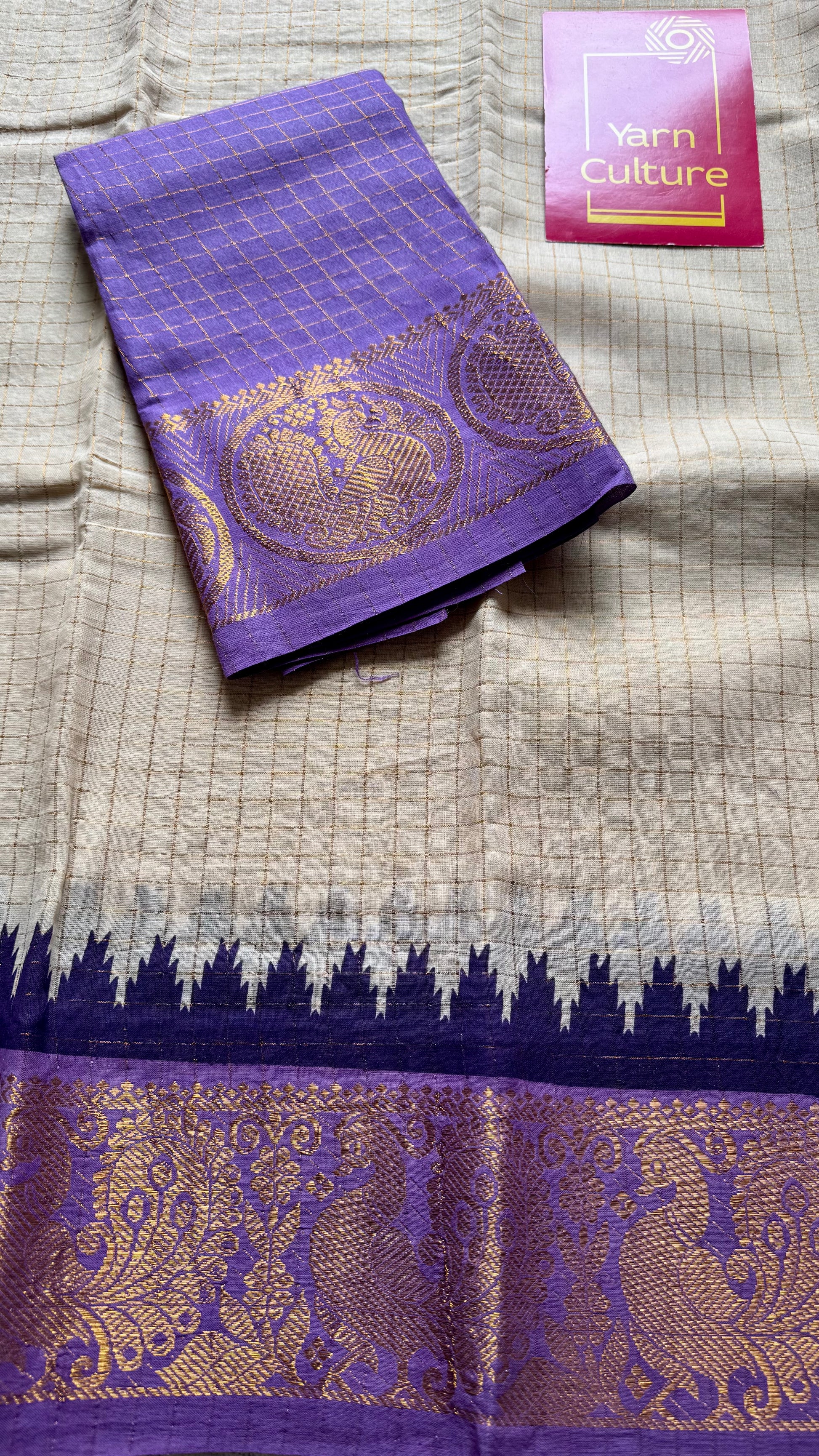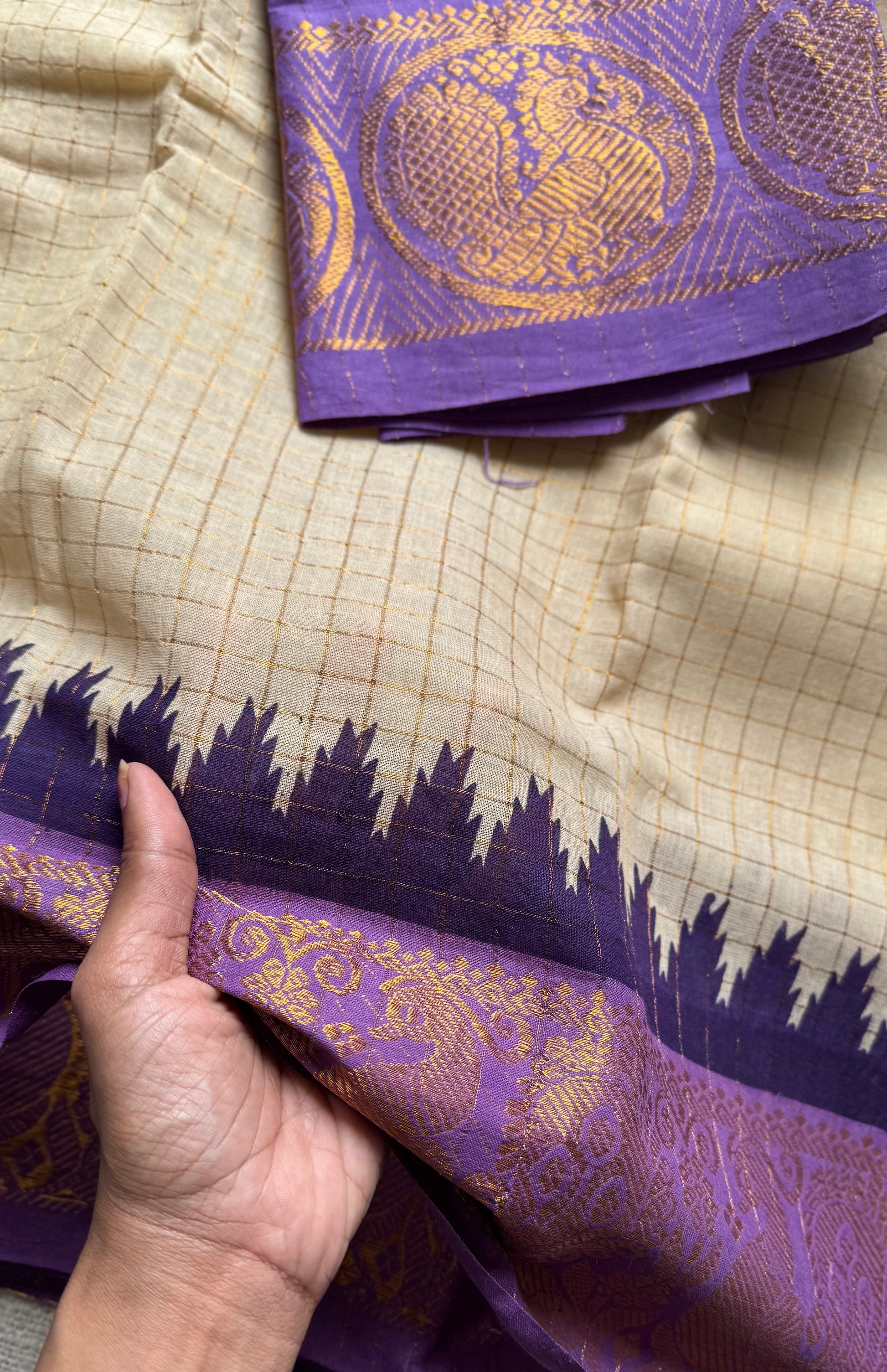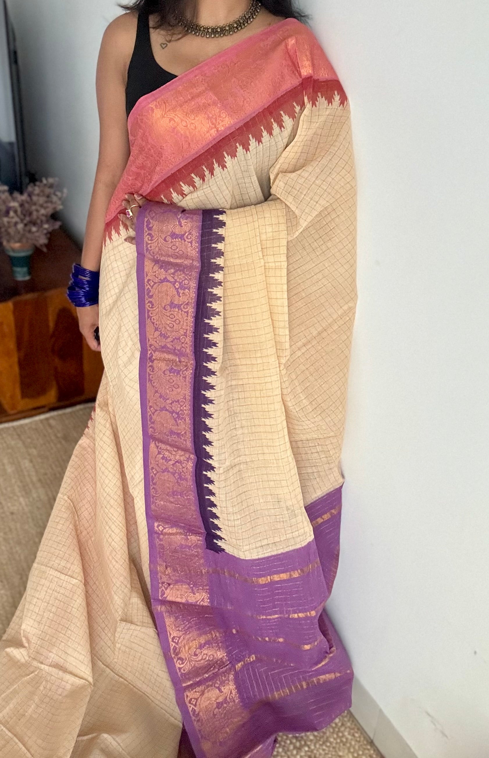 Soft Madurai Sungudi cotton with classic kattam checks and a striking dual border - pink on one side and light violet on the other, with peacock motifs. Body is sandal shade not off white.