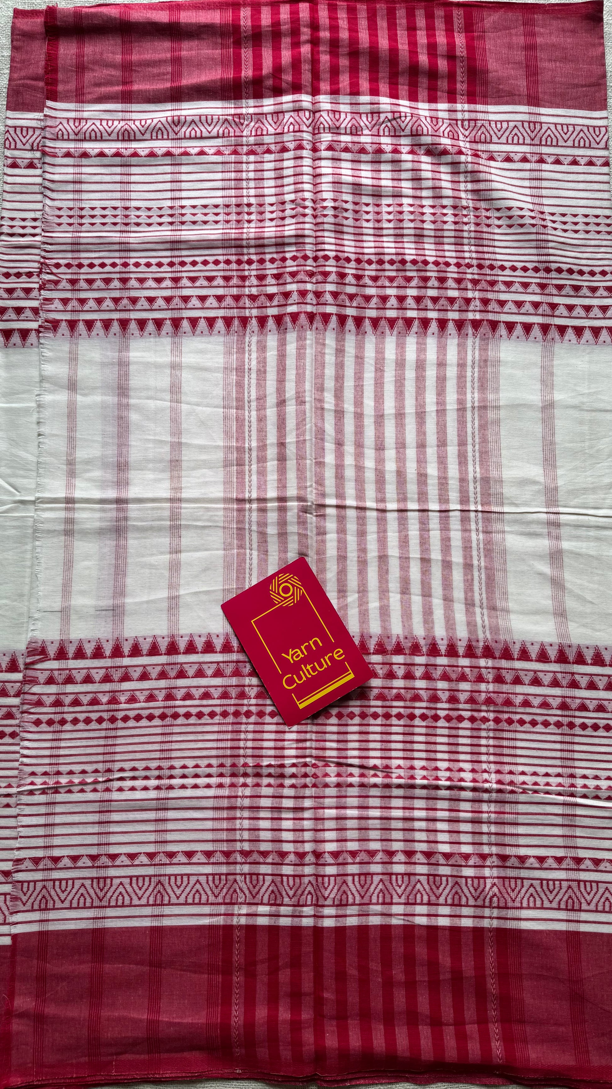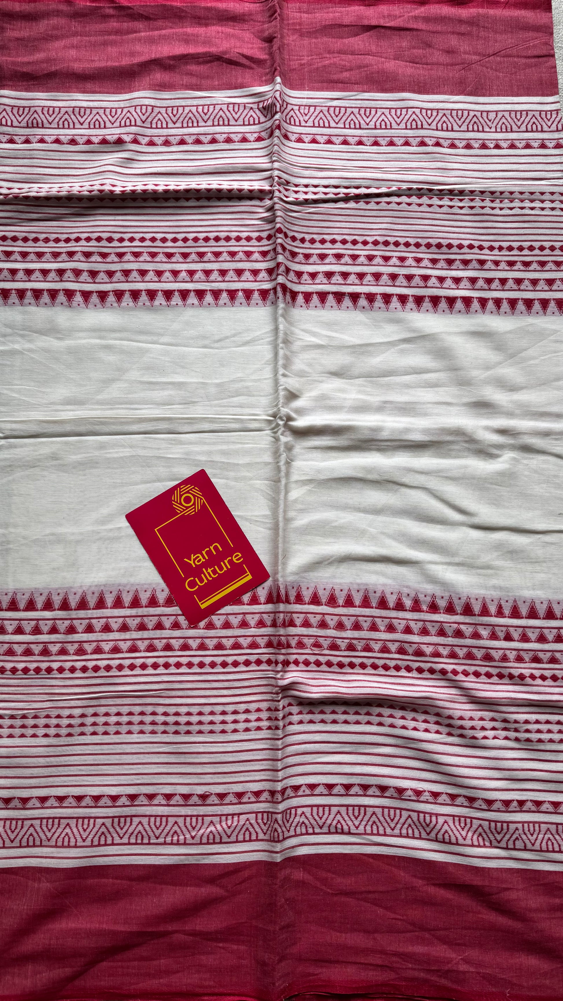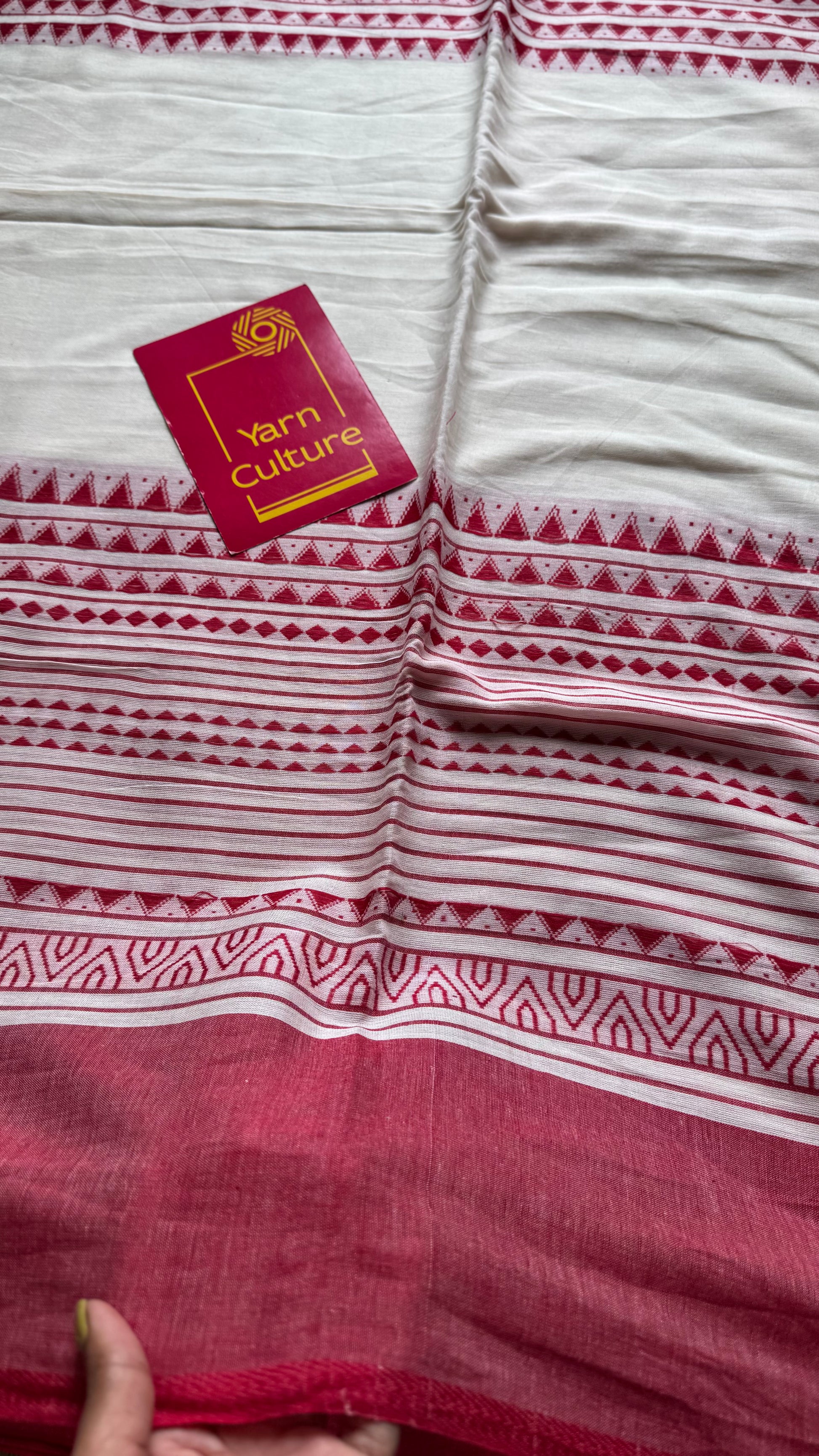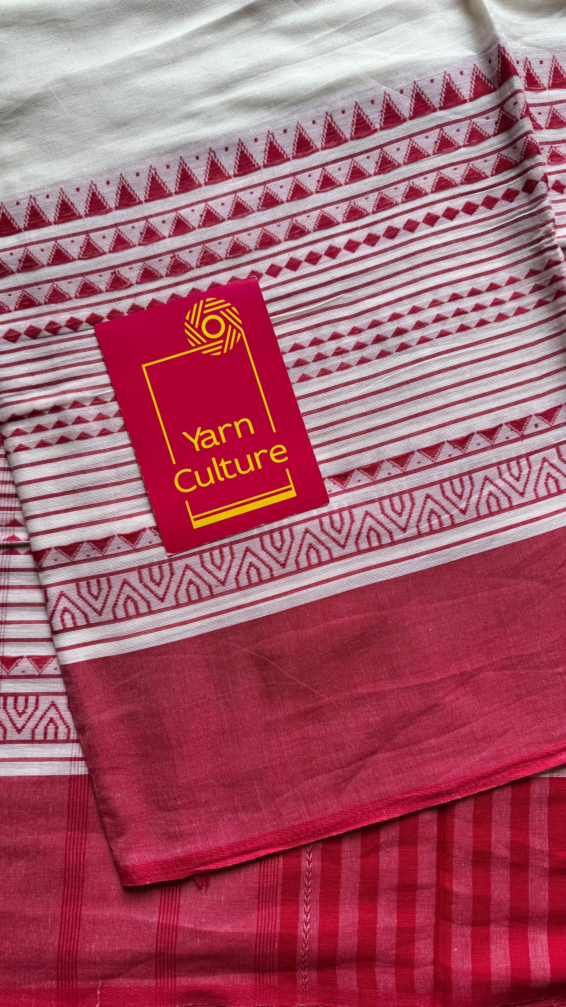 Pure Dhaniakhali tant in white with red patterened border - YCBCDP22