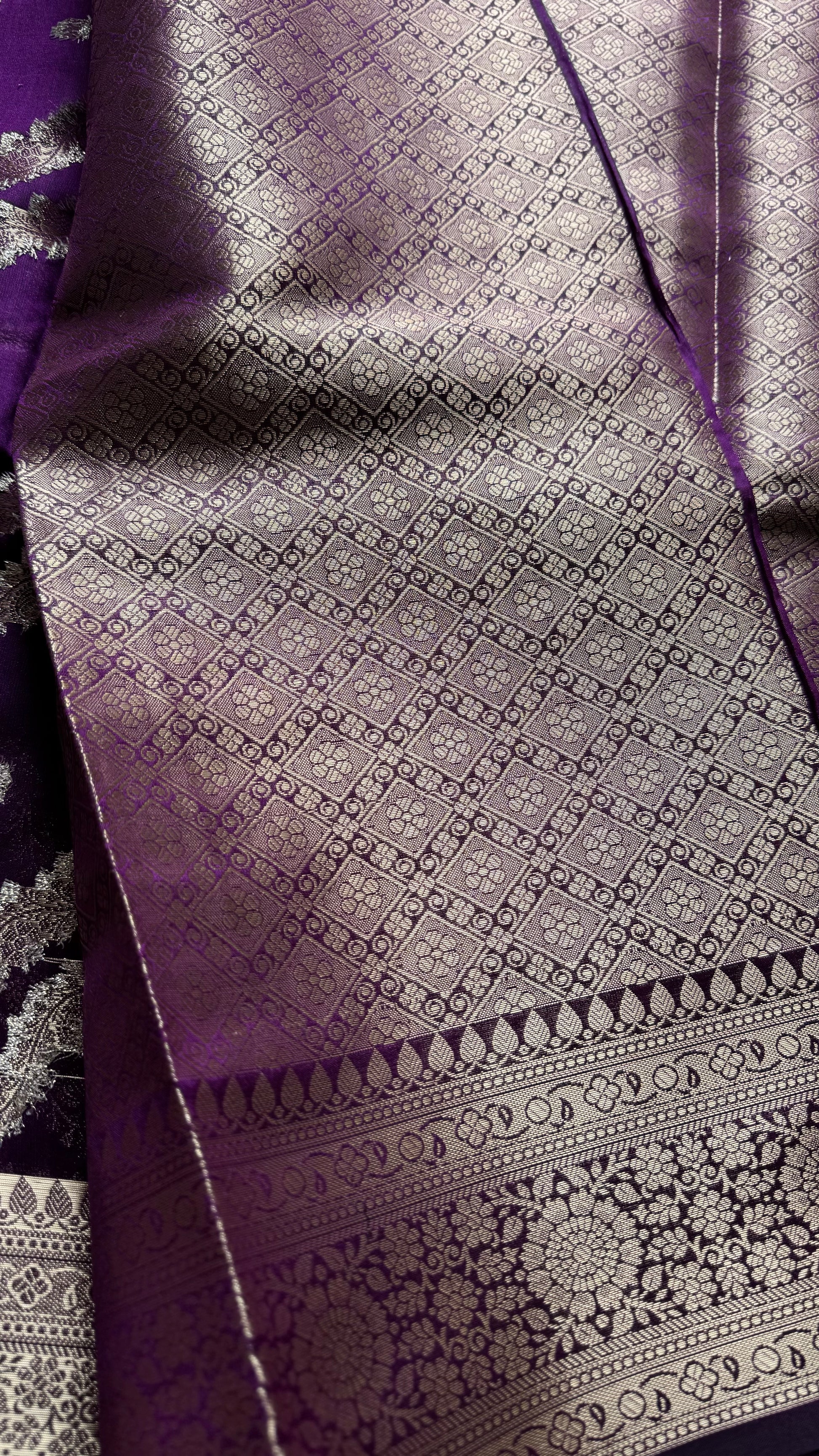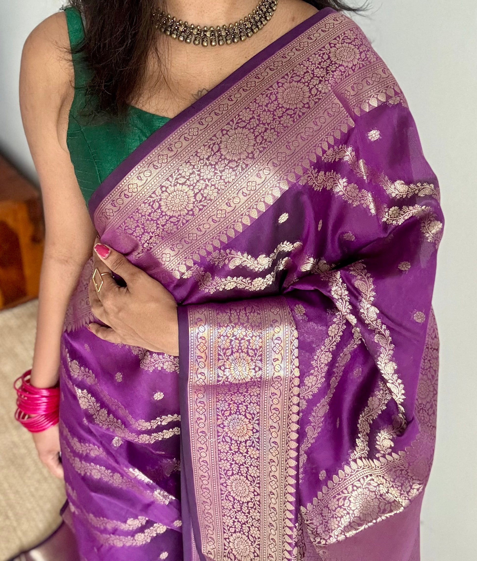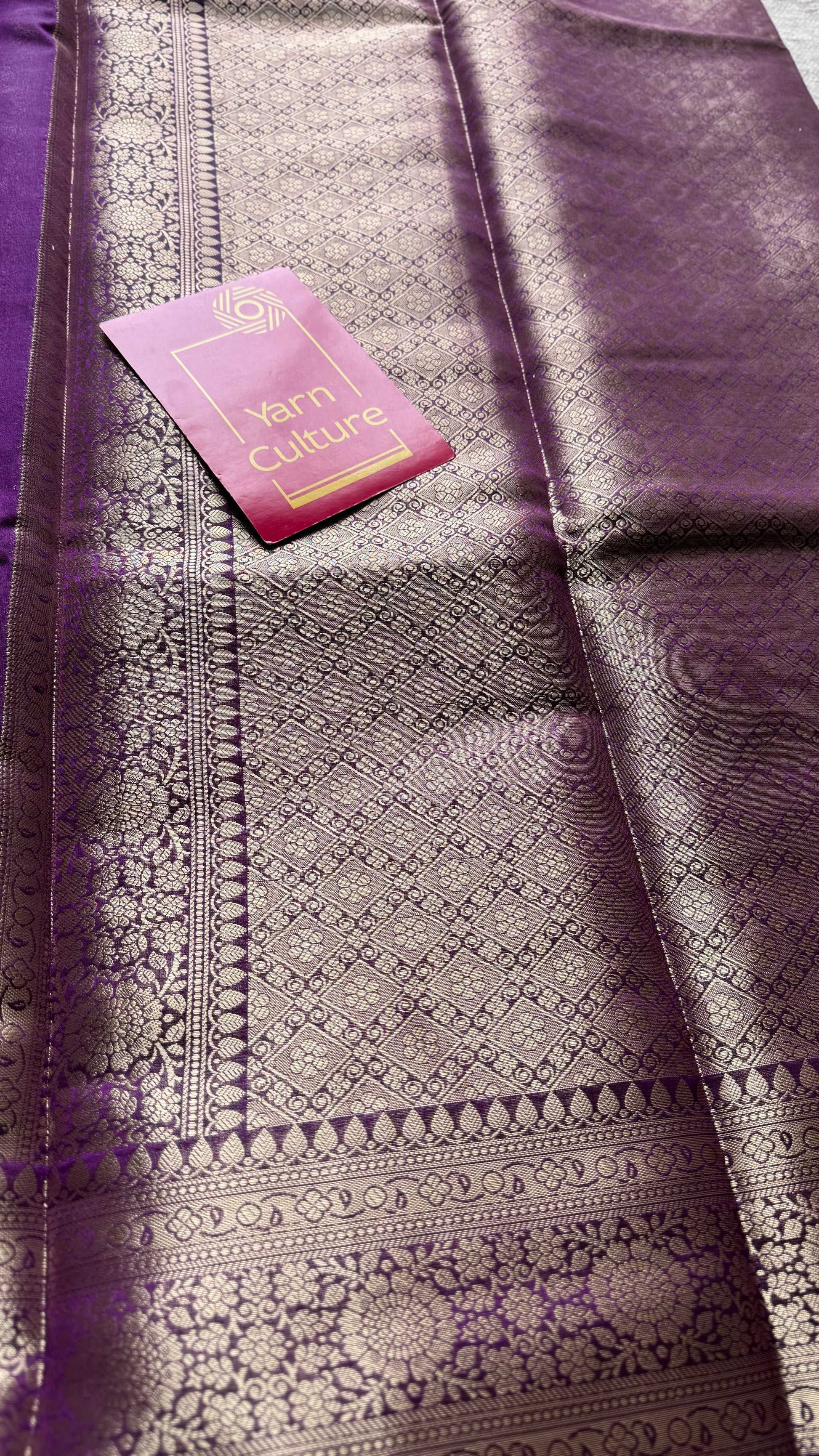 Purple double floral zari pattern in antique gold - festive, timeless, and perfect for Diwali. Intricate pallu and blouse fabric. Effortless to drape, light to carry, and rich in look, this is a saree made to shine with you this season.