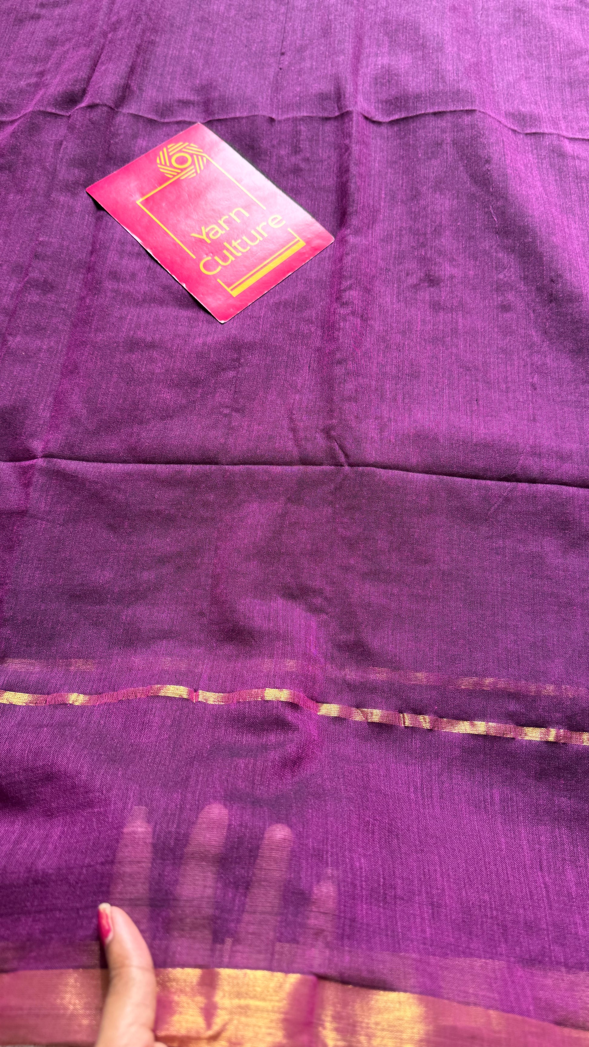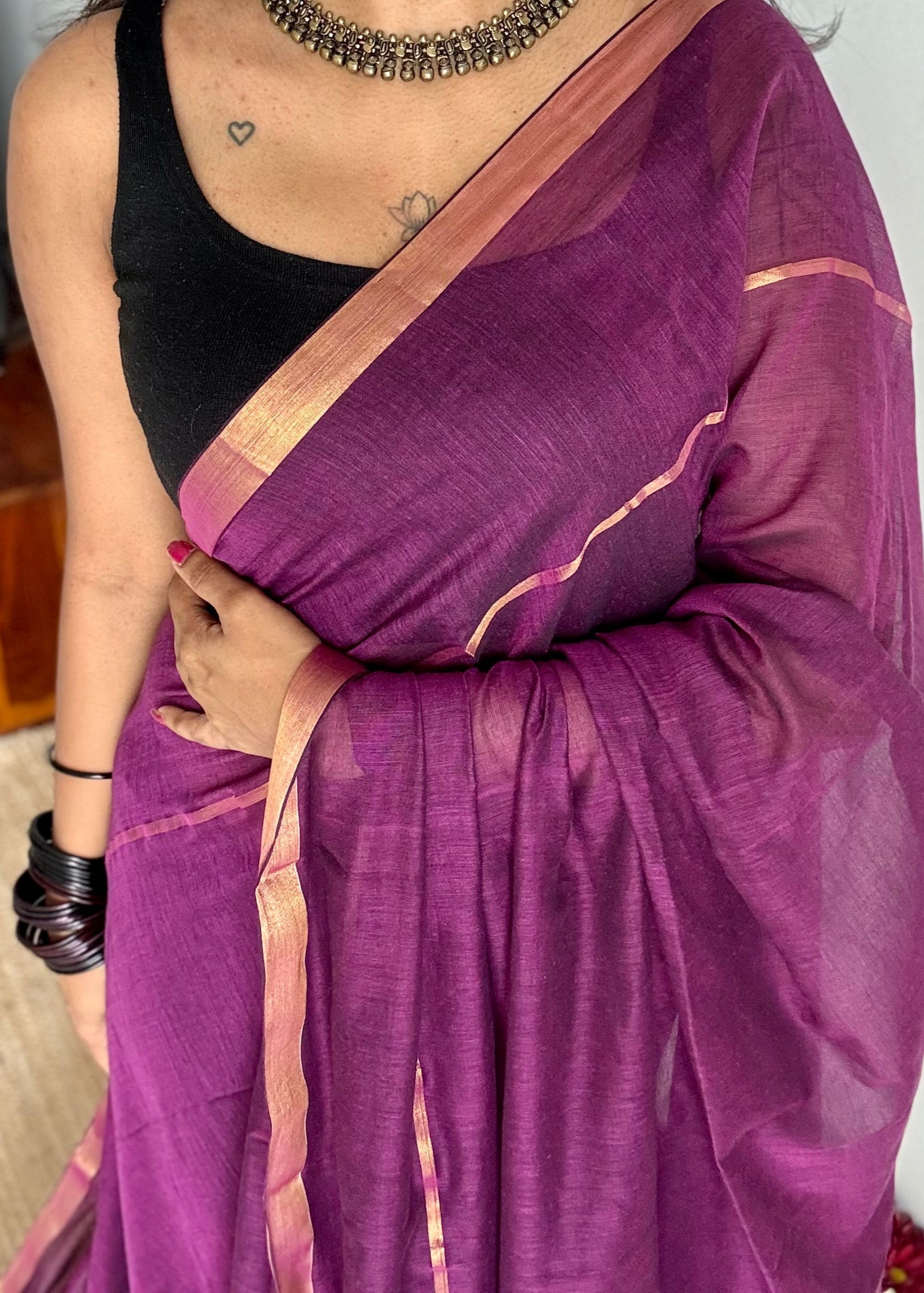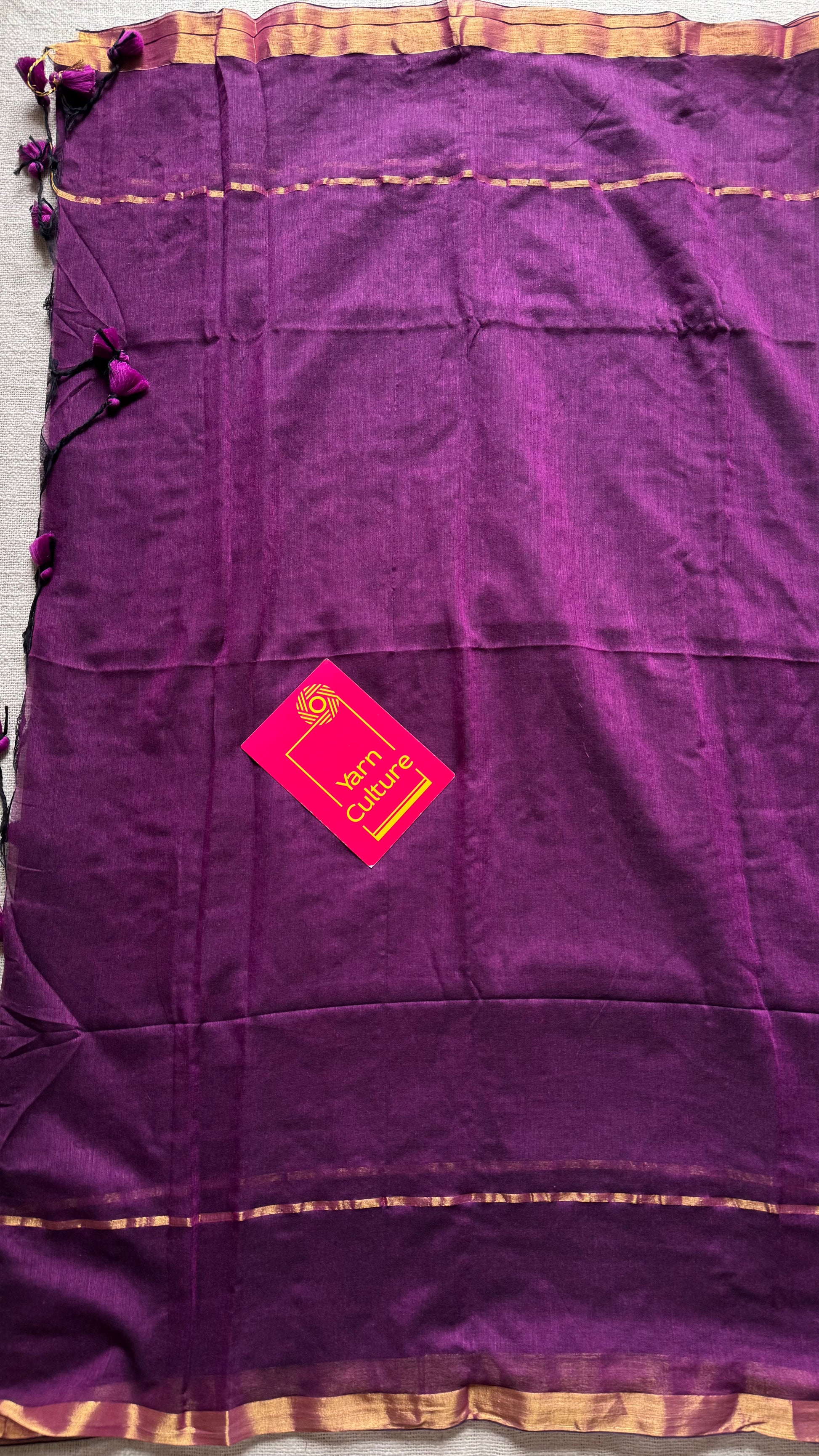 Everybody's favourite mul cotton in purple pink with antique gold zari in gap border pattern and with tassels.