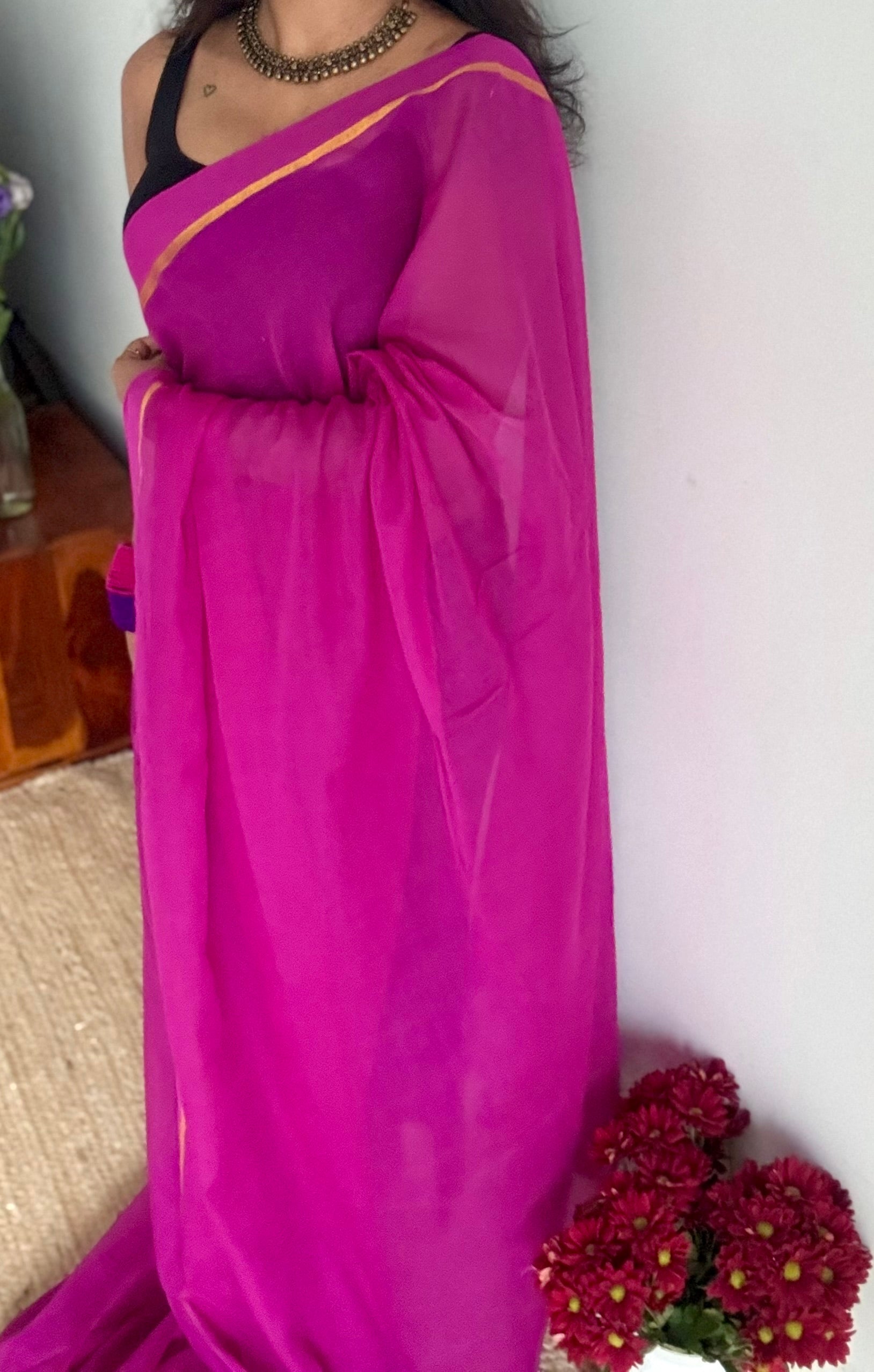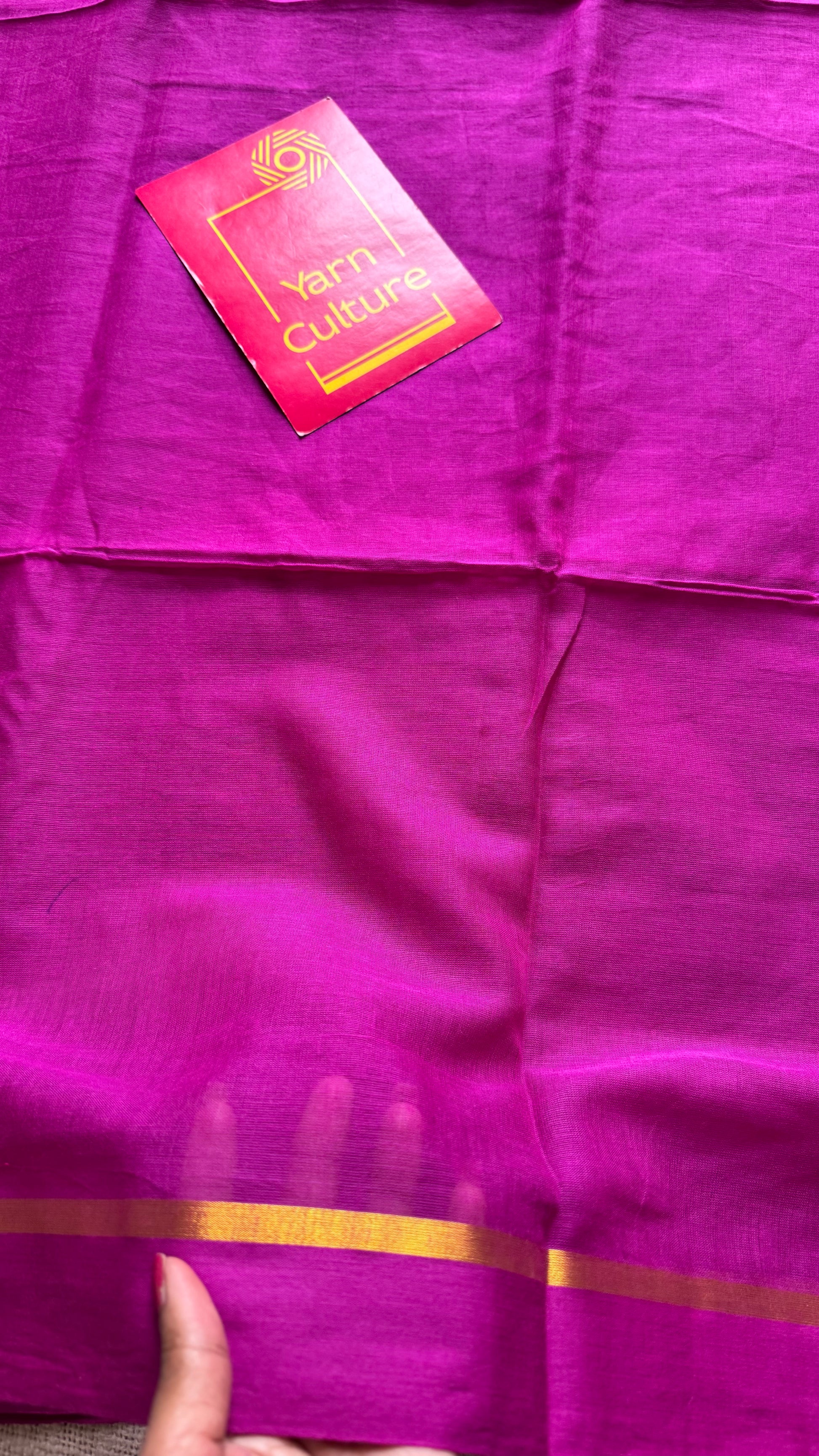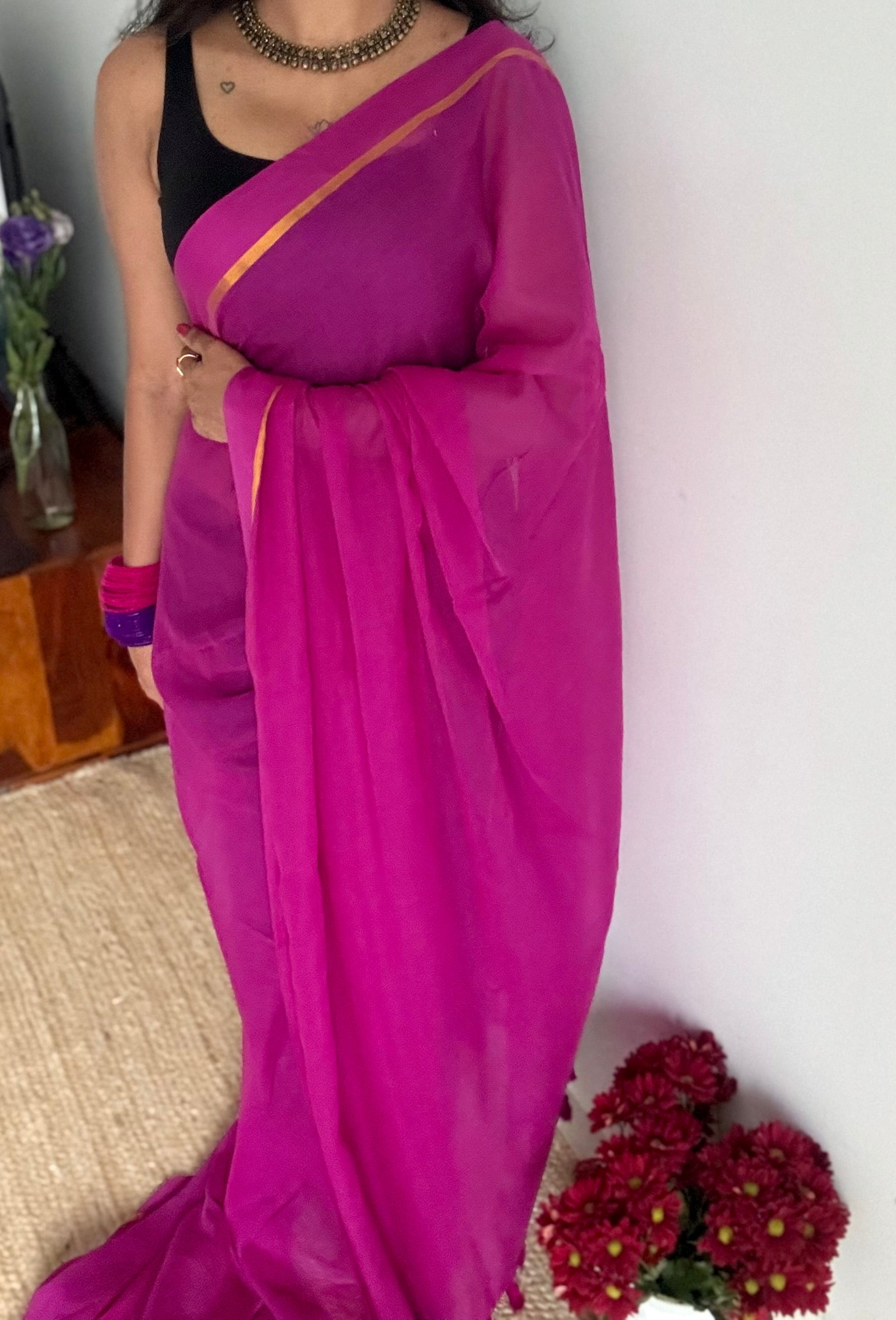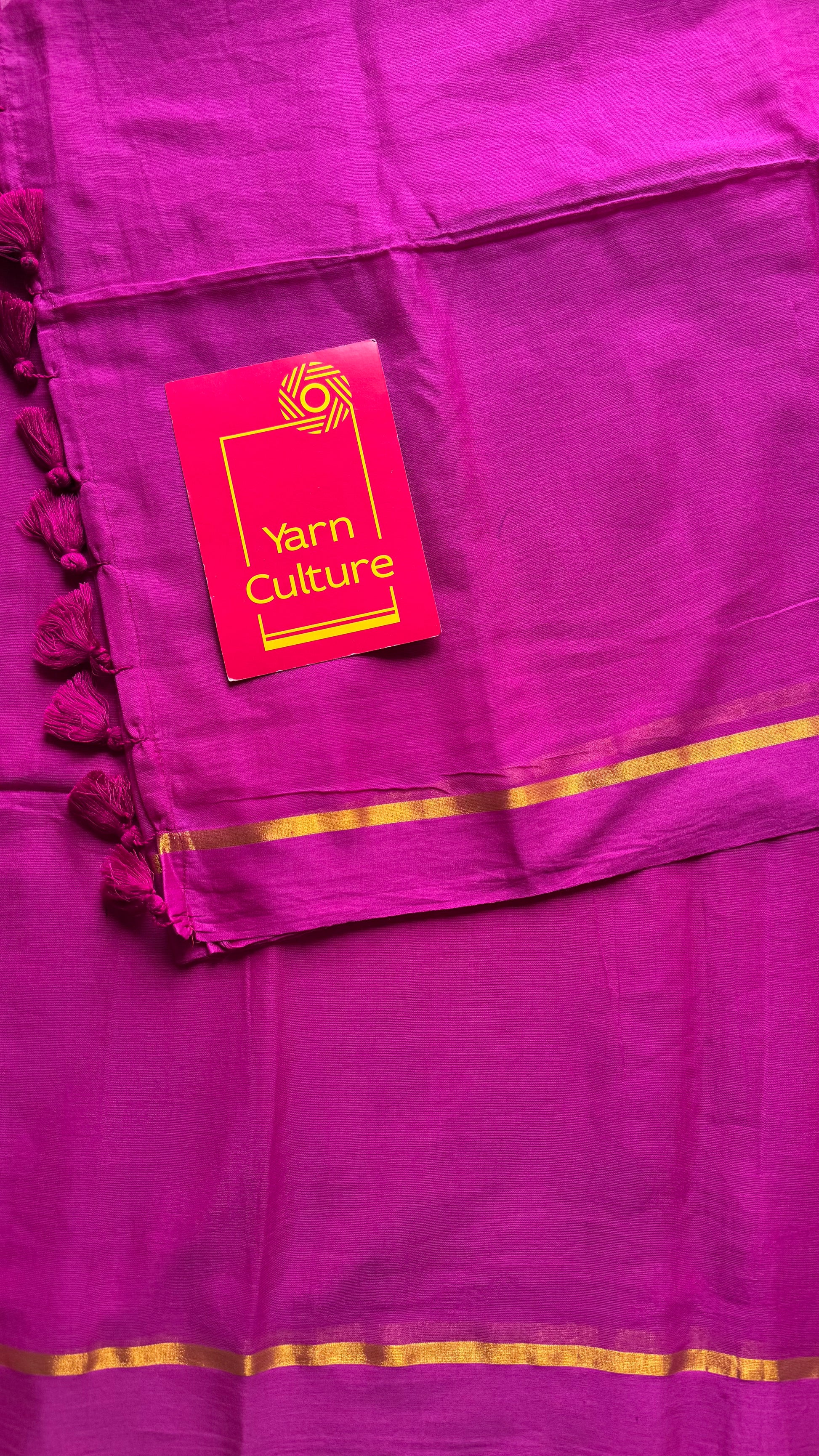 Everybody's favourite mul cotton in purple pink with thin antique gold zari gap border and with tassels.