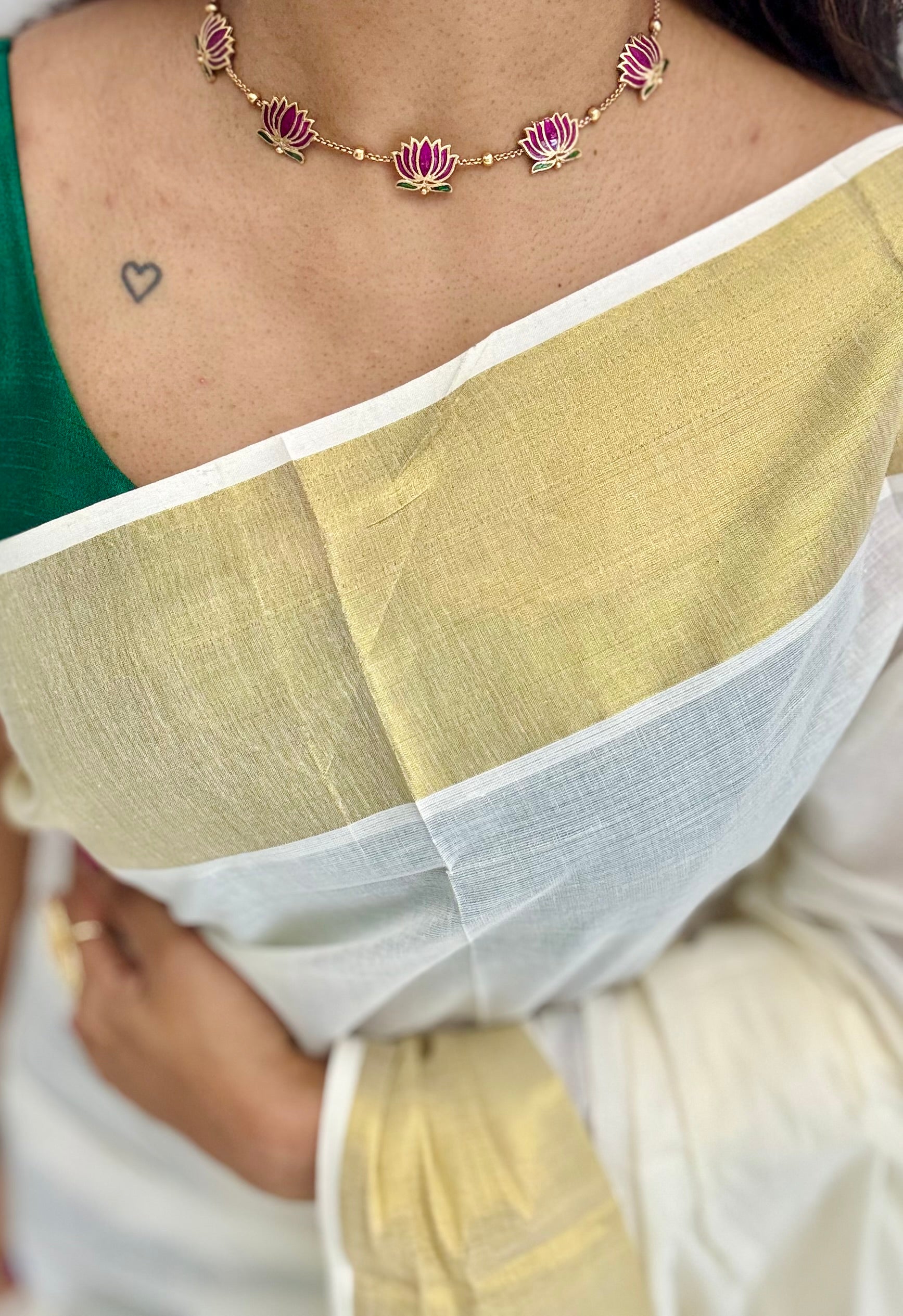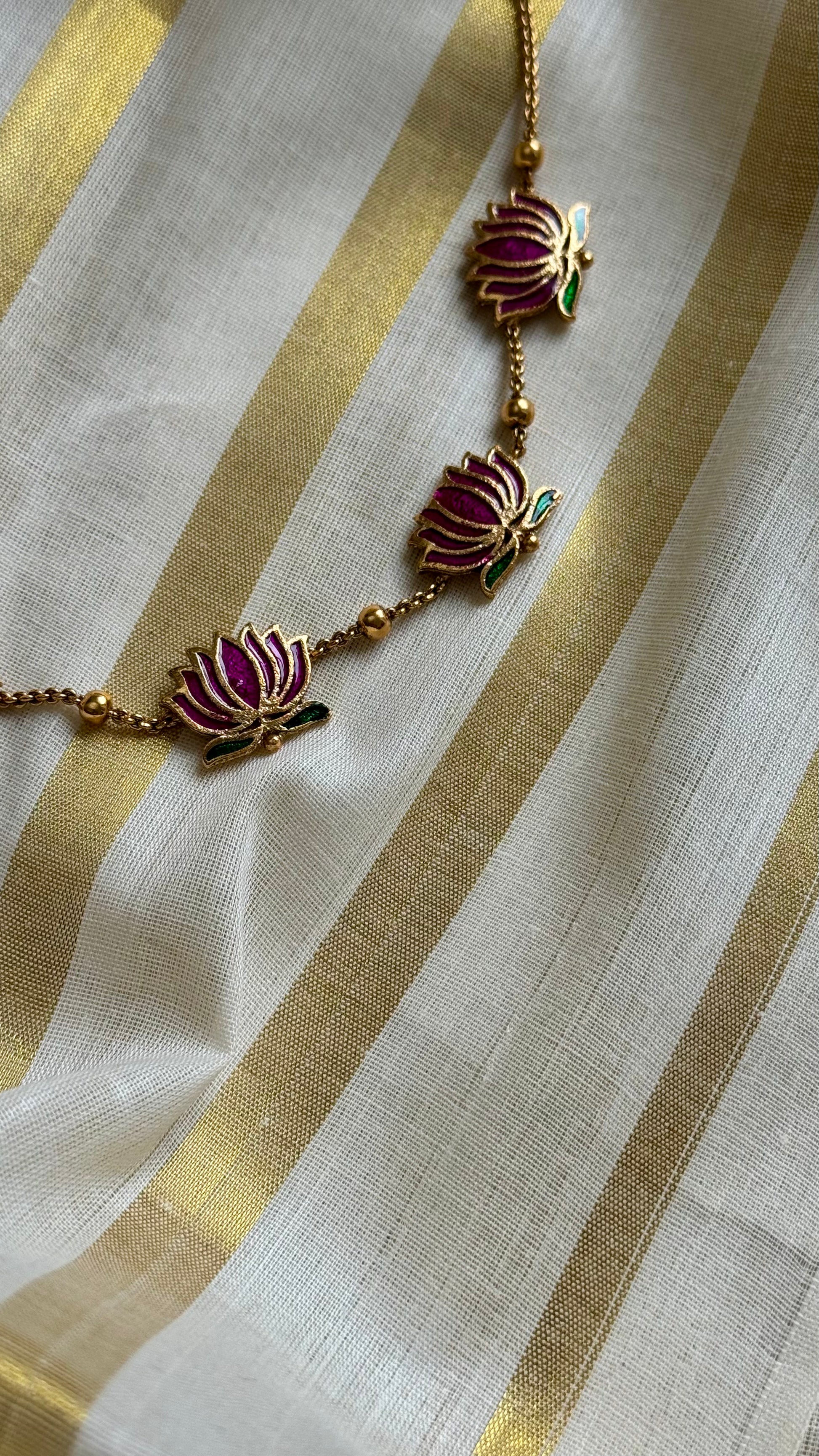 A pretty purple pink lotus on a necklace. Perfect with your Onam sarees or as a light, everyday piece.