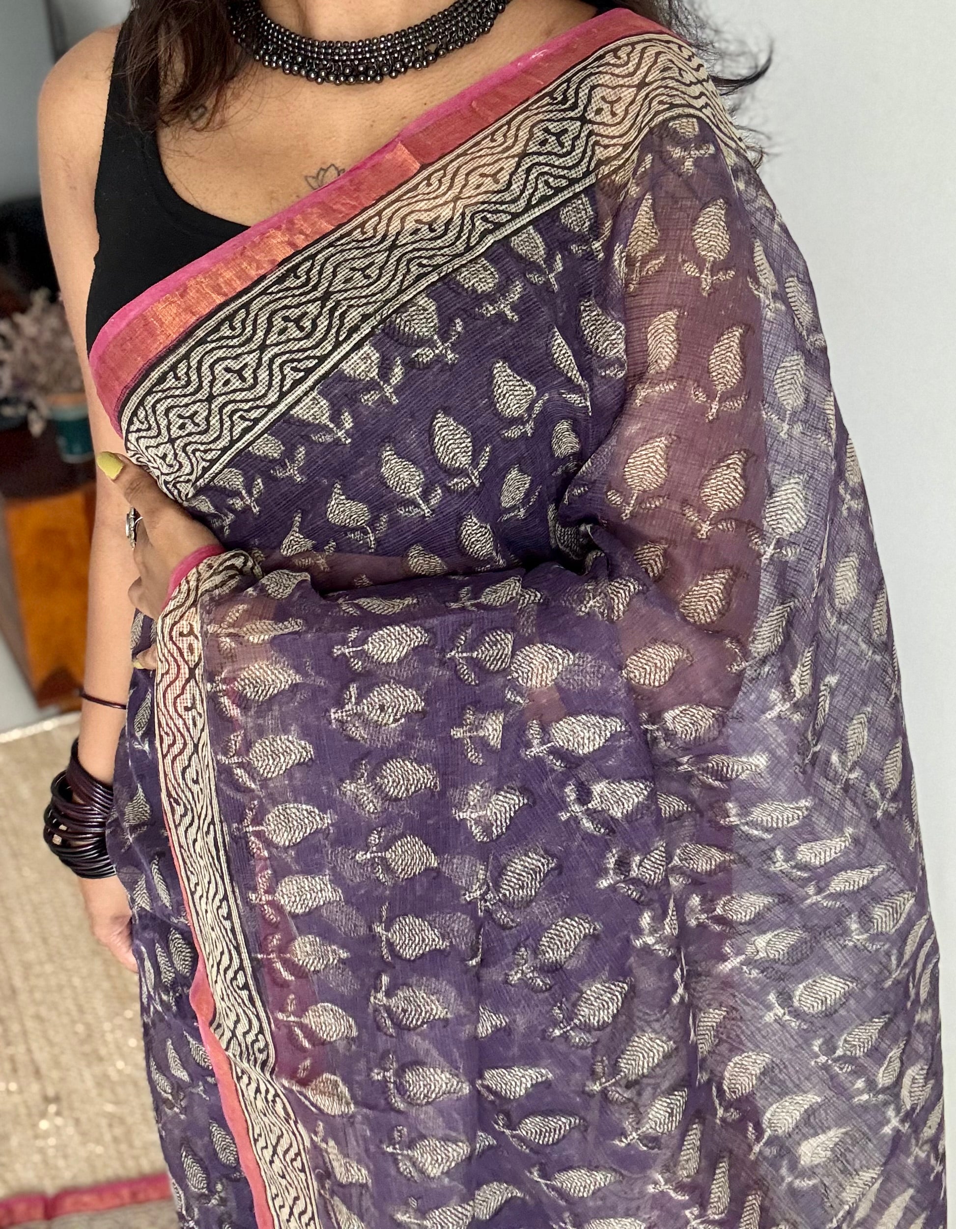 A rich purple canvas adorned with delicate beige paisleys, framed by a pink border brushed with antique gold zari. Raagmalika carries a regal rhythm, graceful, vibrant, and timeless, like the many notes that come together to create a perfect harmony.