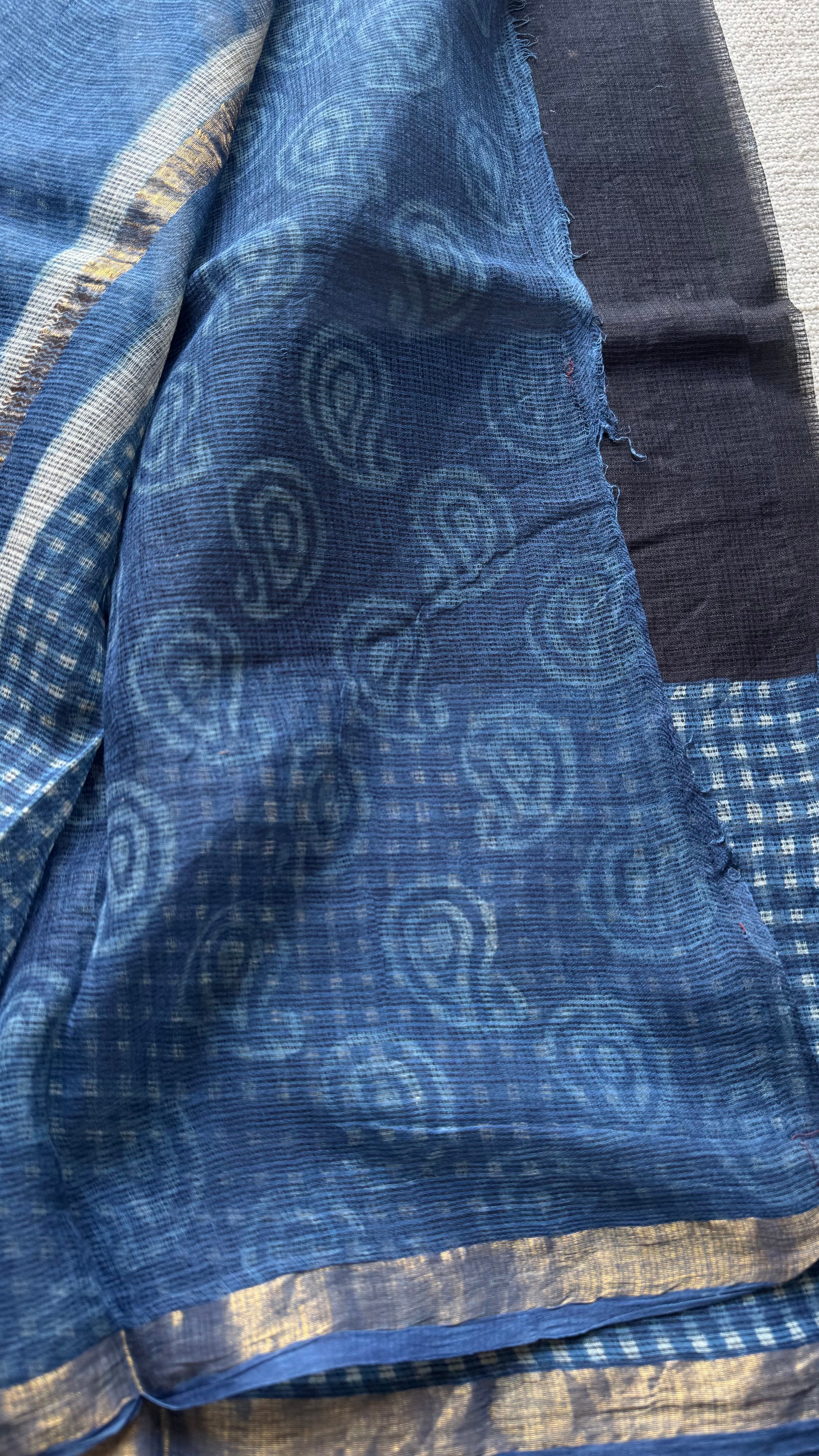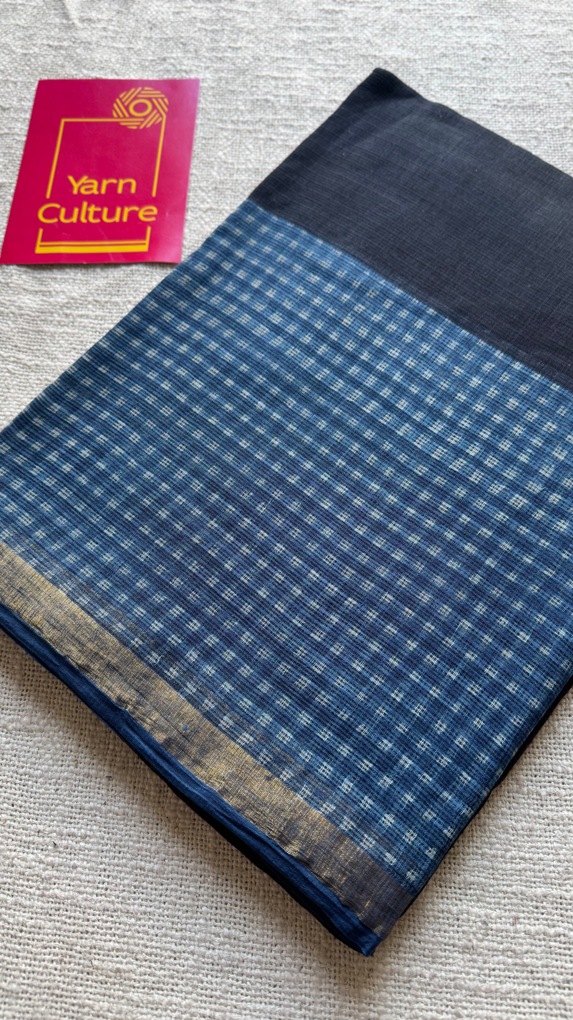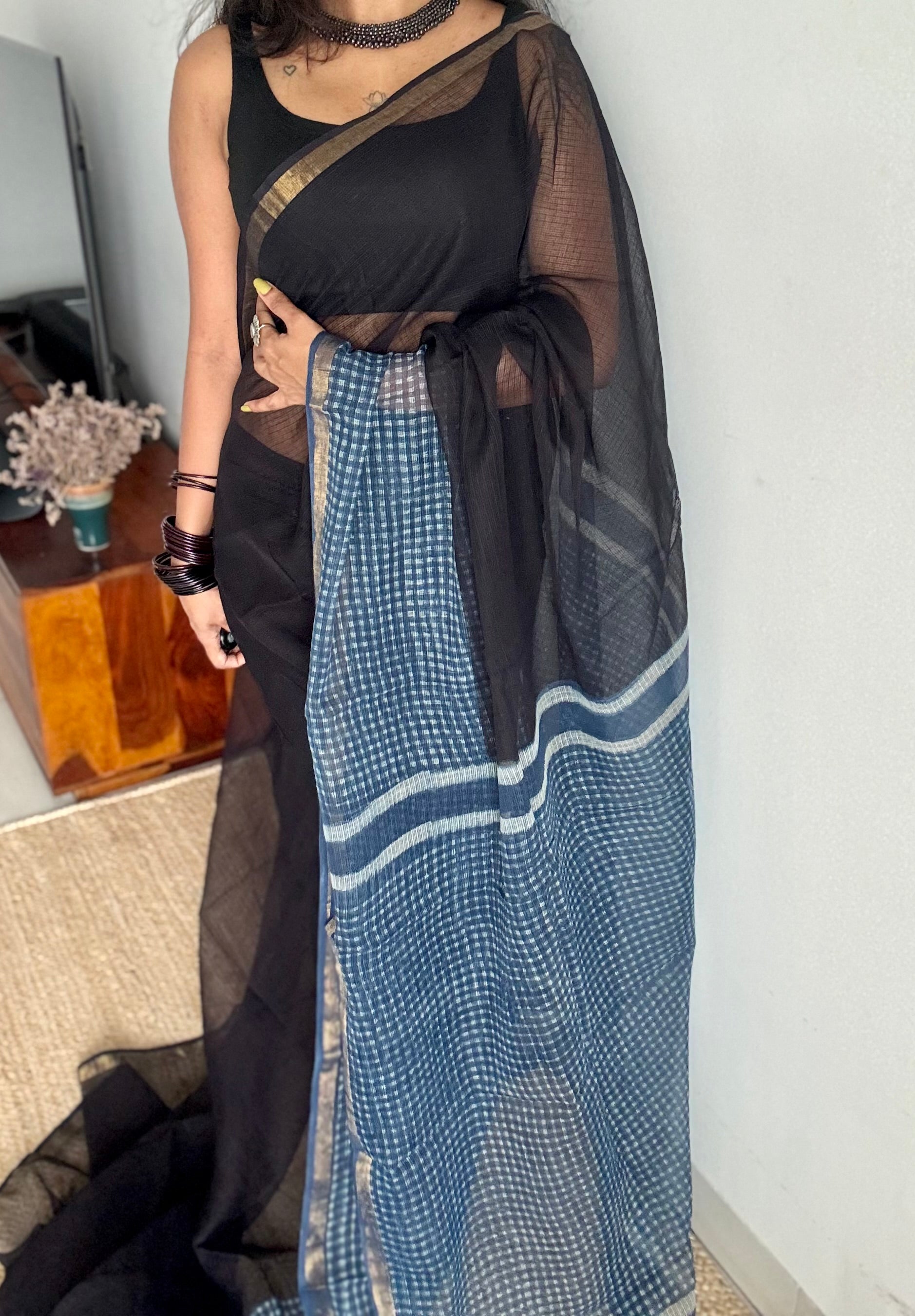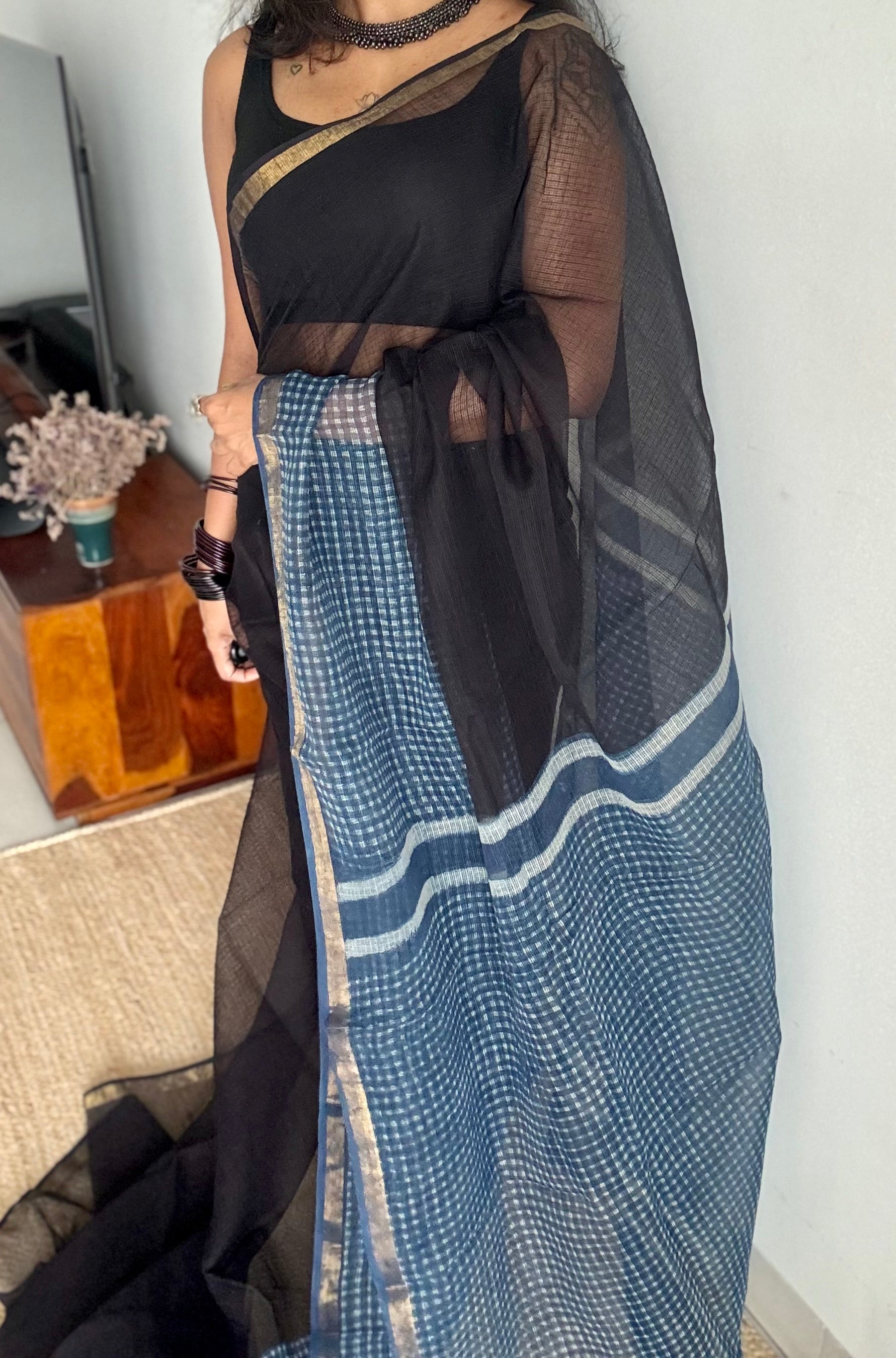 Black with indigo checks along the border and pallu, Raatrang carries the quiet rhythm of twilight, grounded, graceful, and effortless. A saree that mirrors the calm strength of the night sky in every thread.