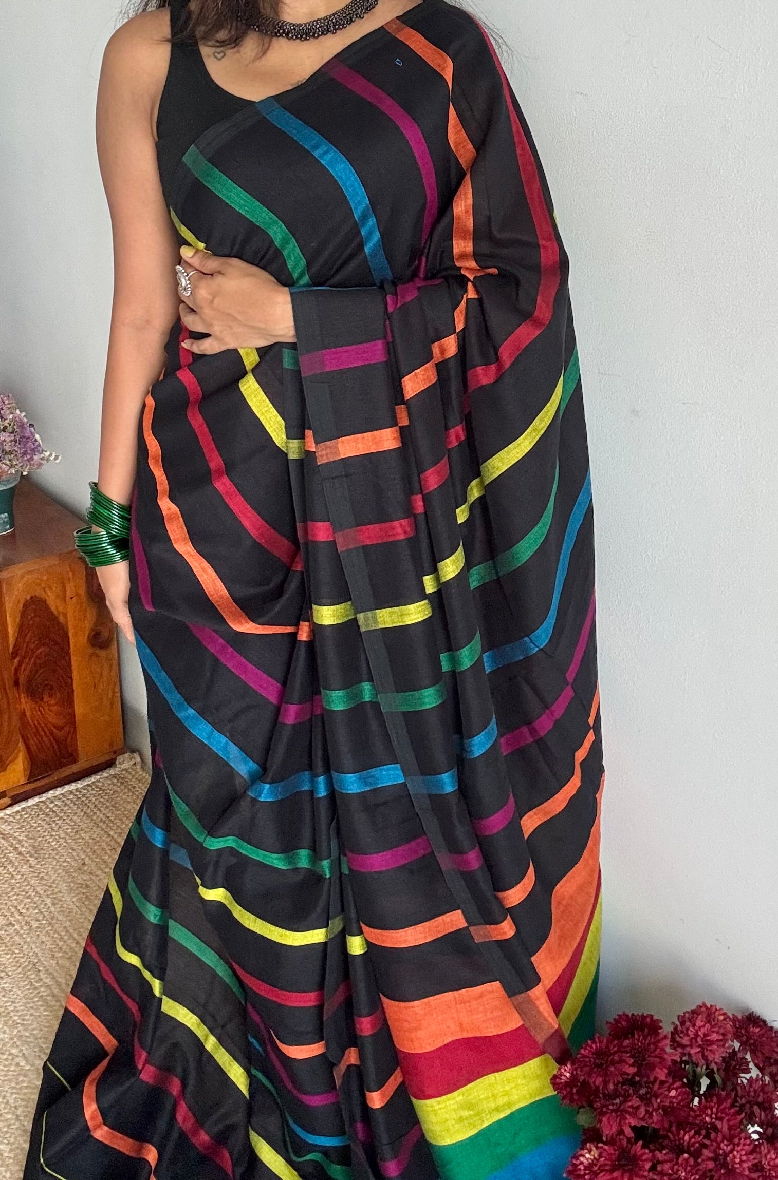 bengal cotton saree, soft cotton saree, maheshwari zari border saree, soft cotton saree, lightweight cotton saree, breathable handloom cotton saree, traditional black saree, rainbow saree