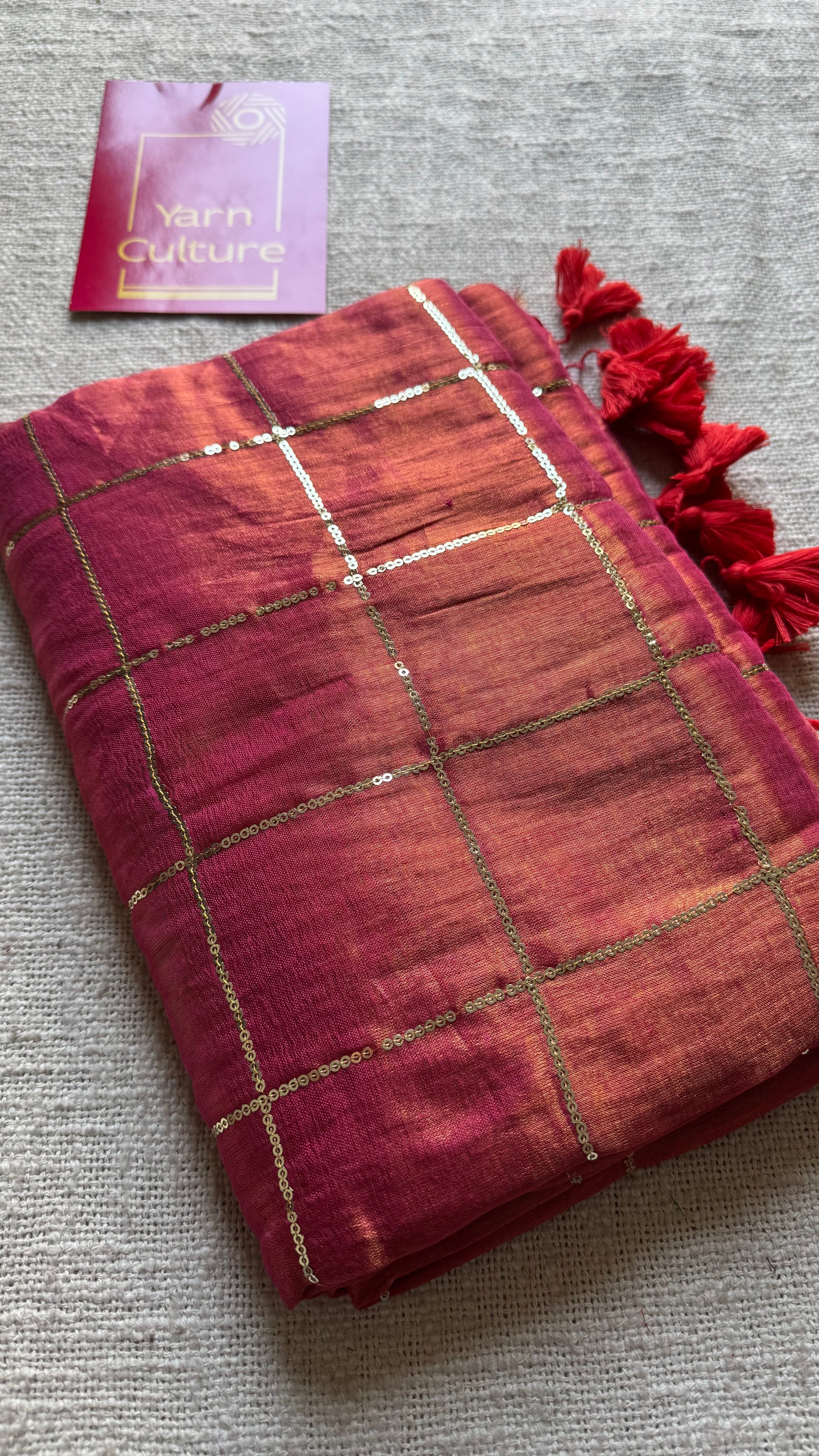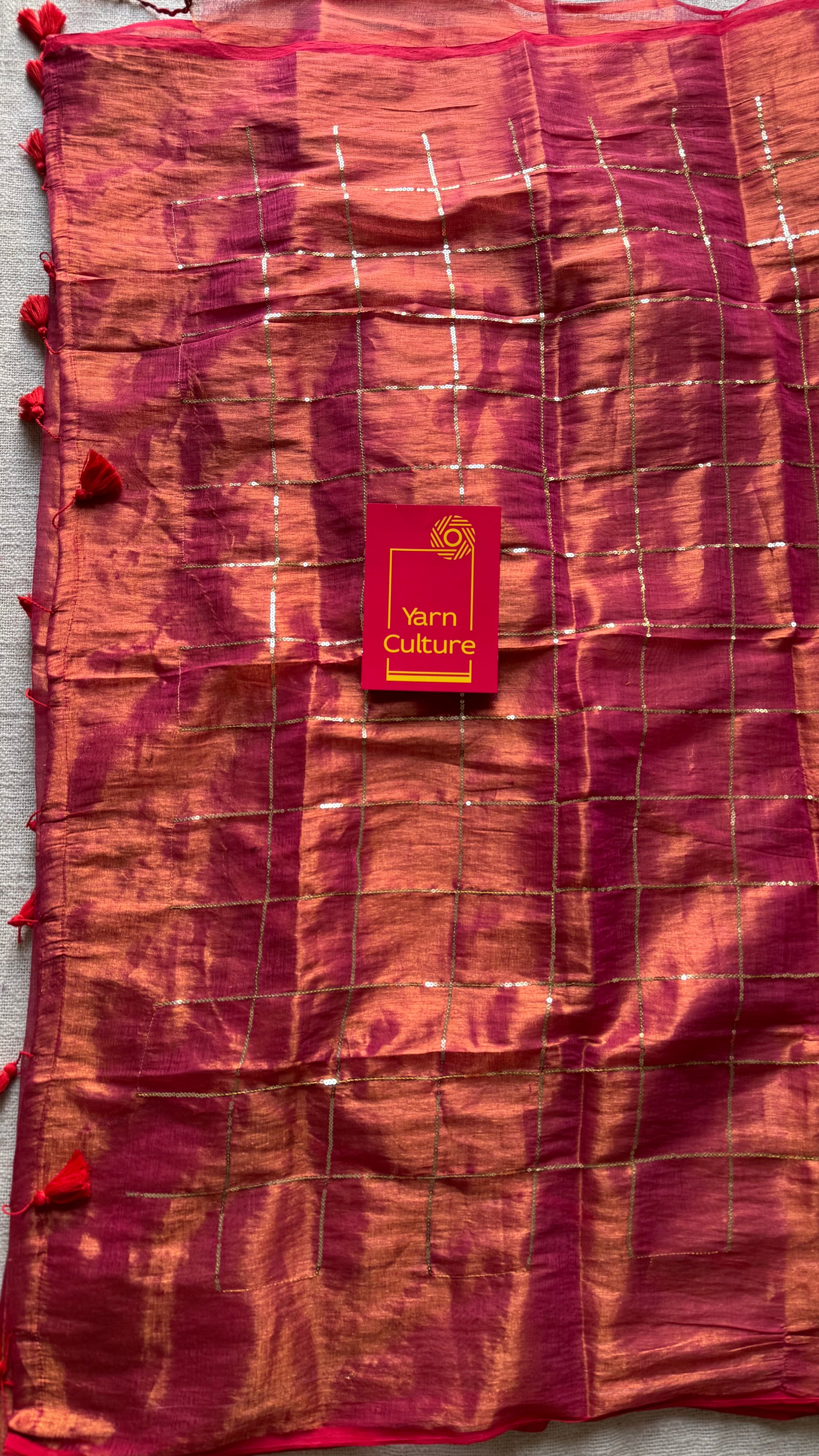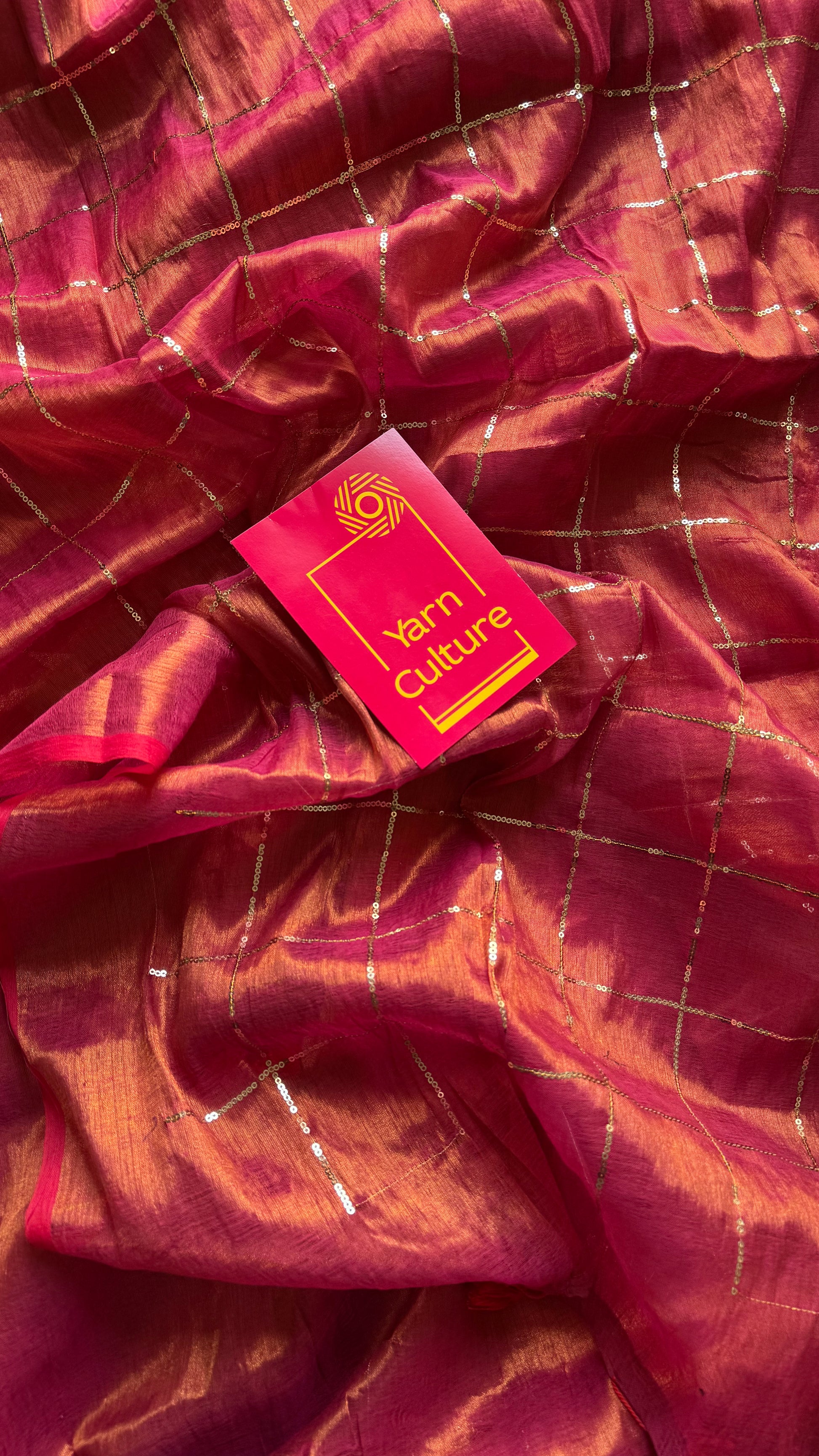Metallic mul tissue with checkered sequins work, soft, easy to drape, light weight, simple and elegant.