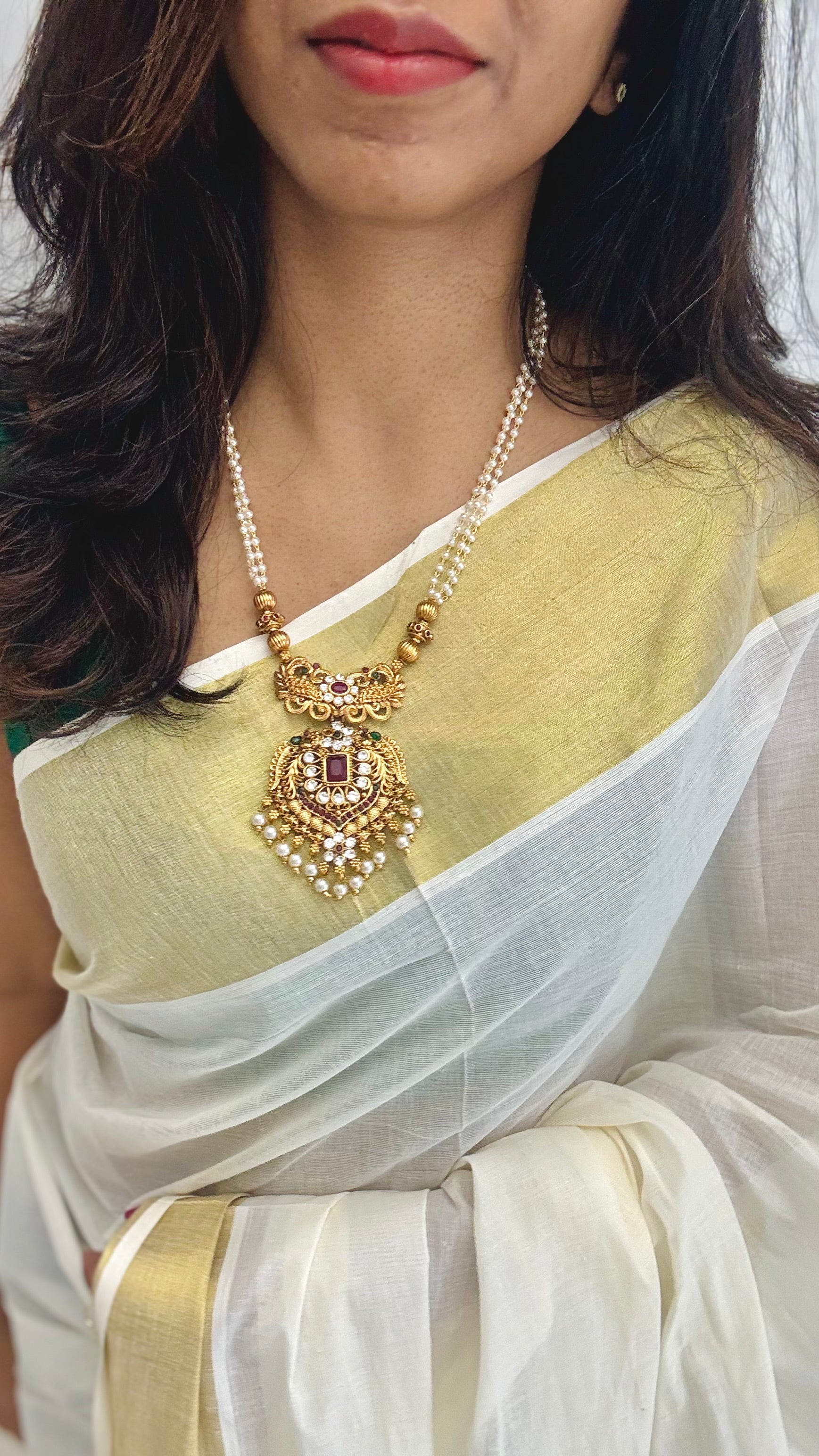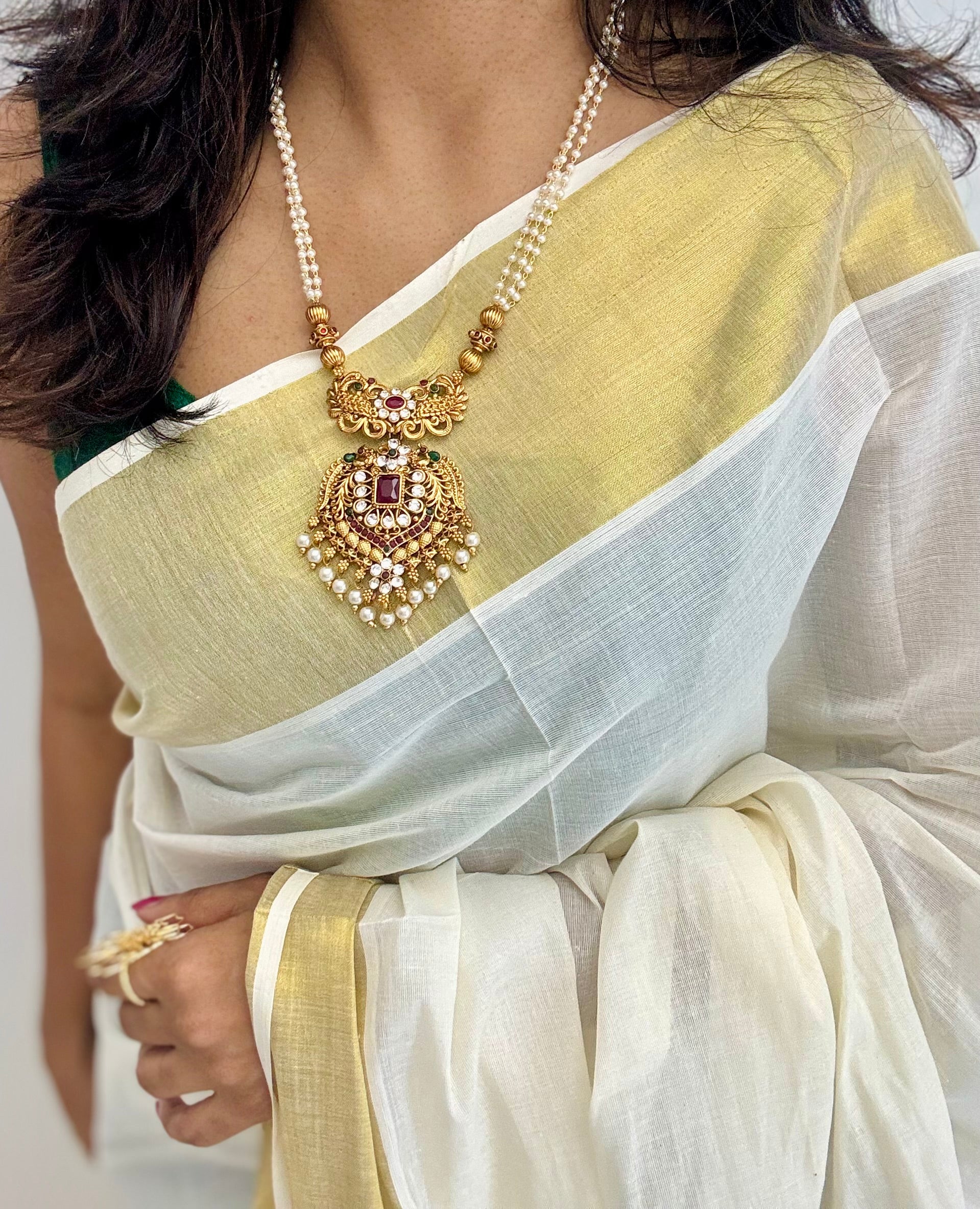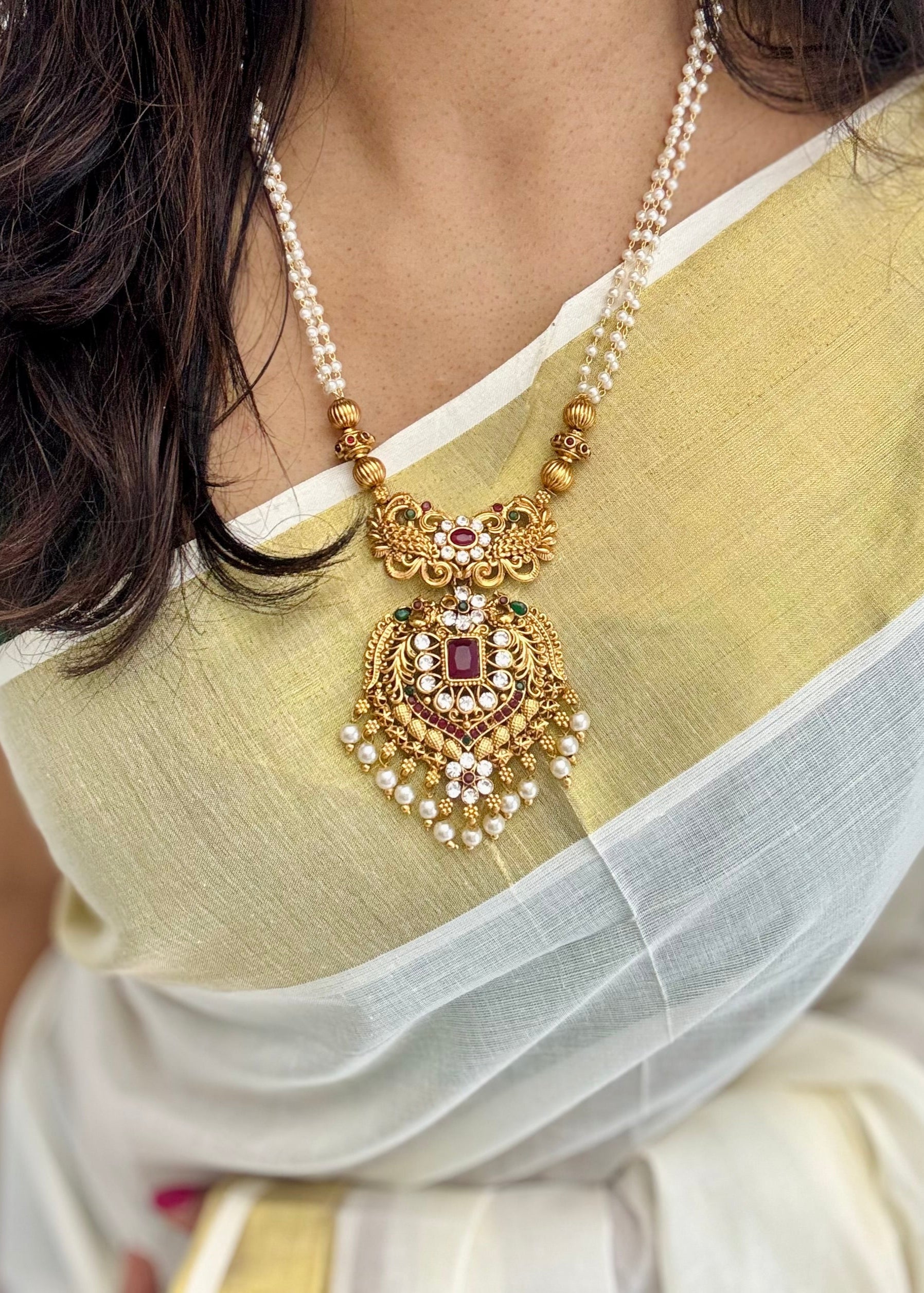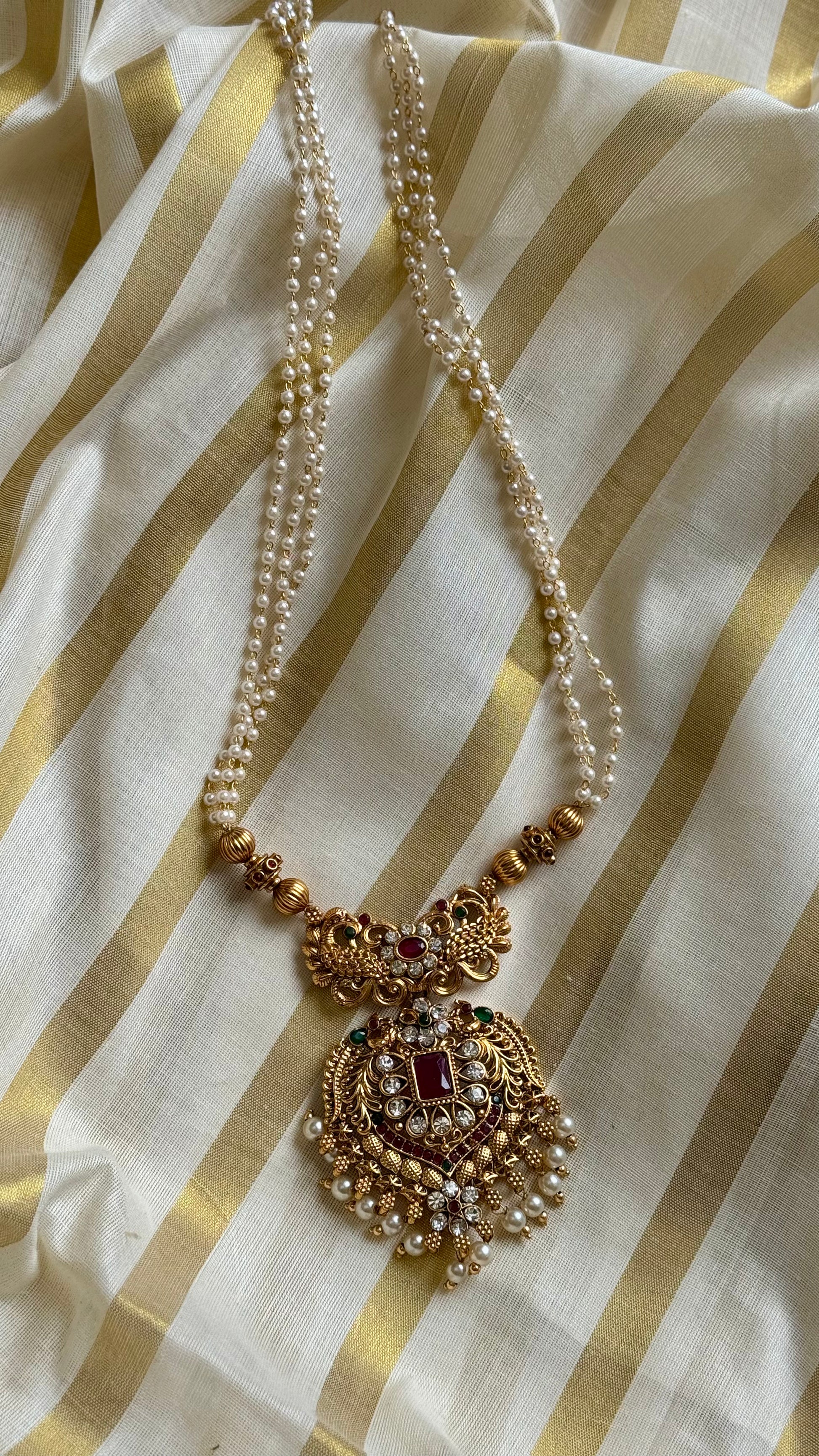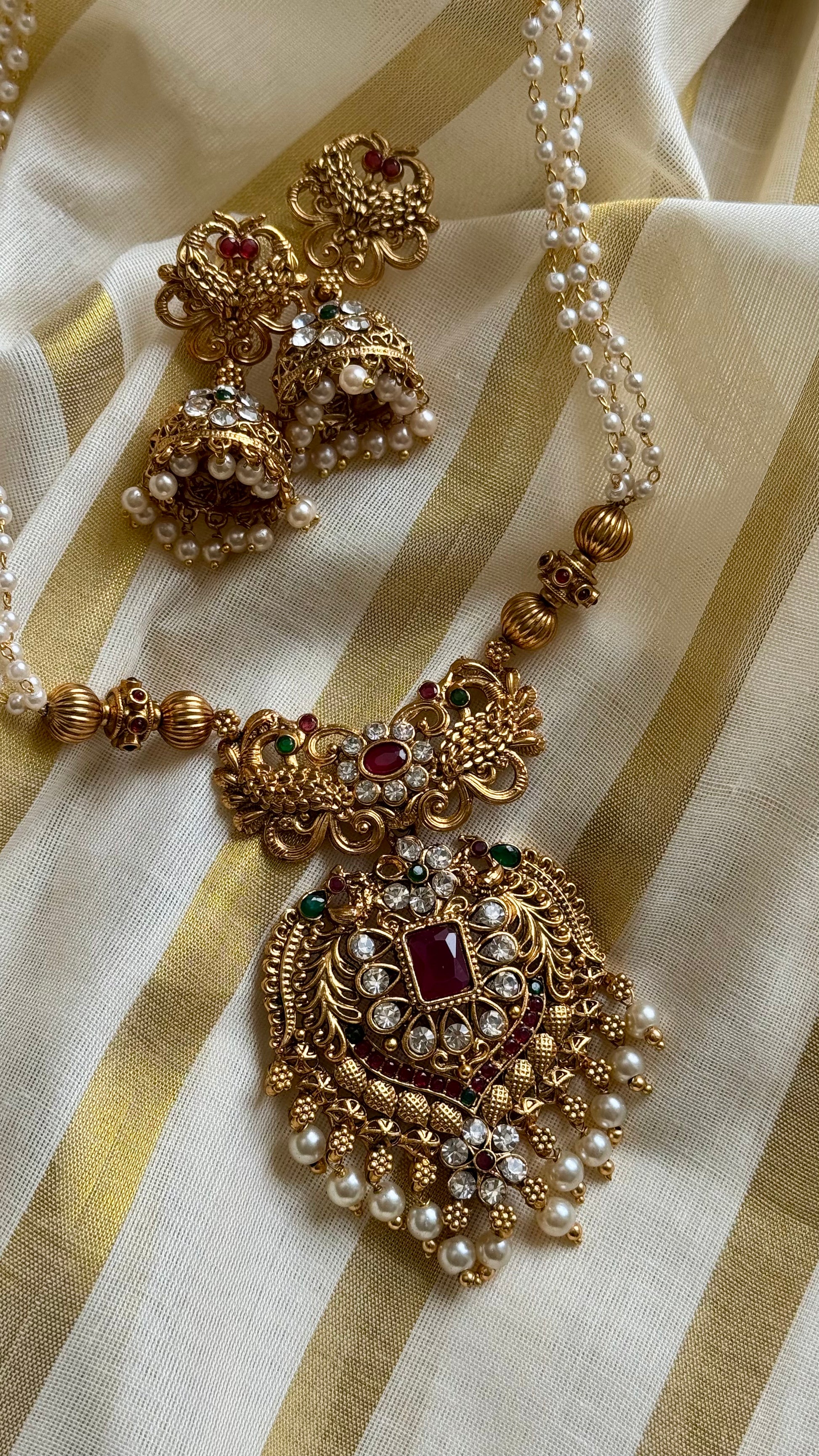 Red green stone big pendant, pearl beaded long neckpiece and jhumka. Perfect with all your ethnic attire.