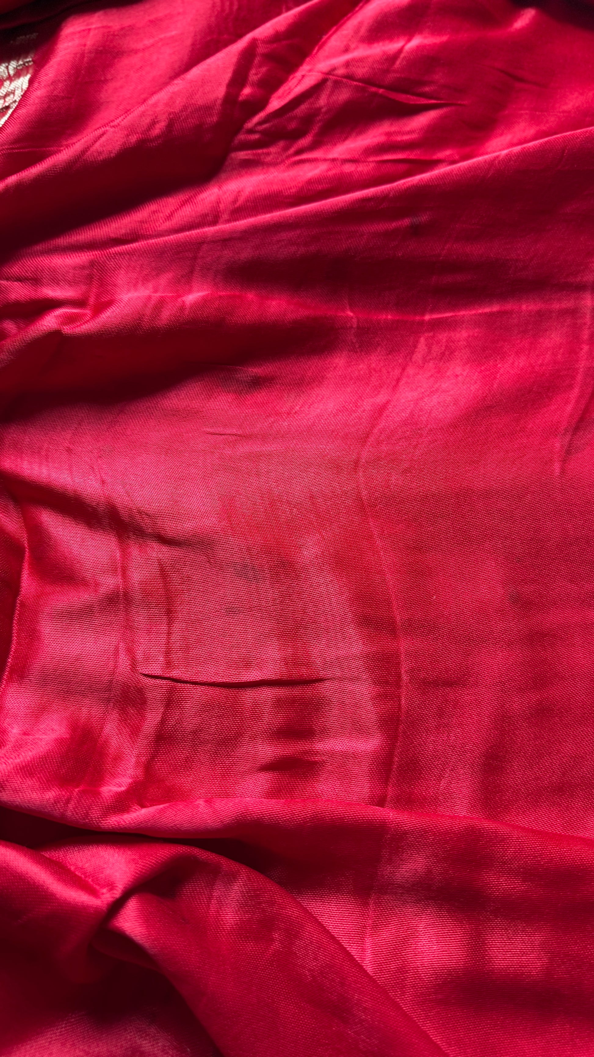 Red Modal Silk with Lagadi patta (gold pallu). Please note bandhej sarees are dyed, there will be colour smudges. And only dry wash since colour may bleed in the first wash and threads are delicate. Effortless to drape, light to carry, and rich in look, this is a saree made to shine with you this season.