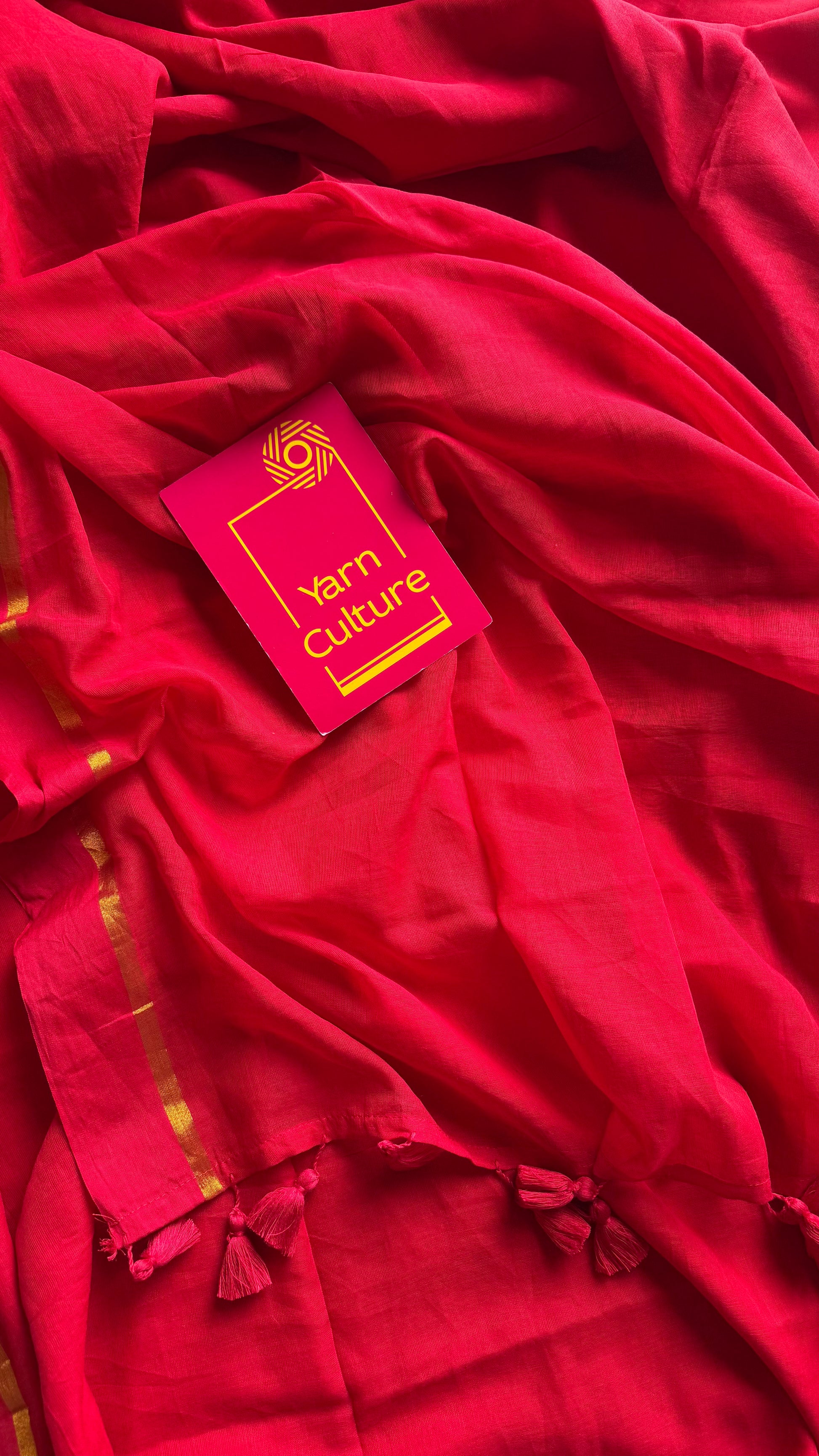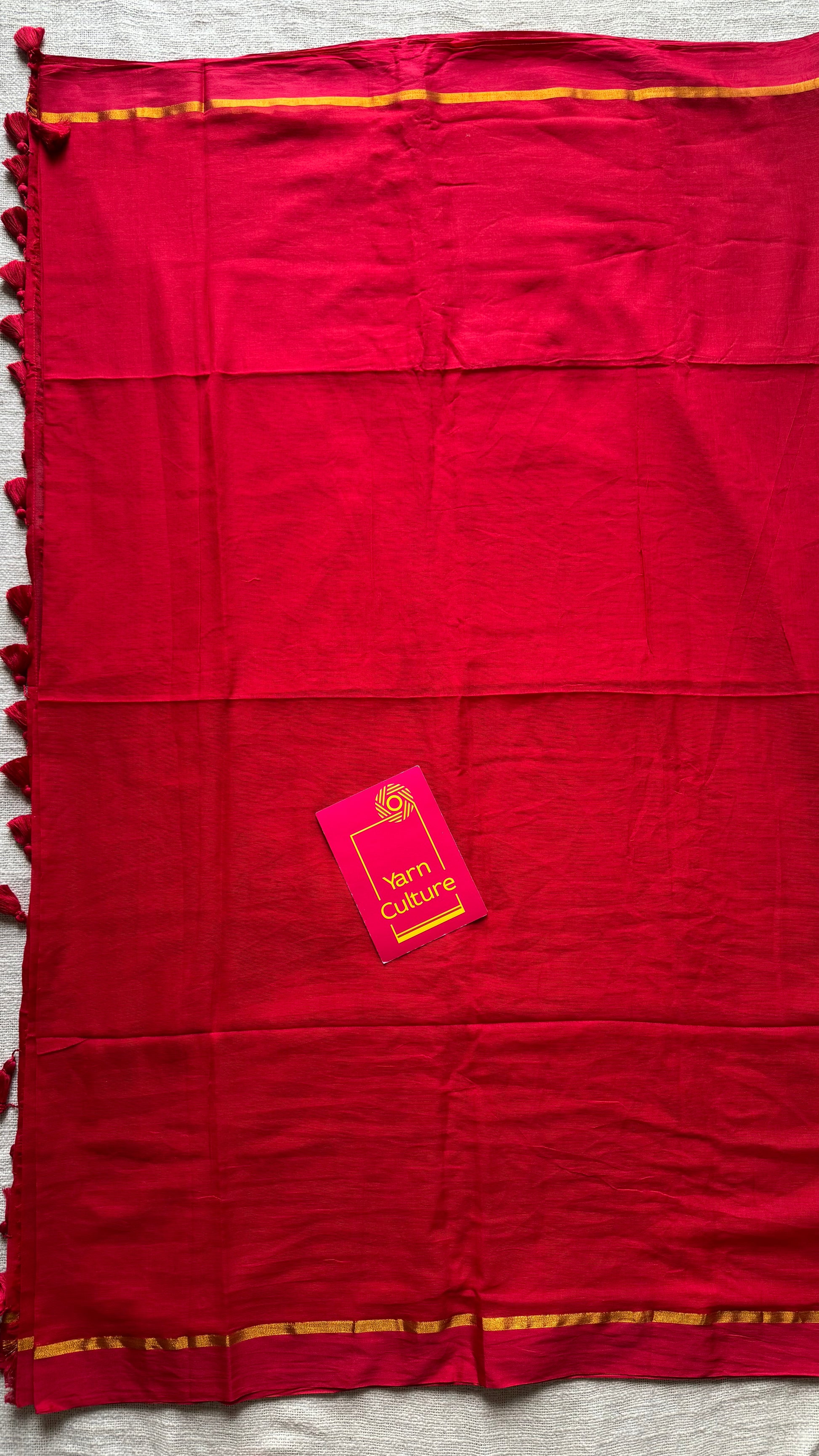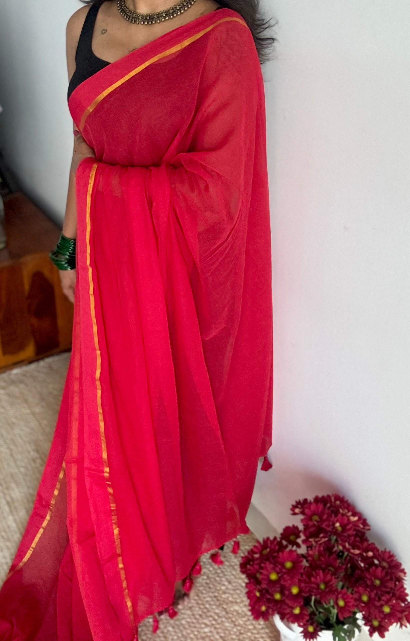 Everybody's favourite mul cotton in red with thin antique gold zari gap border and with tassels.