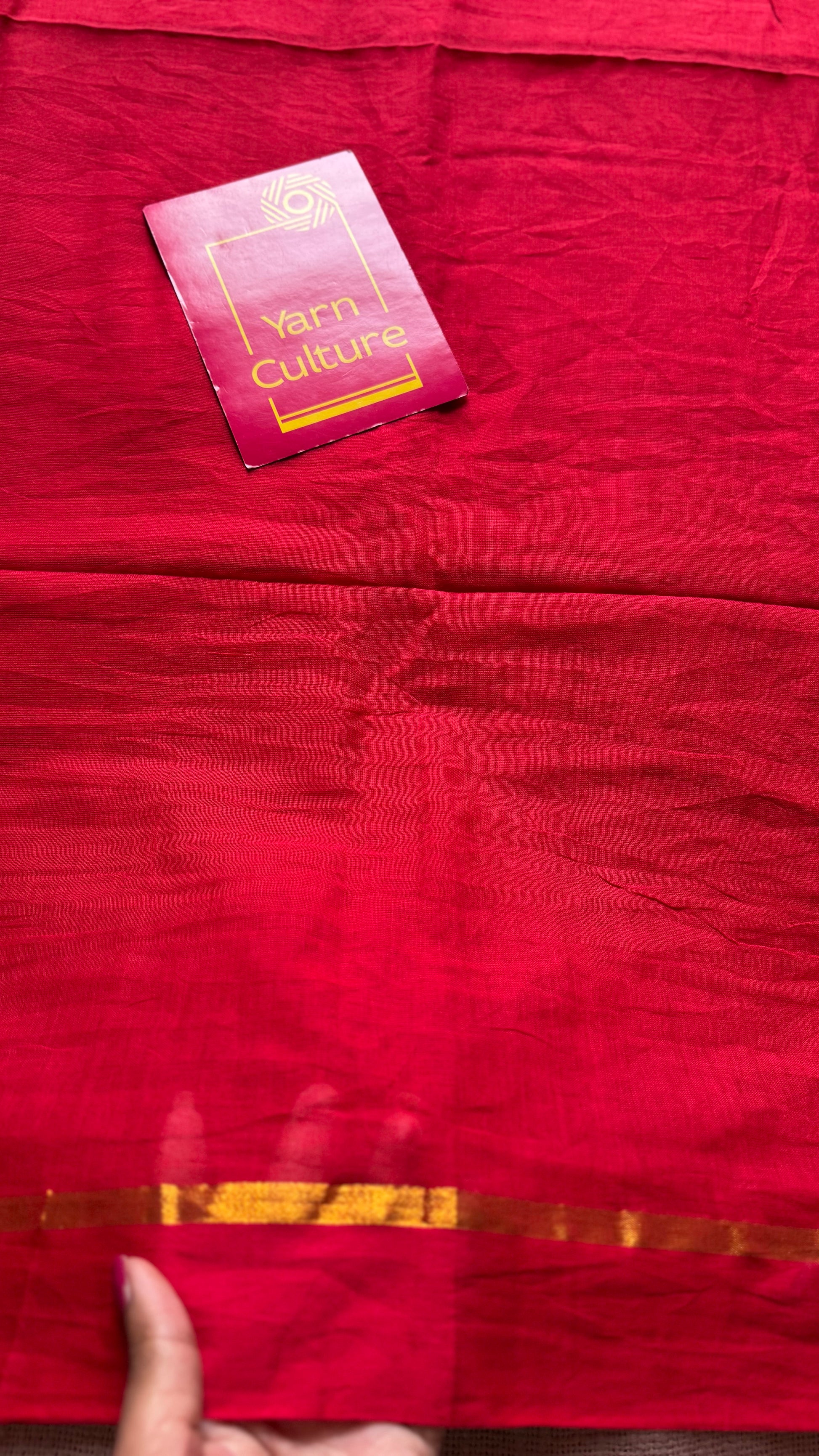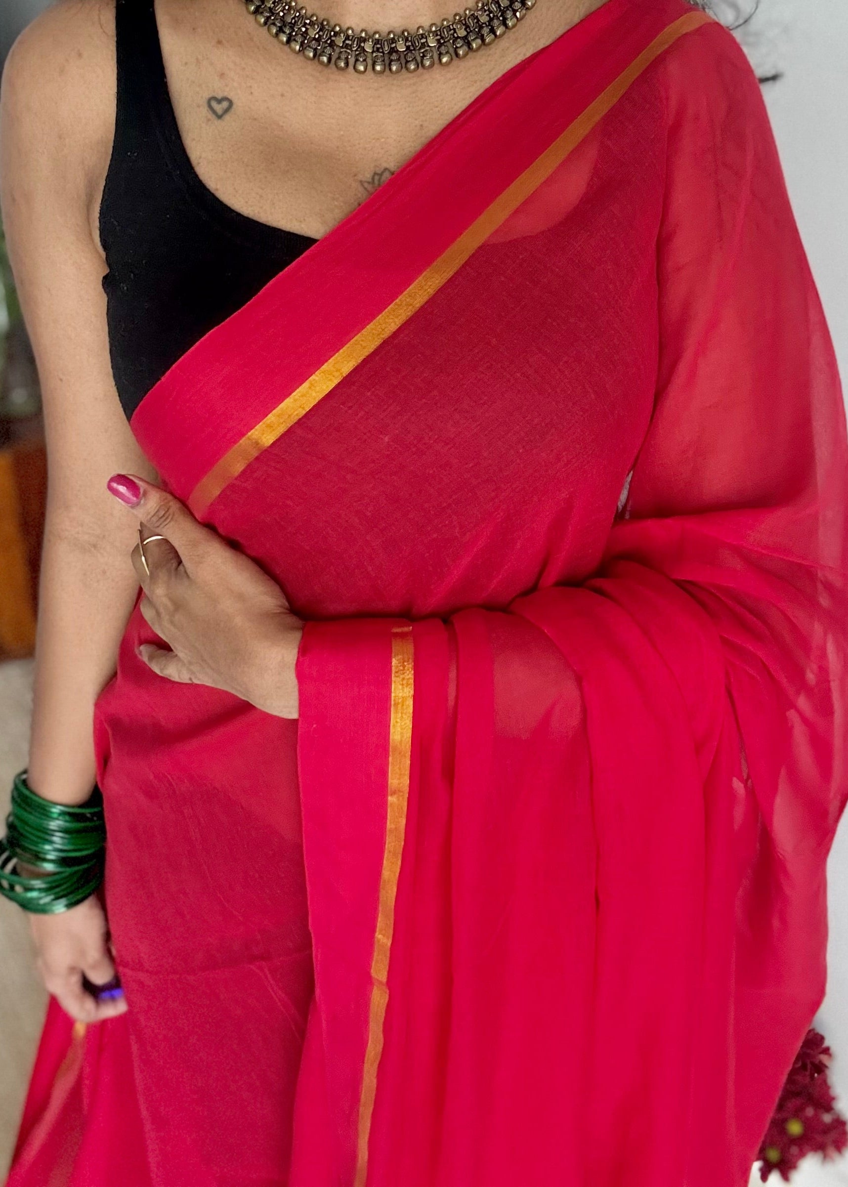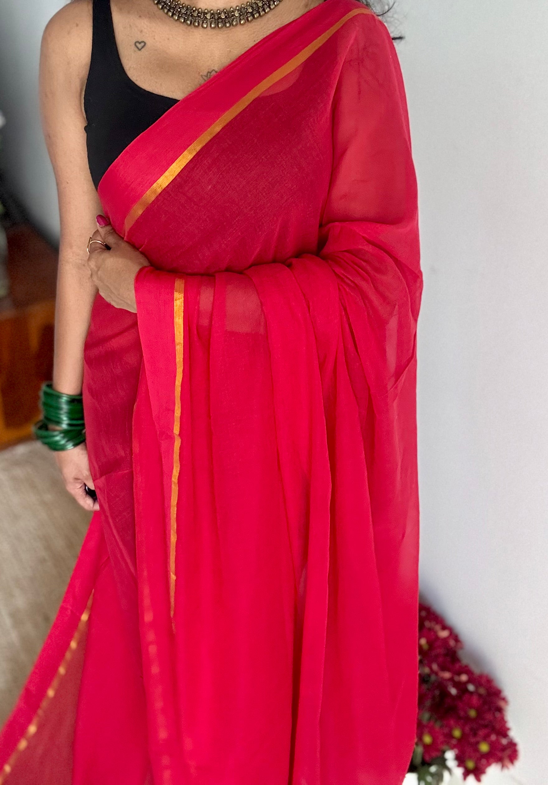 Everybody's favourite mul cotton in red with thin antique gold zari gap border and with tassels.