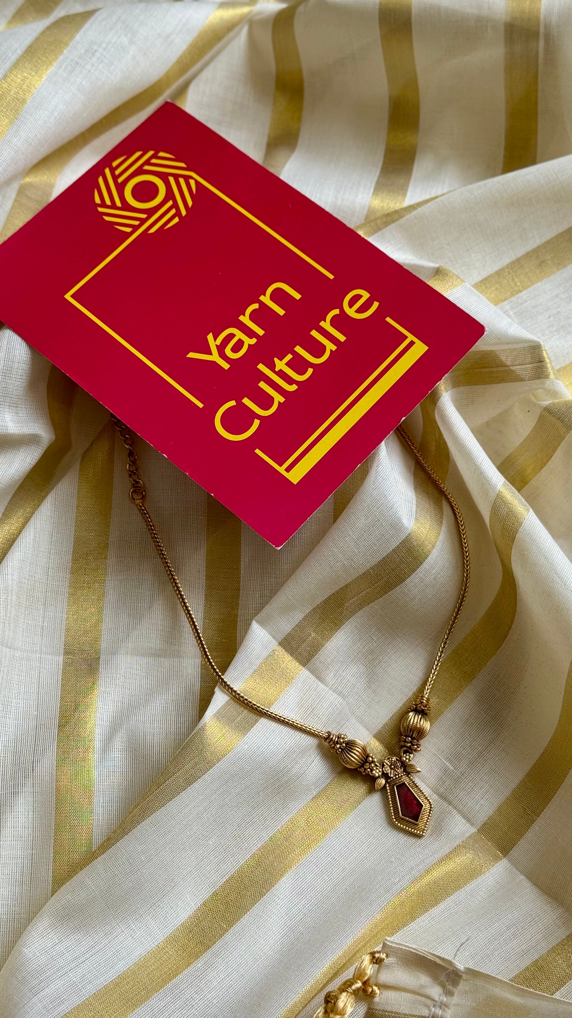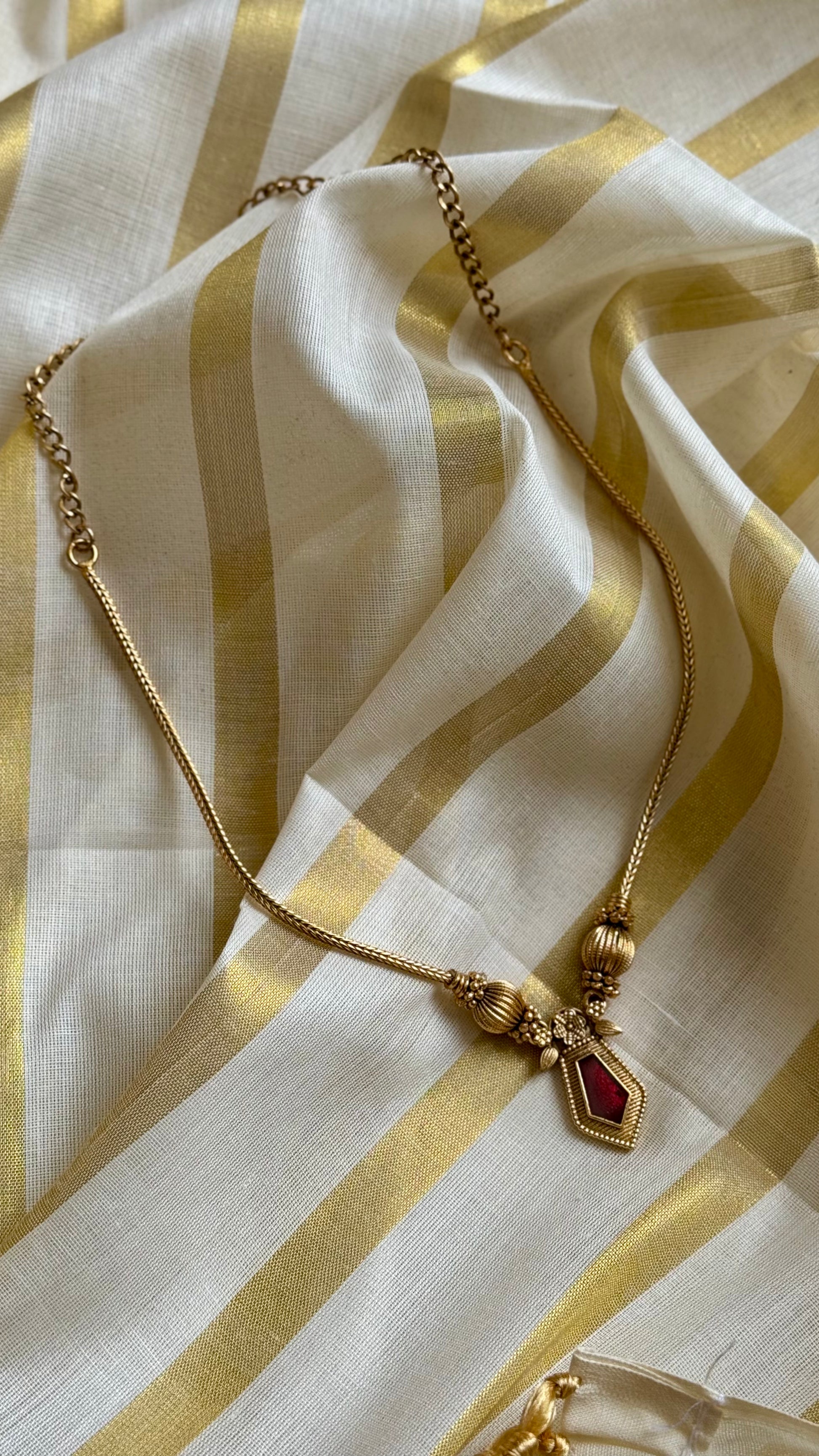 A bold red pendant on an antique gold chain. Classic and perfect to pair with your Onam sarees.