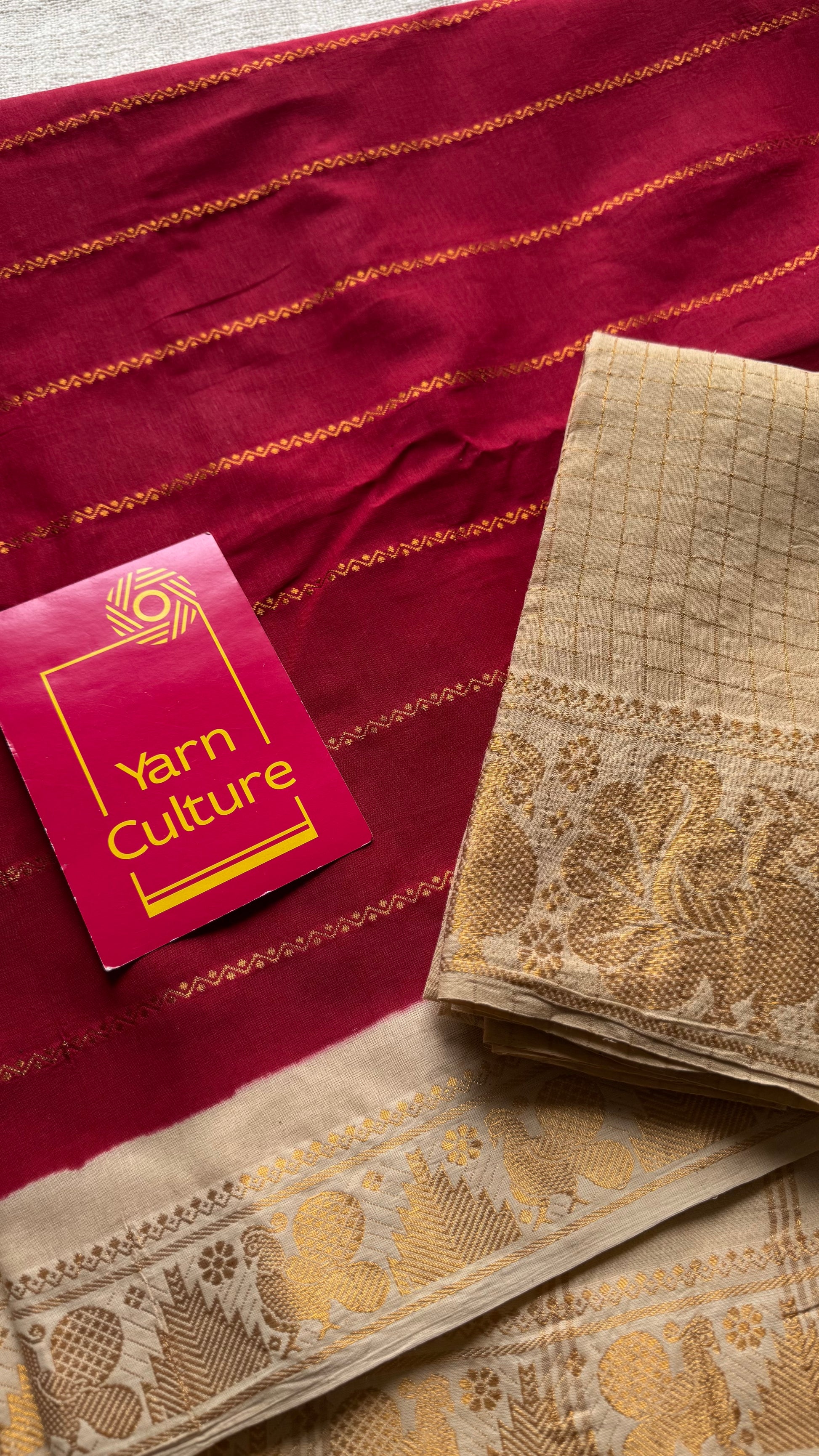 Red with cream veldhaari, kattuchayam dyed, madurai cotton - YCCOTNSEMS91
