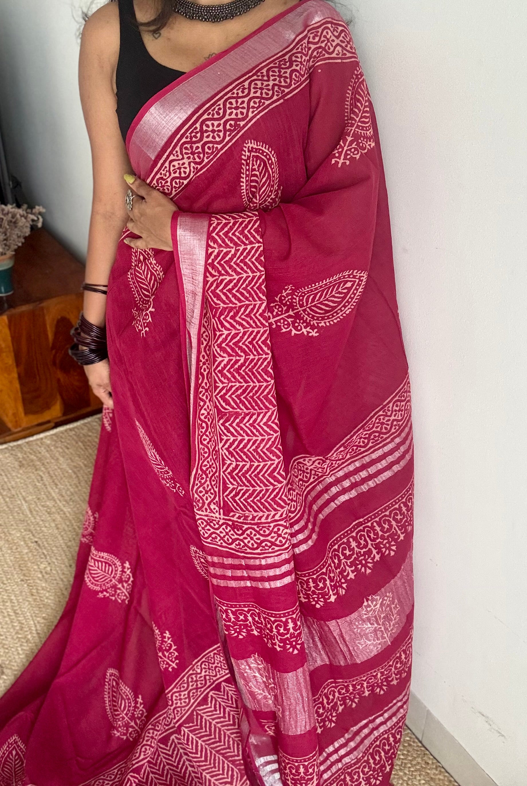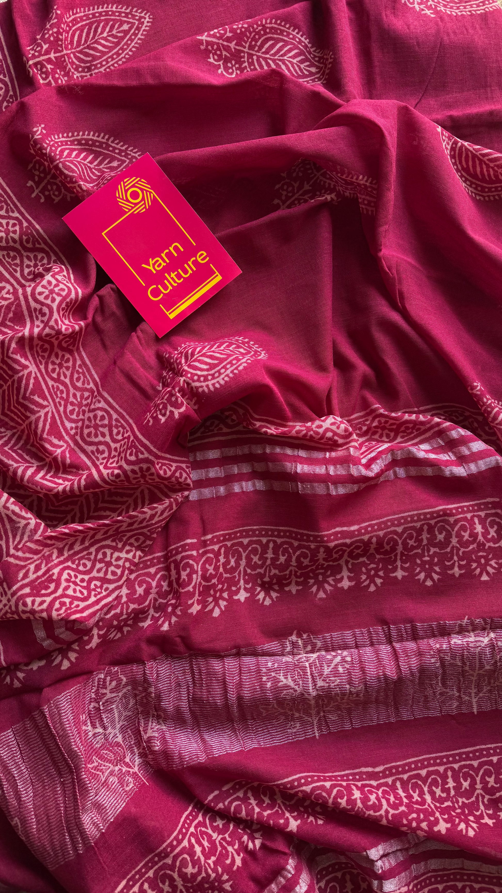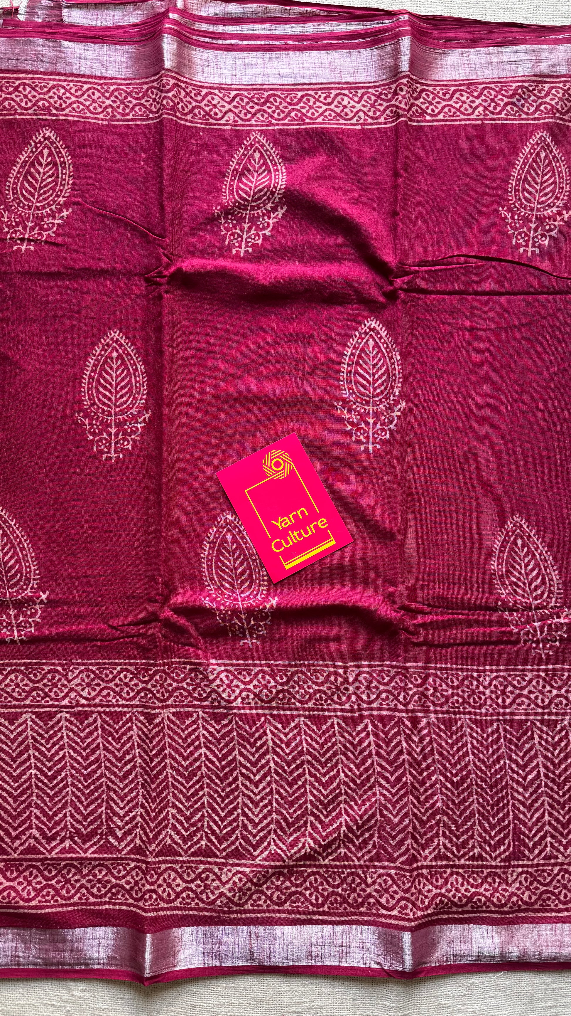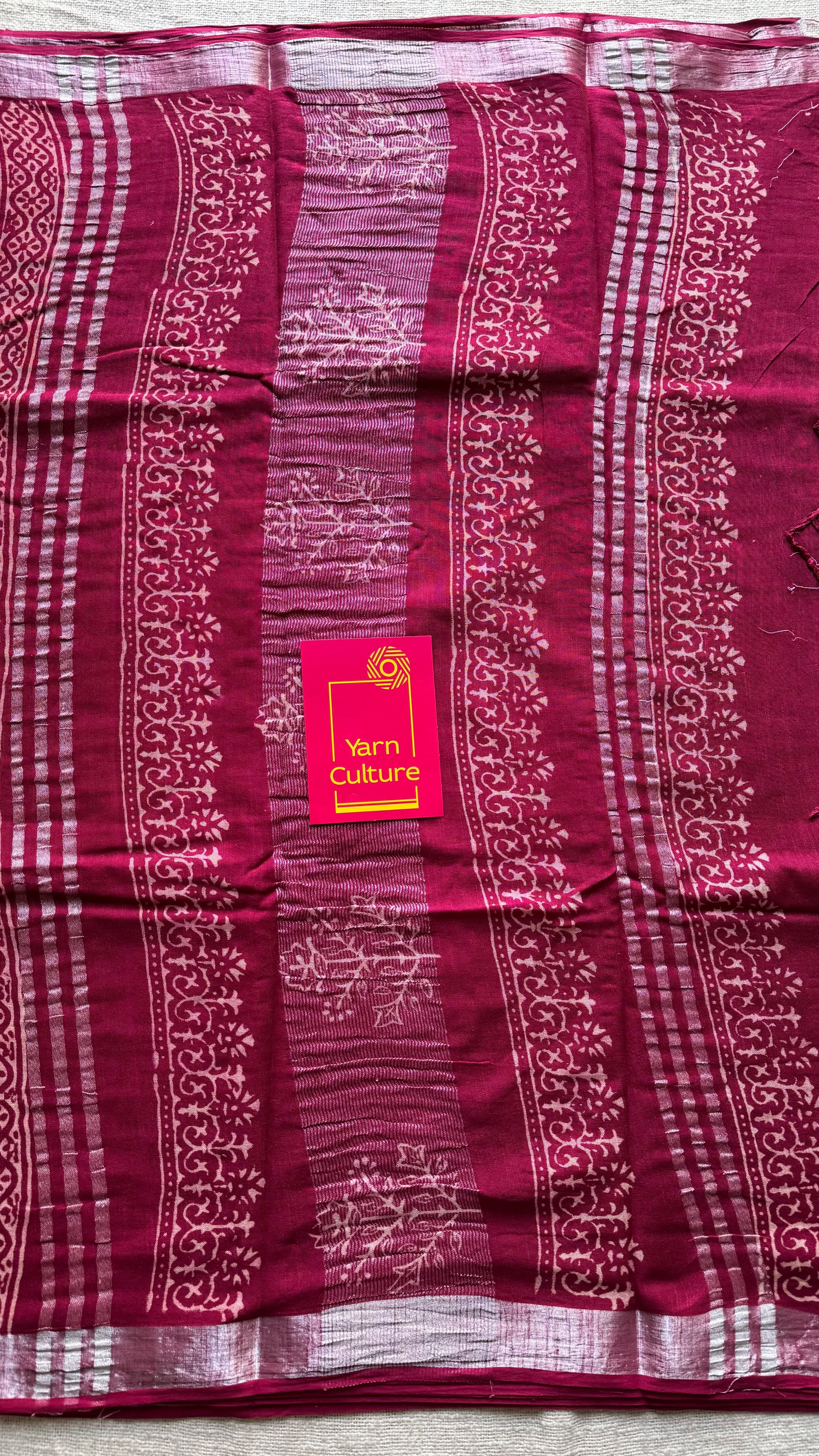 Cranberry red linen, white motif, silver zari border - YCTOROCBP60