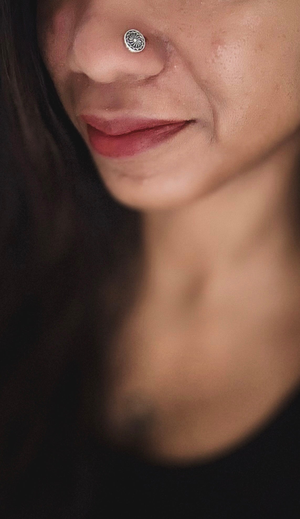 Round nose pin, intricate pattern in silver, perfect for the everyday look. Face reference is to understand the proportion, refer to the product image for exact colour.