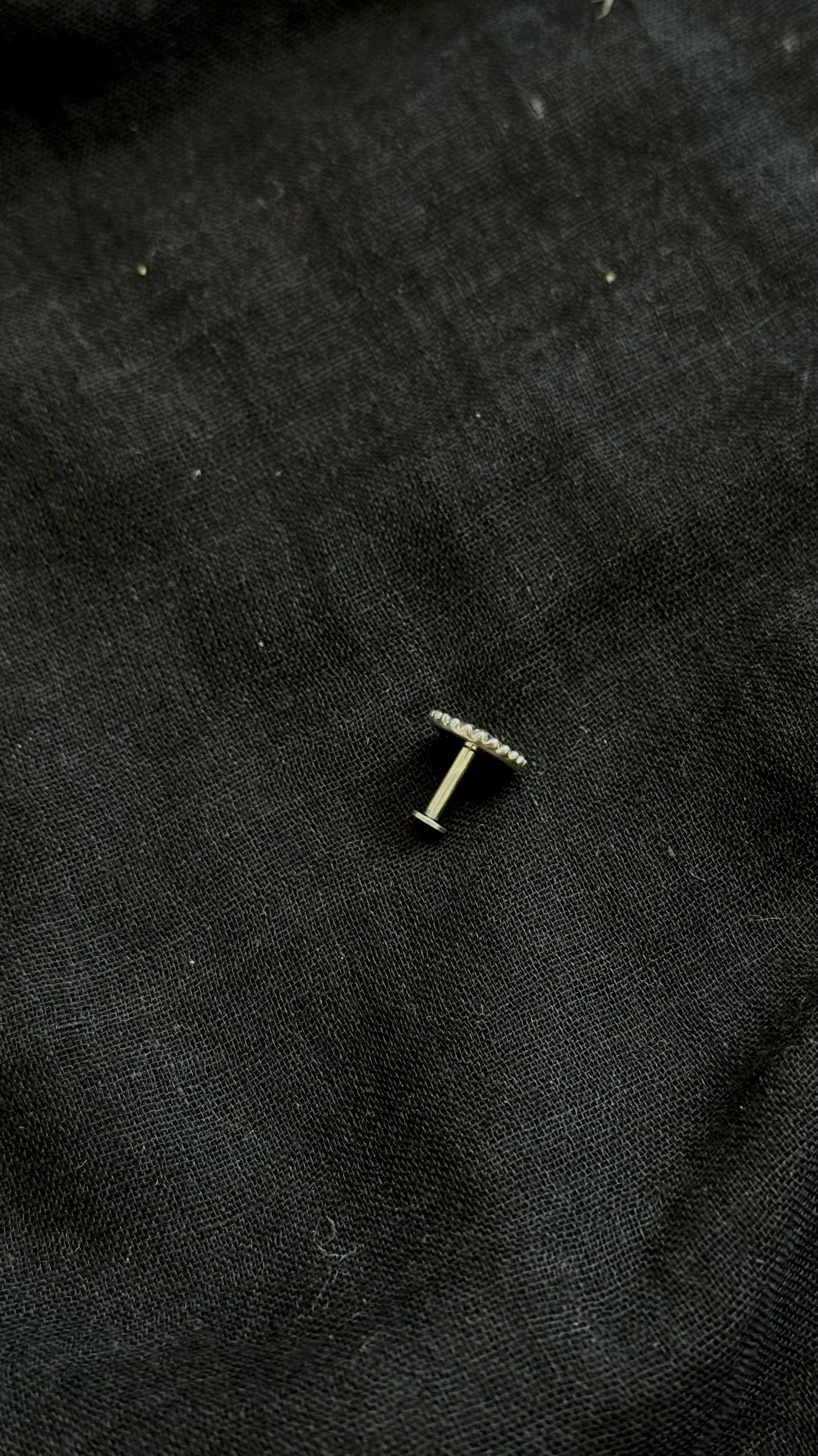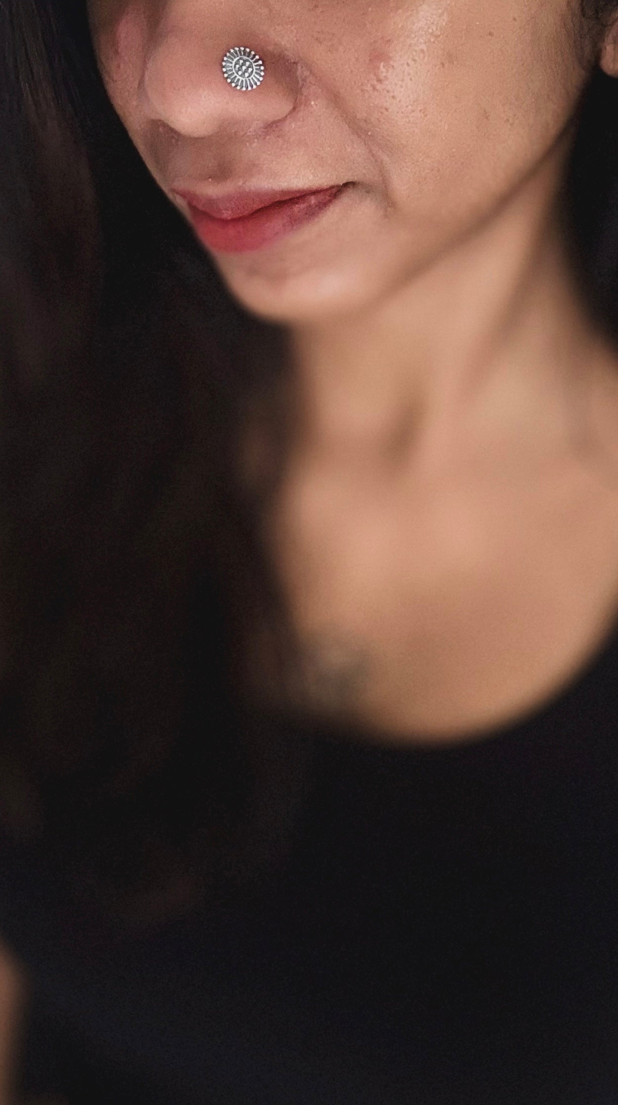 Round nose pin, intricate pattern in silver, perfect for the everyday look. Face reference is to understand the proportion, refer to the product image for exact colour.